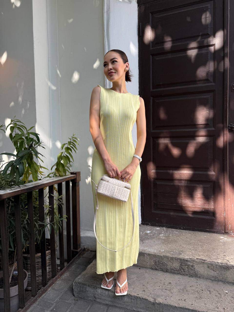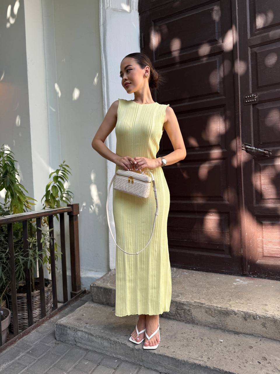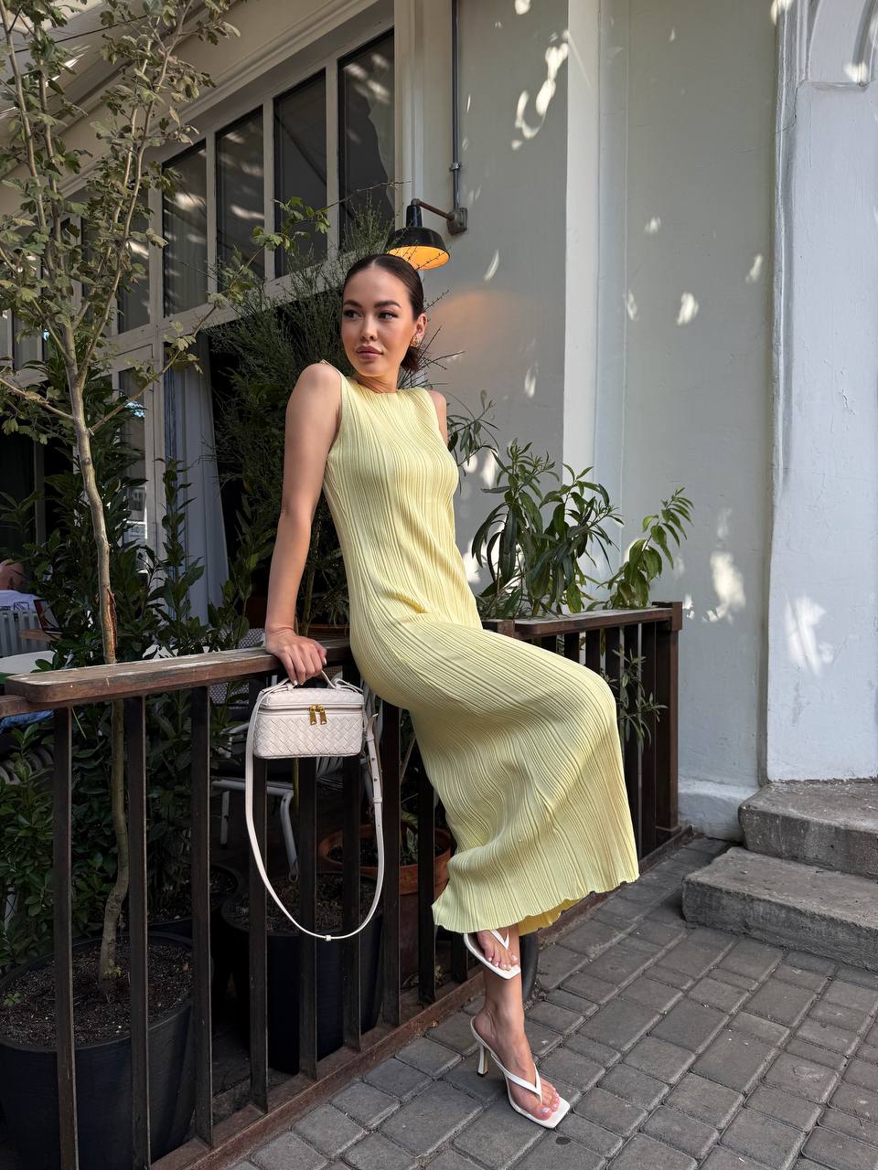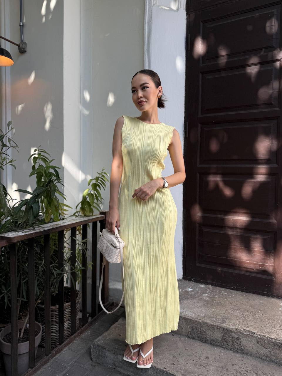 Жіноча Довга Жовта Сукня Максі без Рукавів у Фактурну Смужку