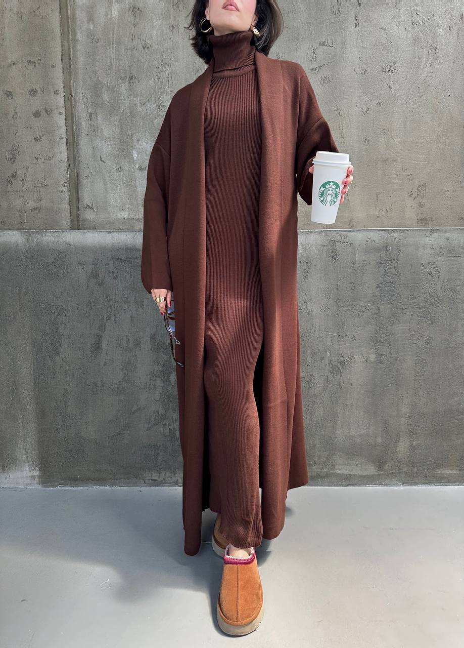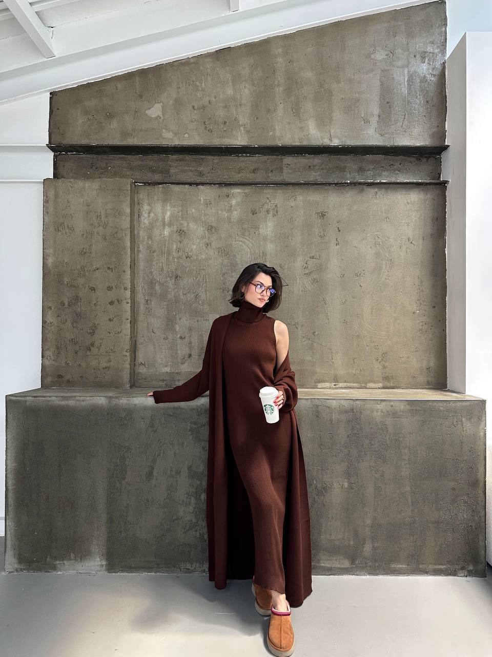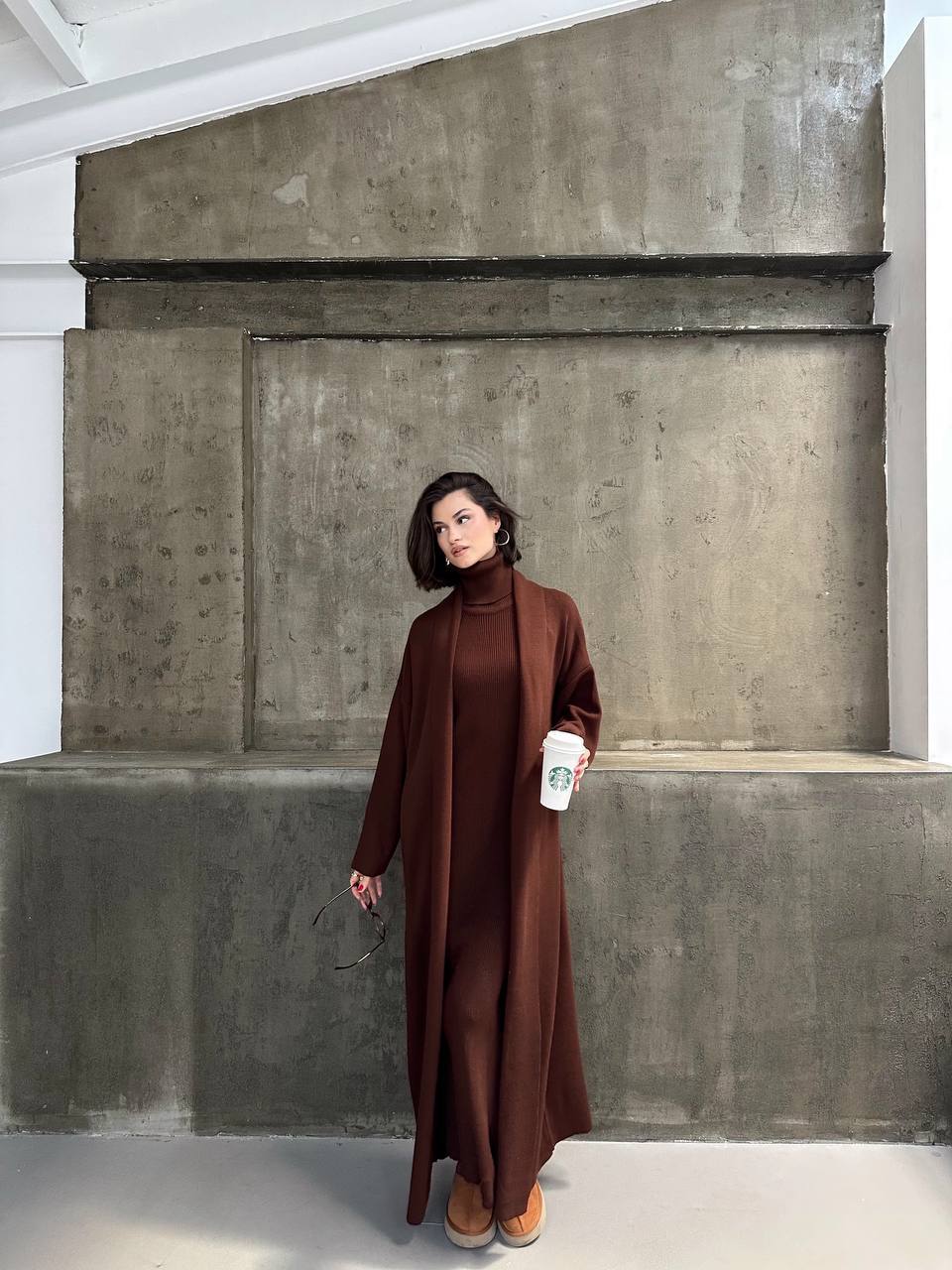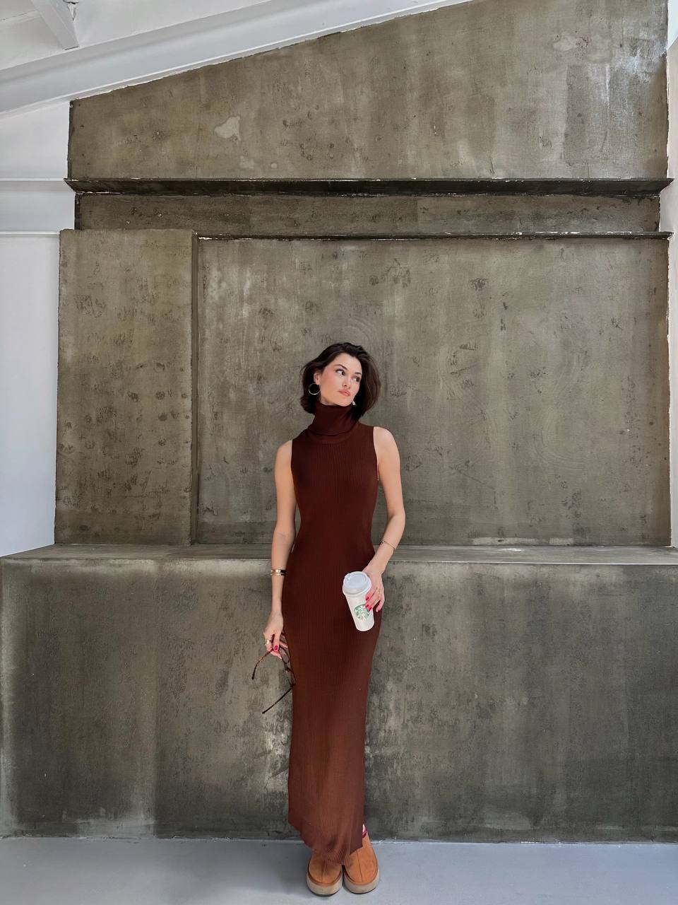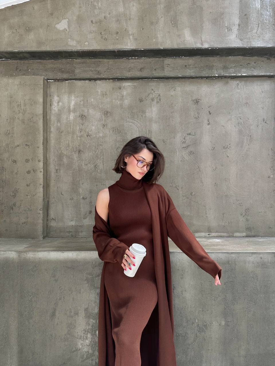 Жіноча Коричнева Сукня Максі в Рубчик без Рукавів з Високим Коміром + Довгий Кардиган (Комплект)