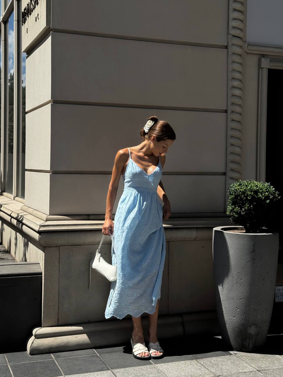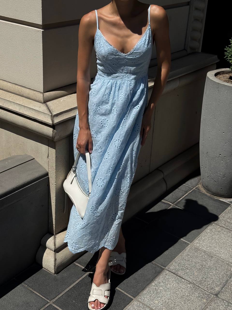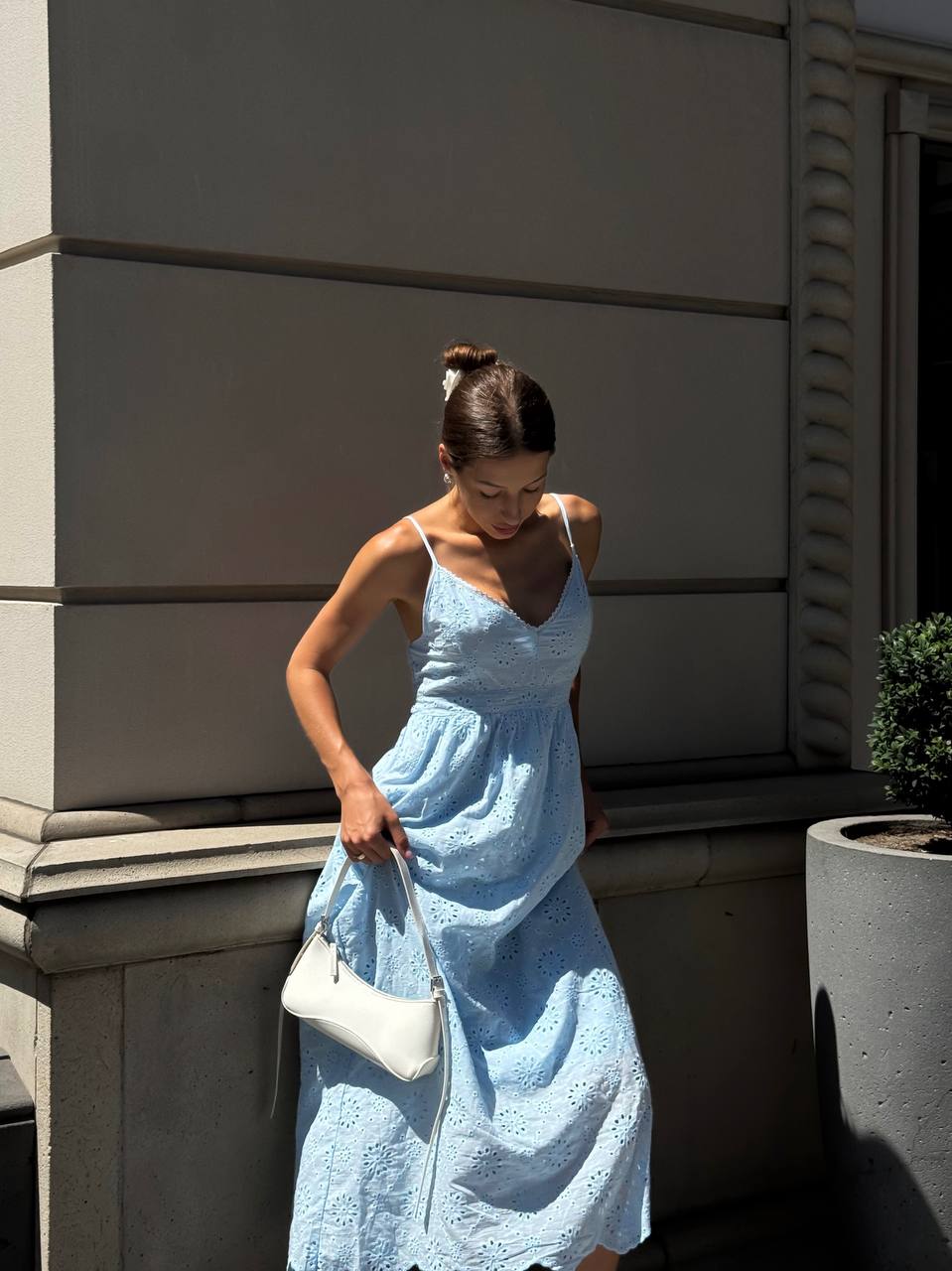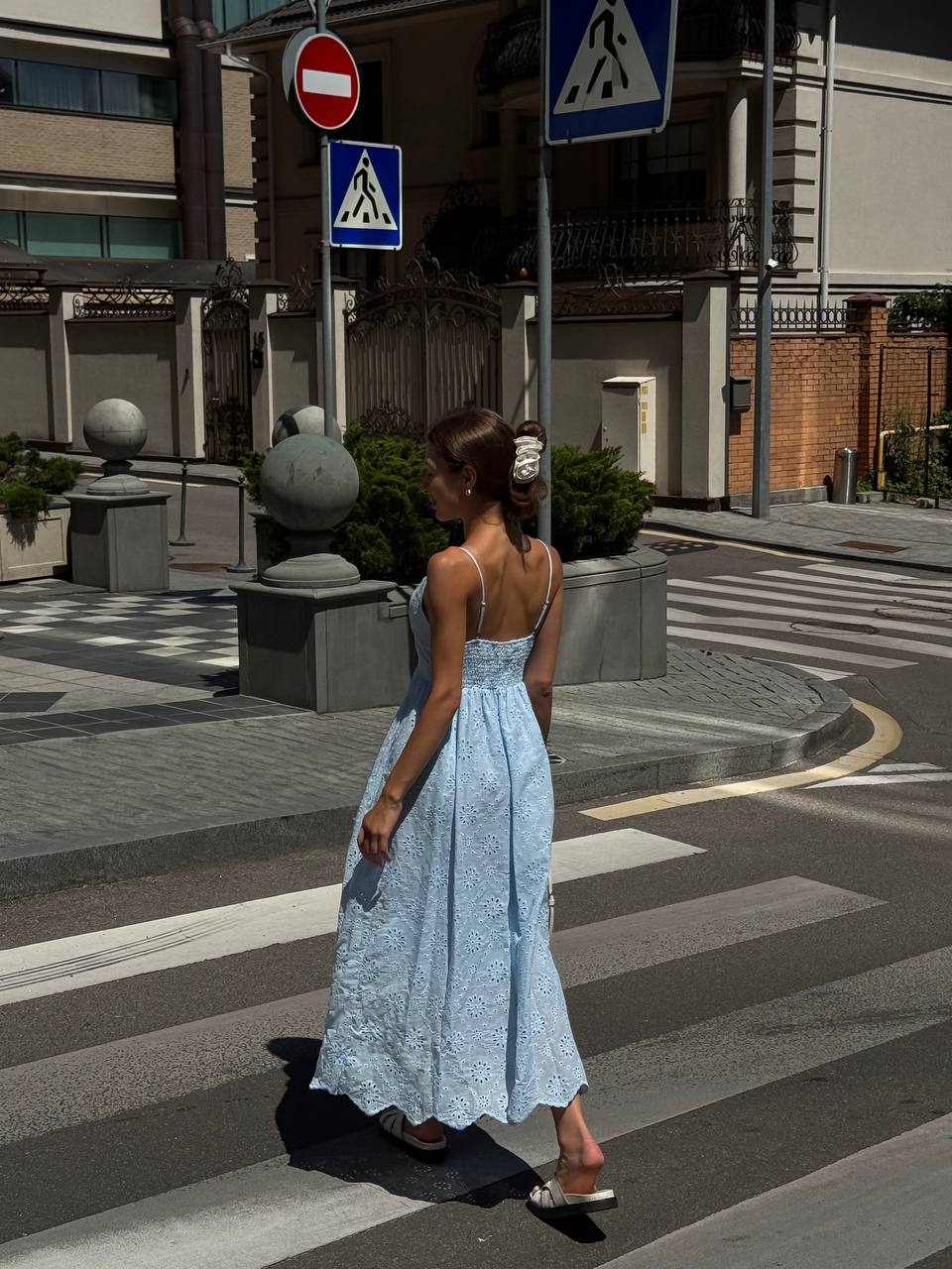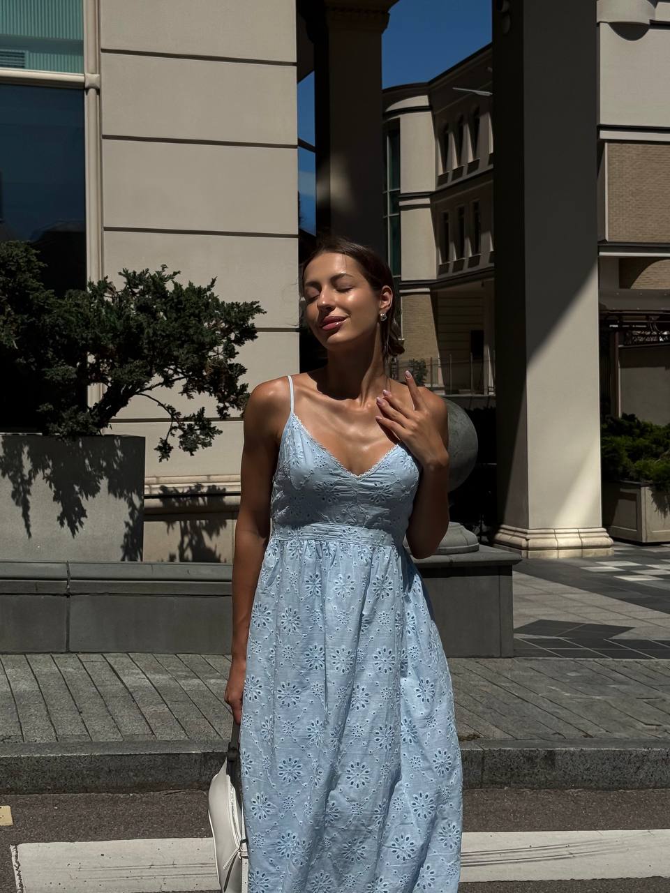Жіноча Літня Блакитна Сукня Міді з Прошви на Тонких Бретелях з V-вирізом Декольте