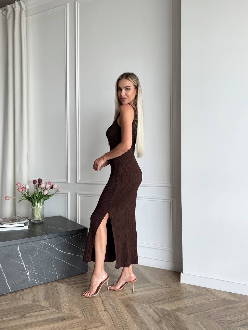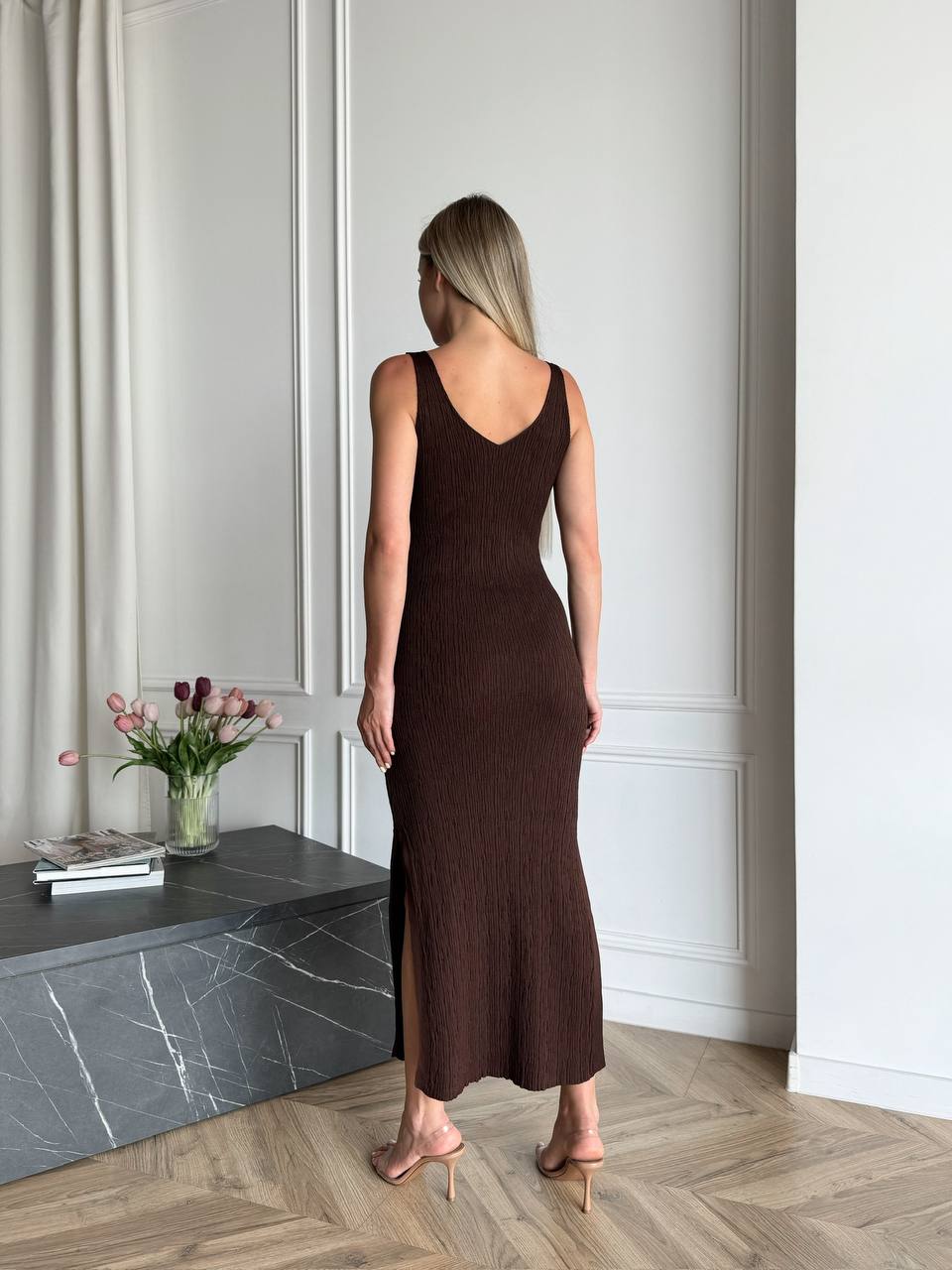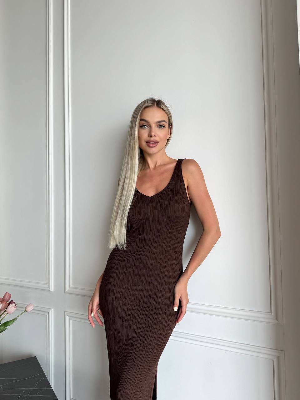 Жіноча Літня Коричнева Сукня – Довга із Фактурної Тканини з Розрізом Збоку