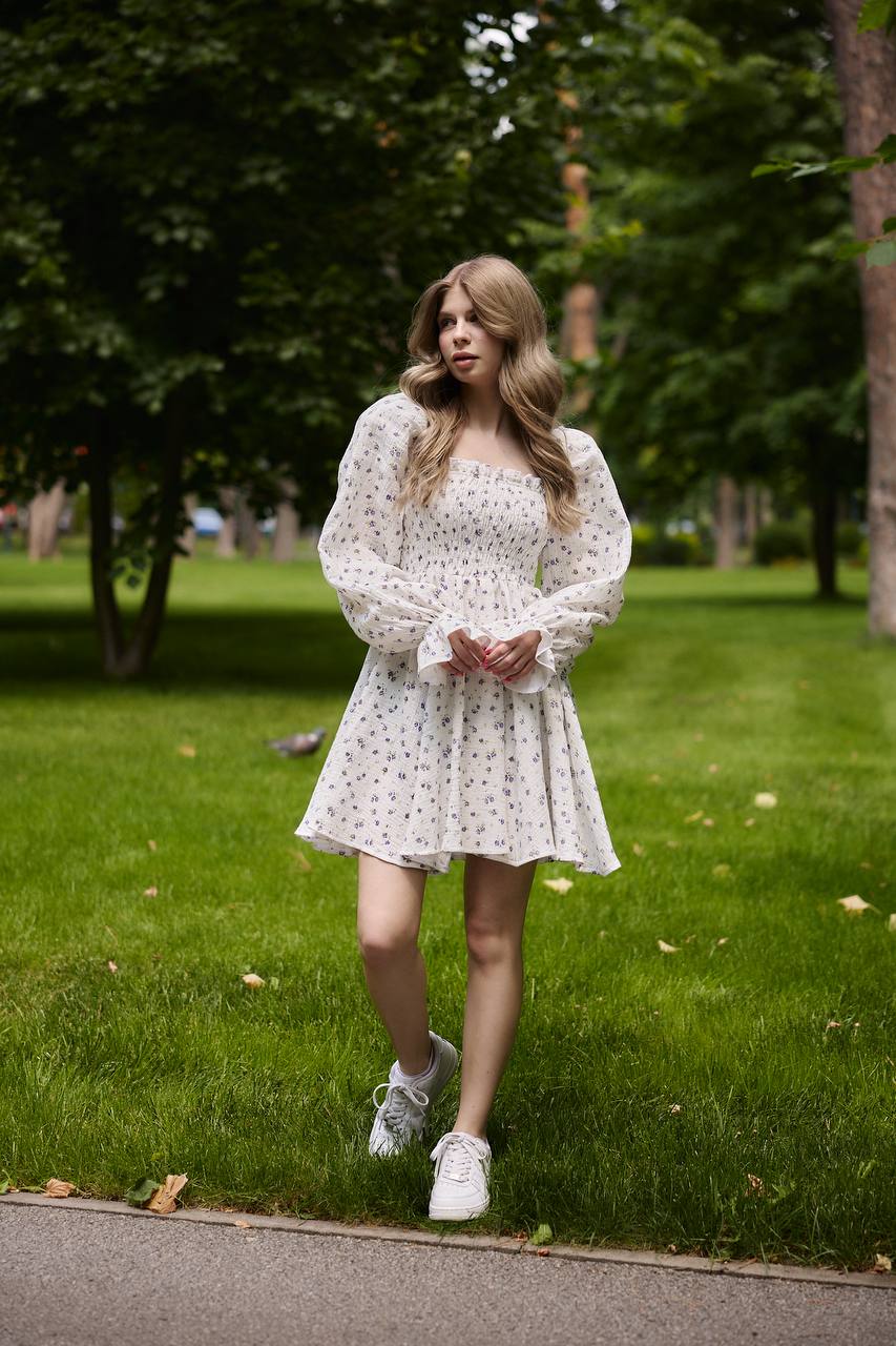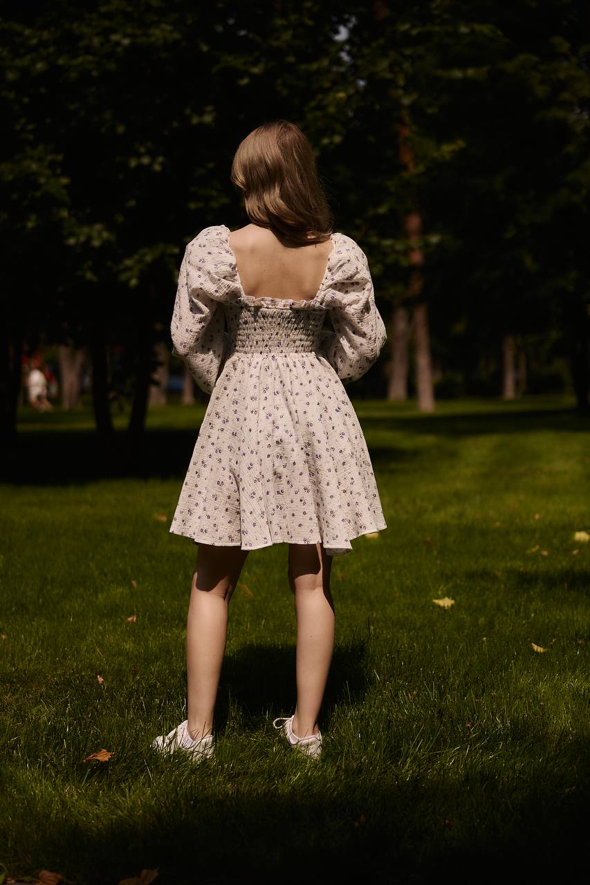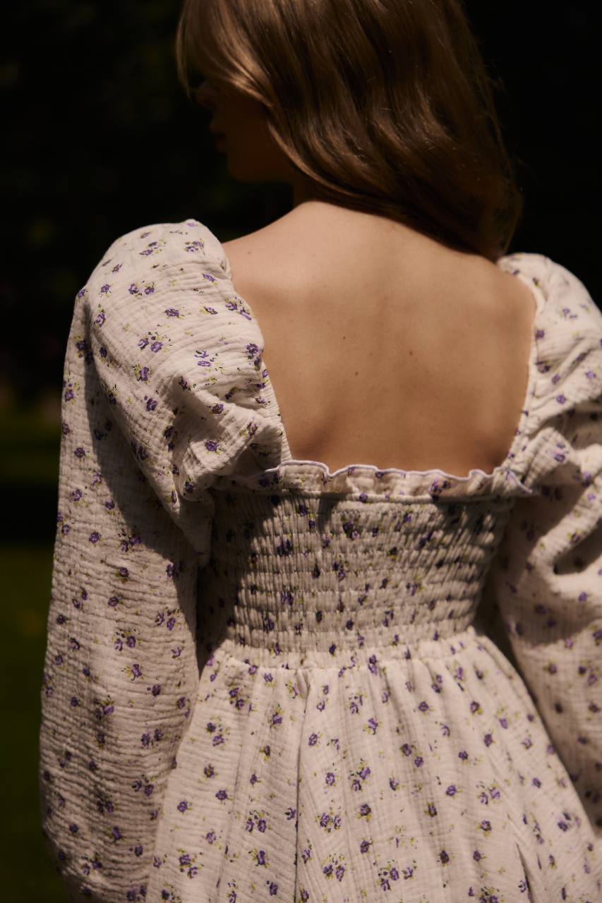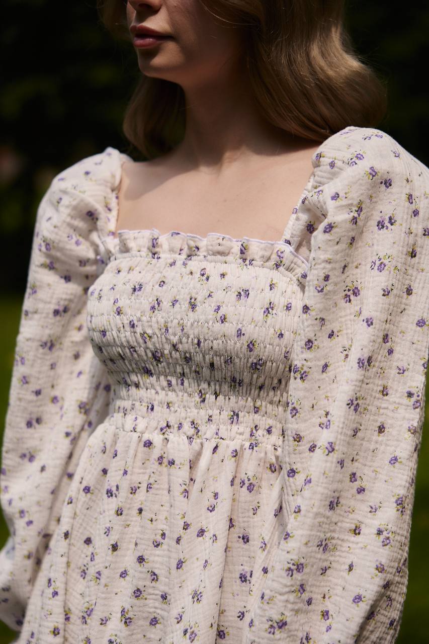 Жіноча Літня Муслінова Молочна Сукня Міні у Фіолетових Квіточках з Об’ємними Рукавами та Резинкою на Грудях