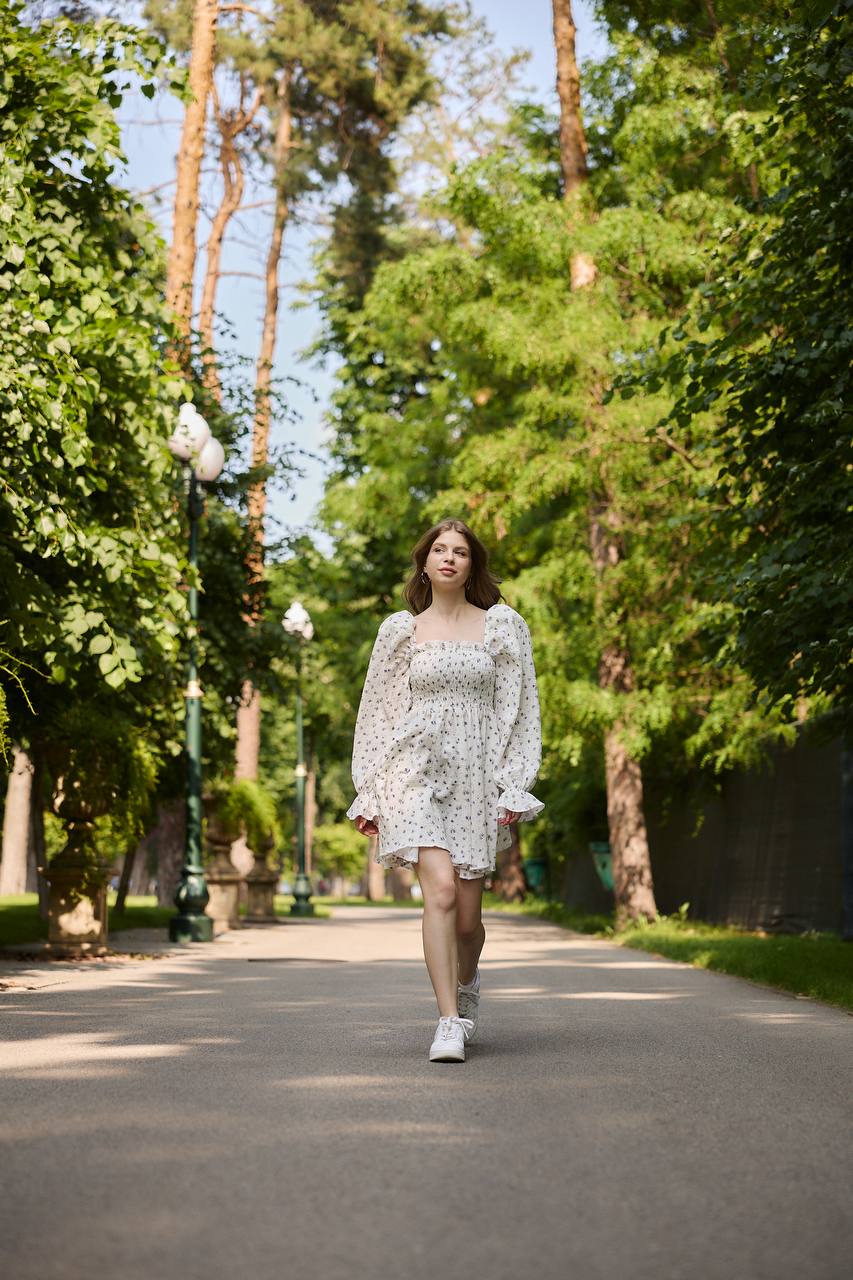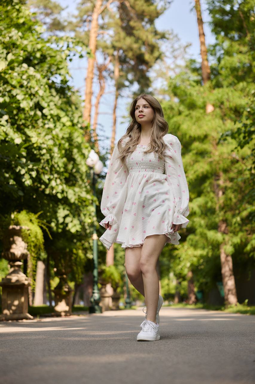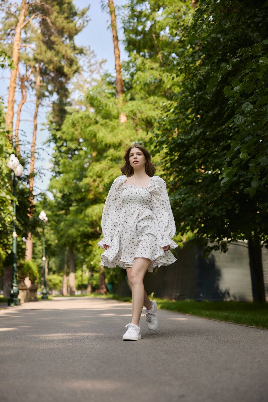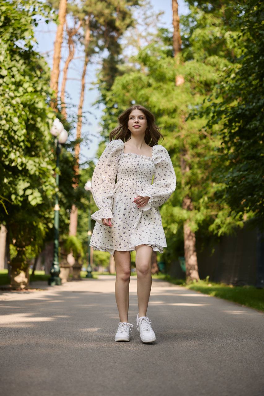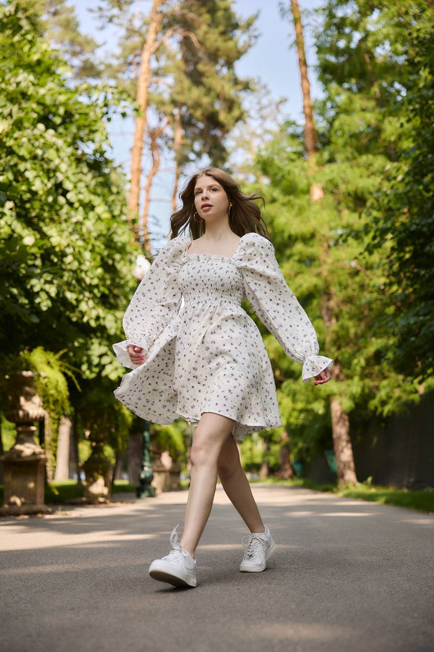 Жіноча Літня Муслінова Молочна Сукня Міні у Фіолетових Квіточках з Об’ємними Рукавами та Резинкою на Грудях
