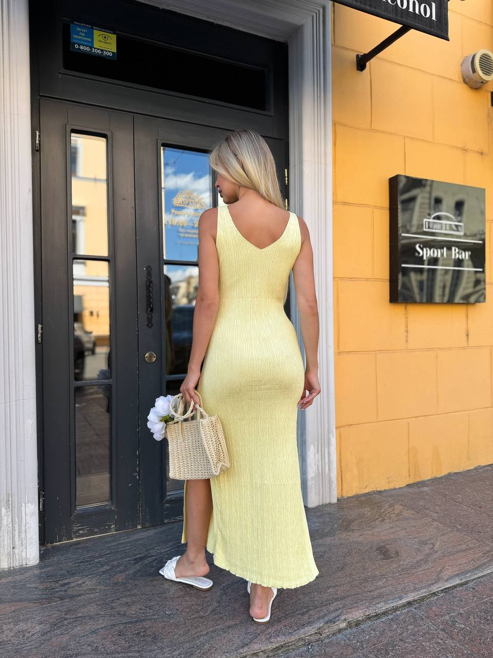 Жіноча Літня Жовта Сукня – Довга із Фактурної Тканини з Розрізом Збоку