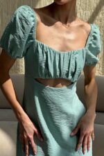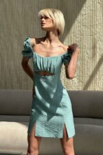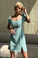 Жіноча Оливкова Сукня Альфа Міні з Короткими Рукавами та Вирізом Під Грудьми