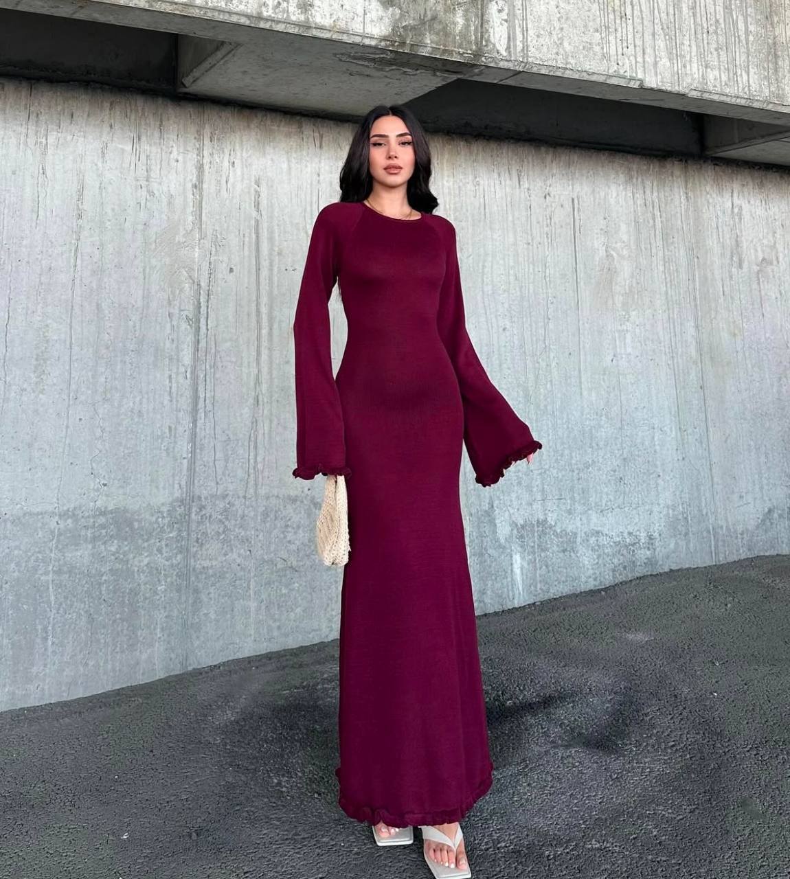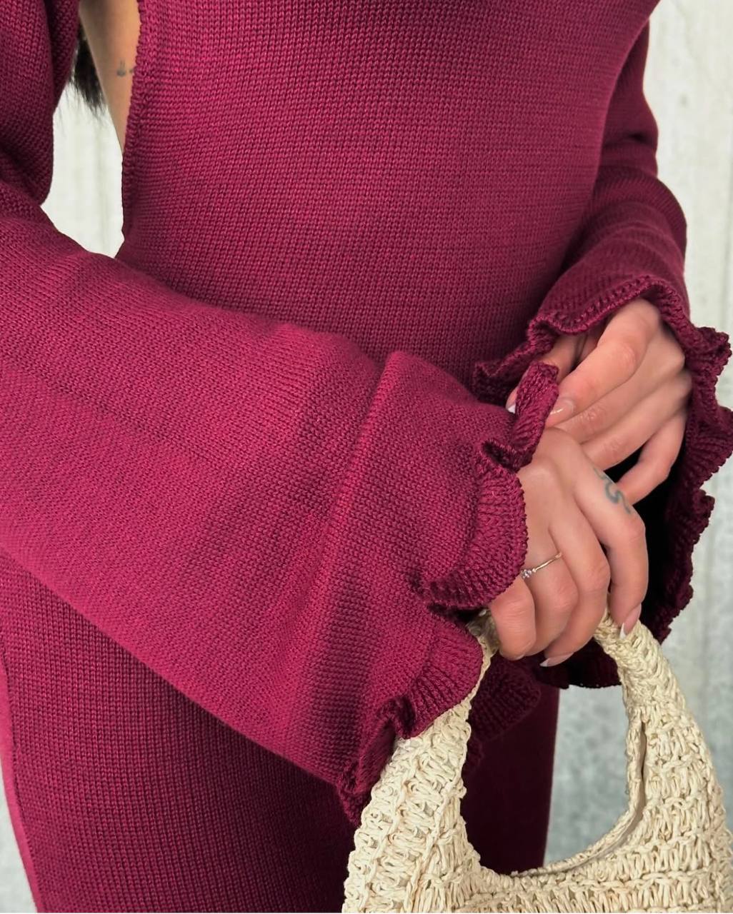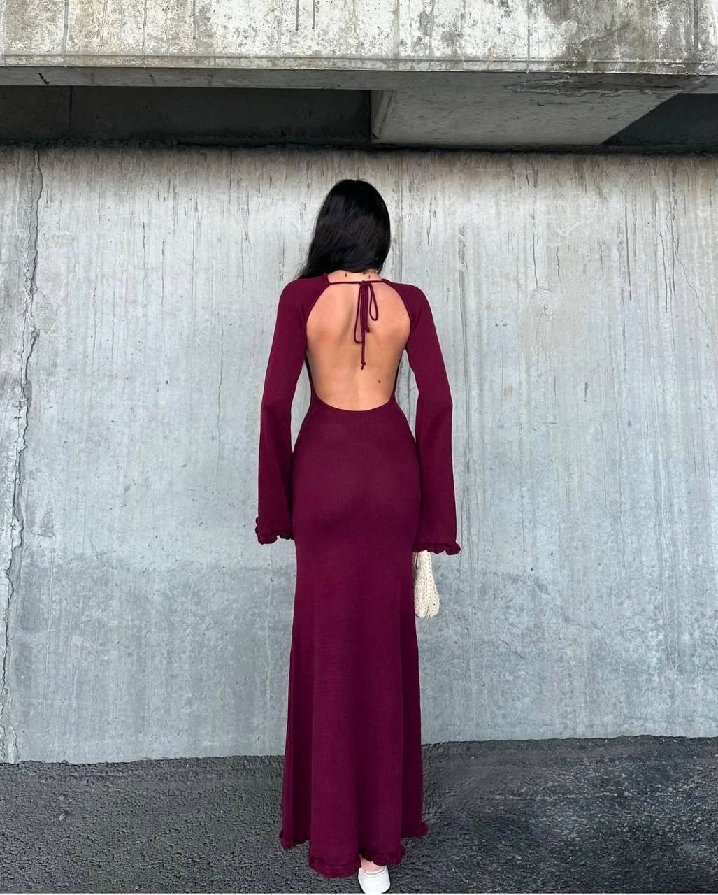 Жіноча Приталена Бордова Сукня Максі з Рукавами Кльош та Відкритою Спиною