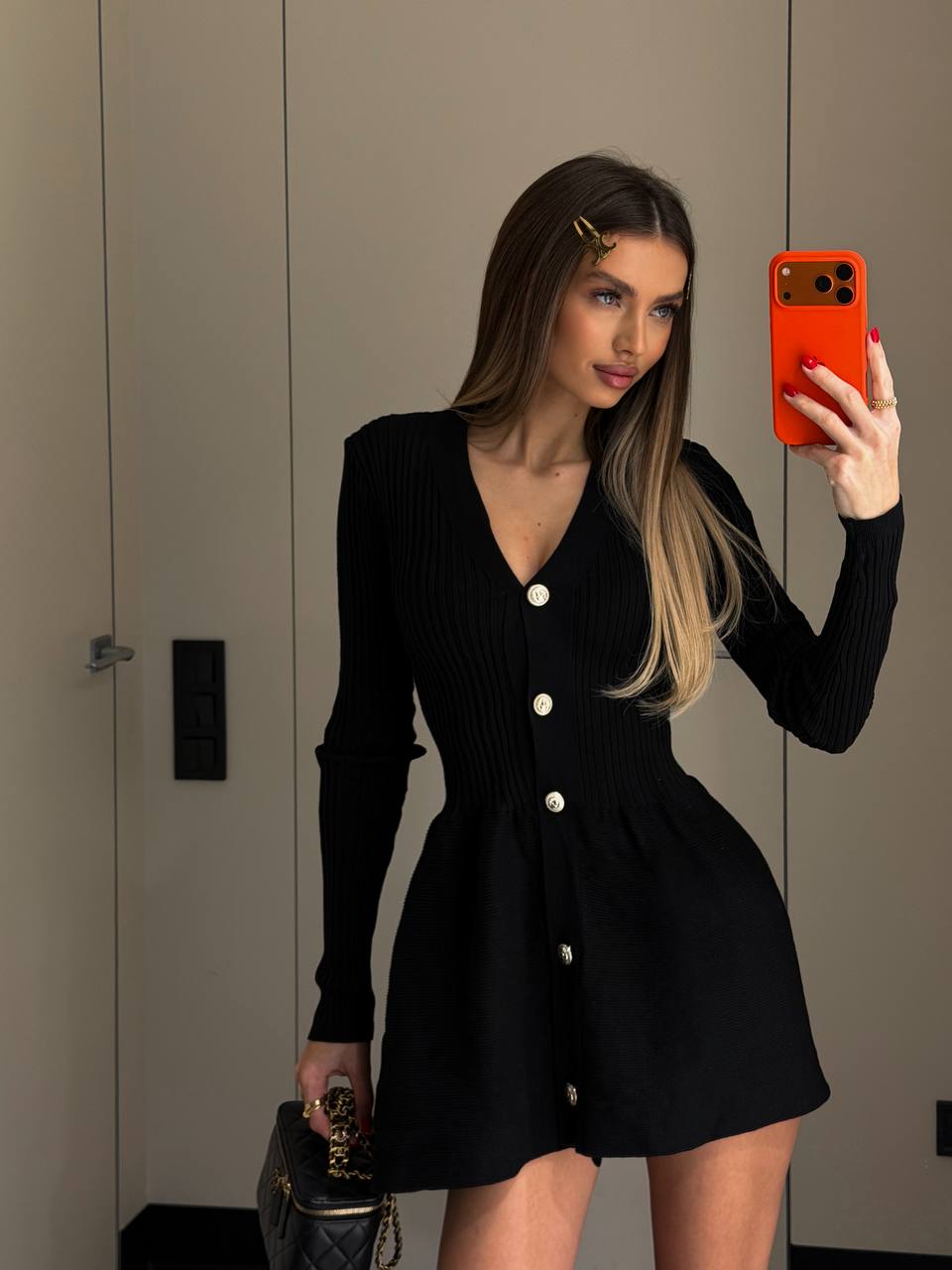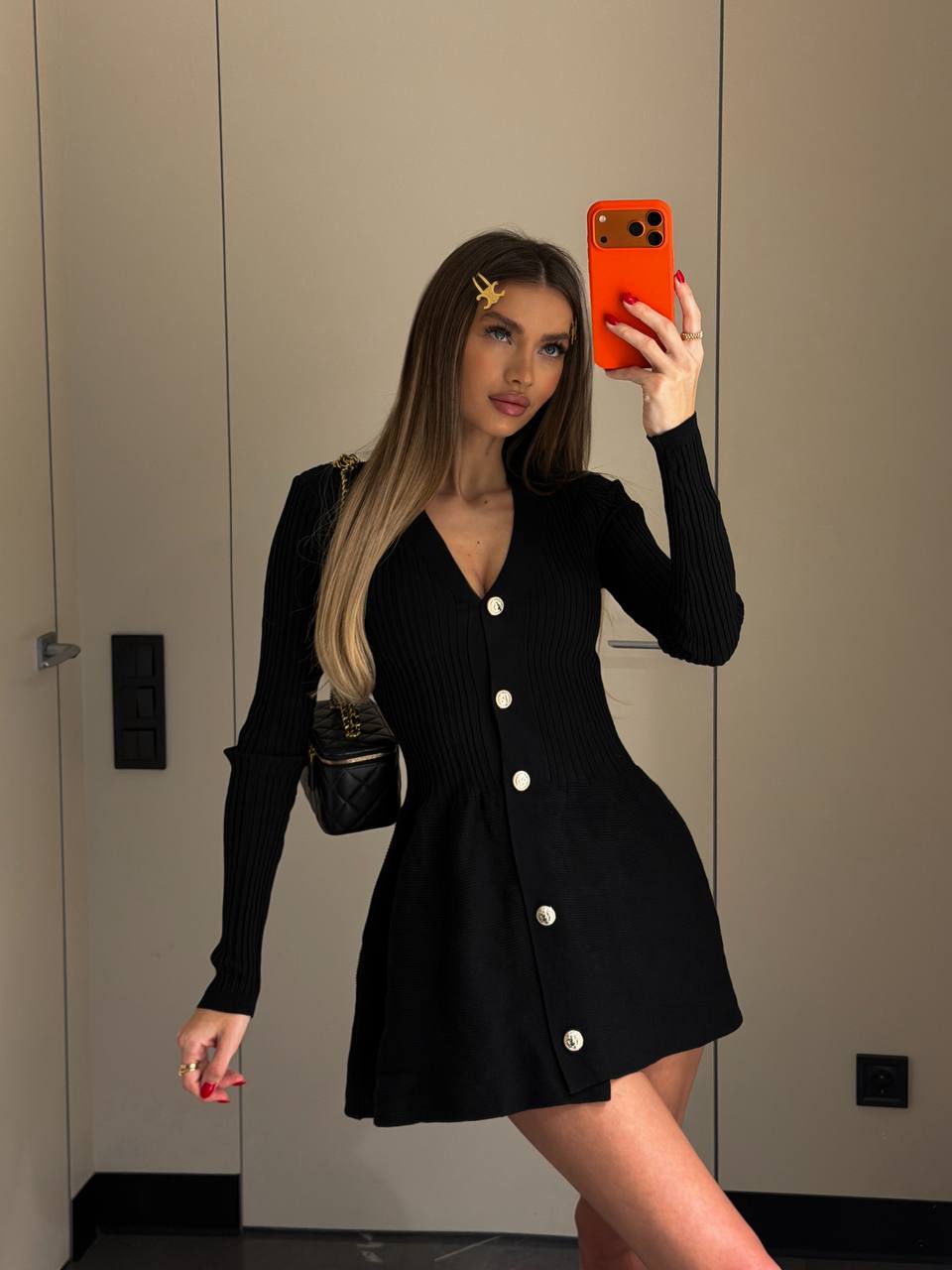 Жіноча Приталена Чорна Трикотажна Сукня Міні на Ґудзиках з V-вирізом