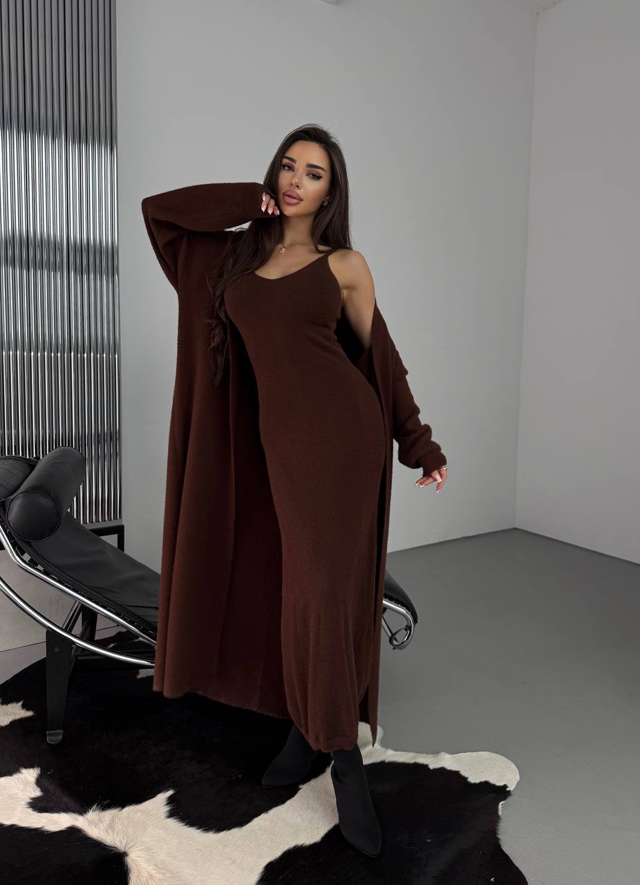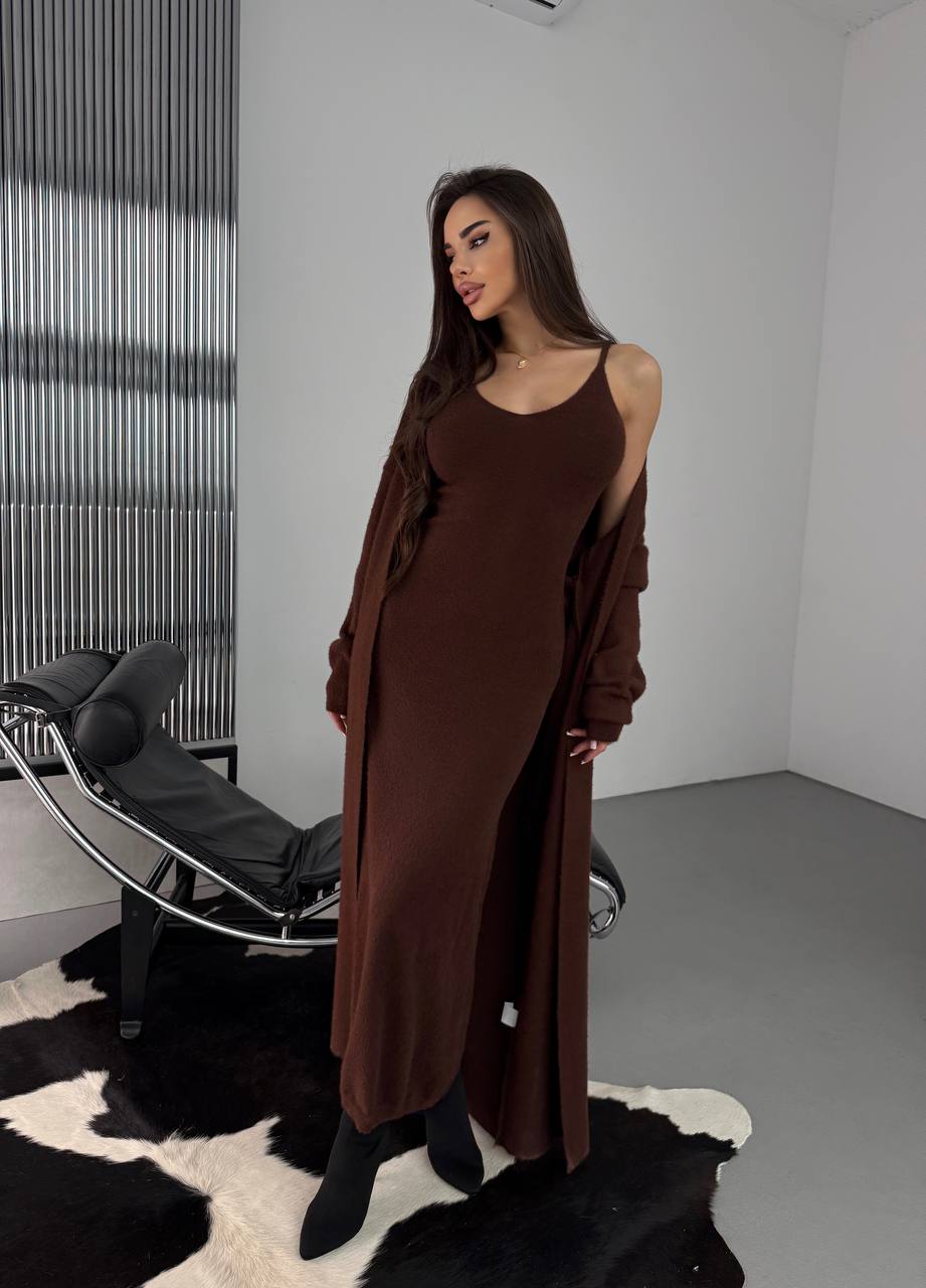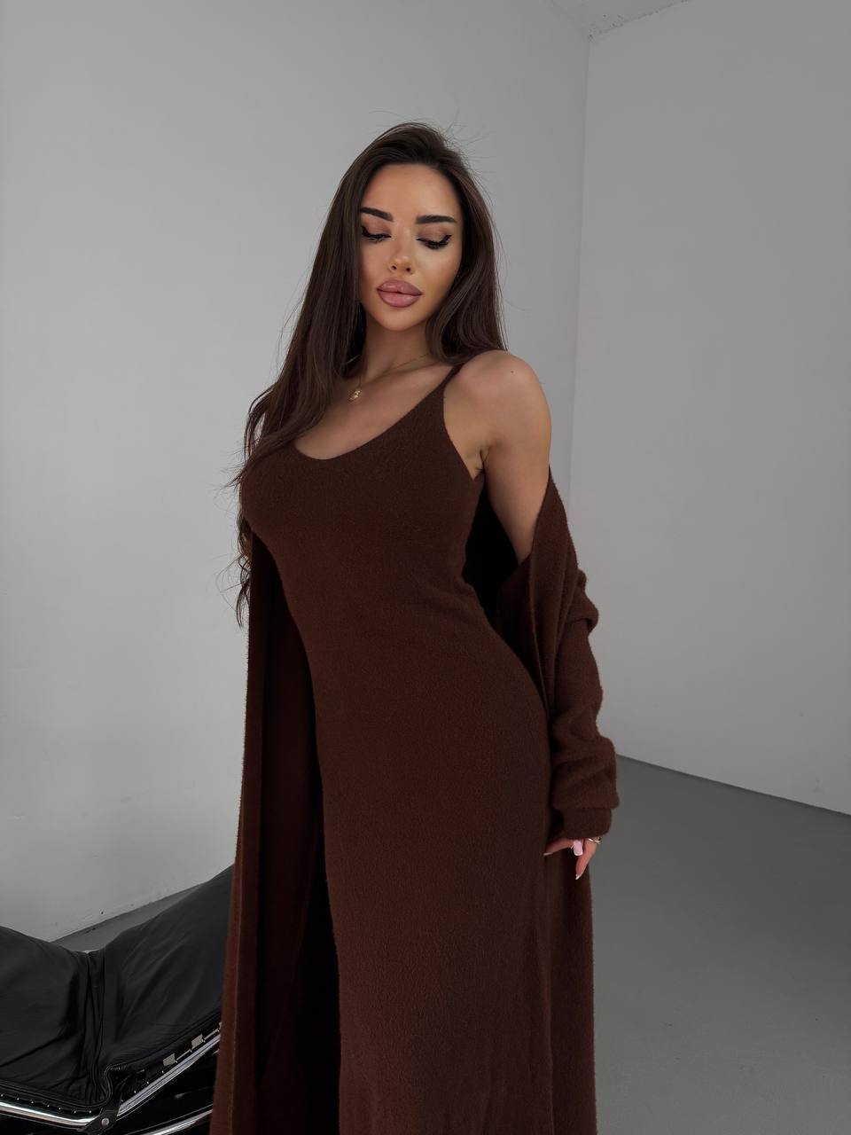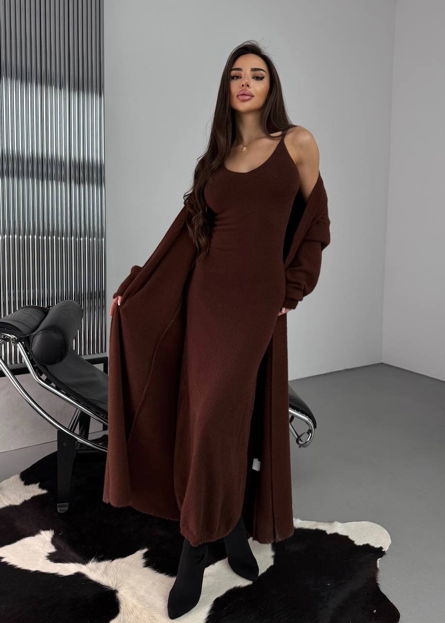 Жіноча Пухнаста Коричнева Сукня Максі + Довгий М’який Кардиган (Комплект)