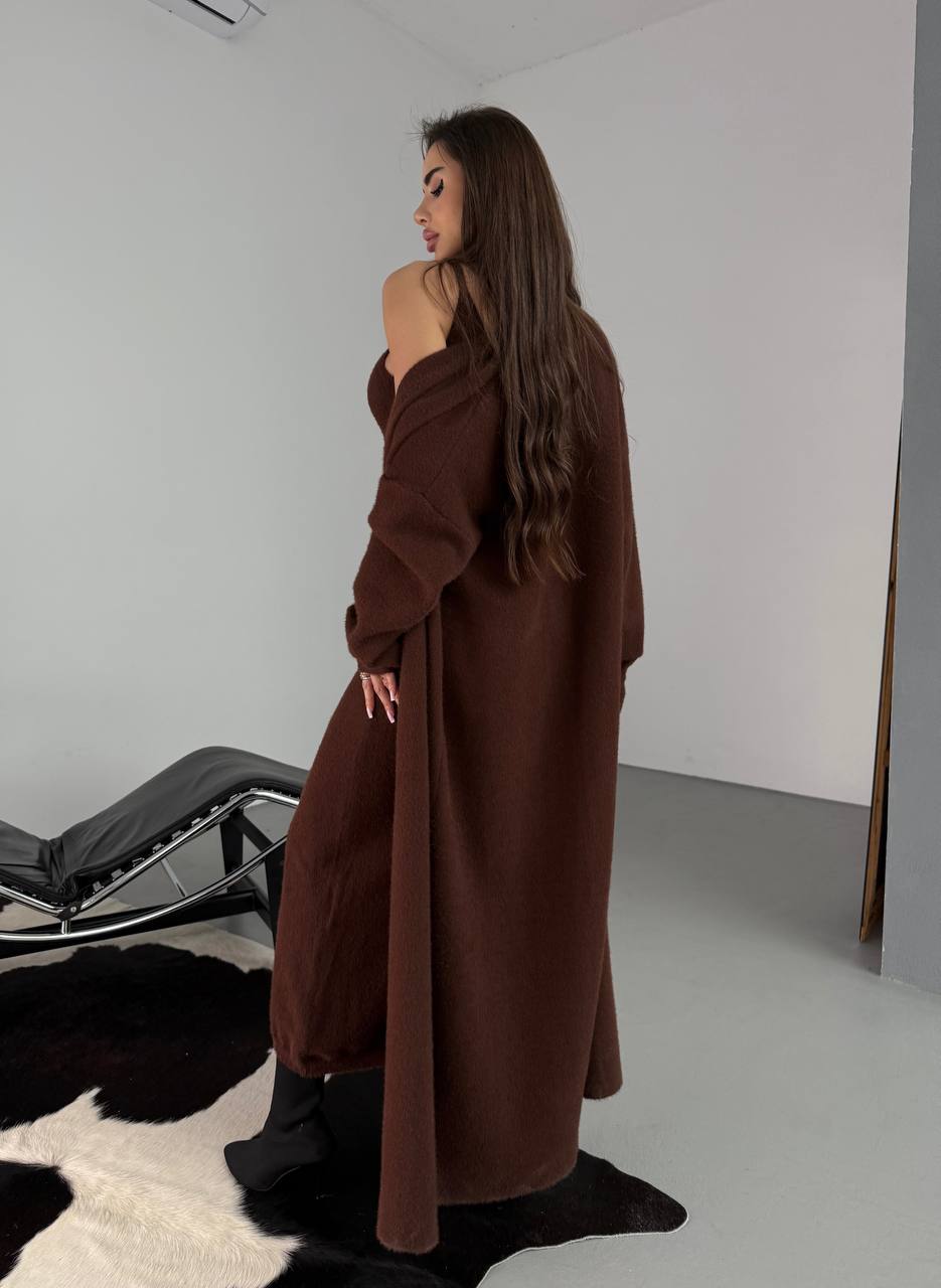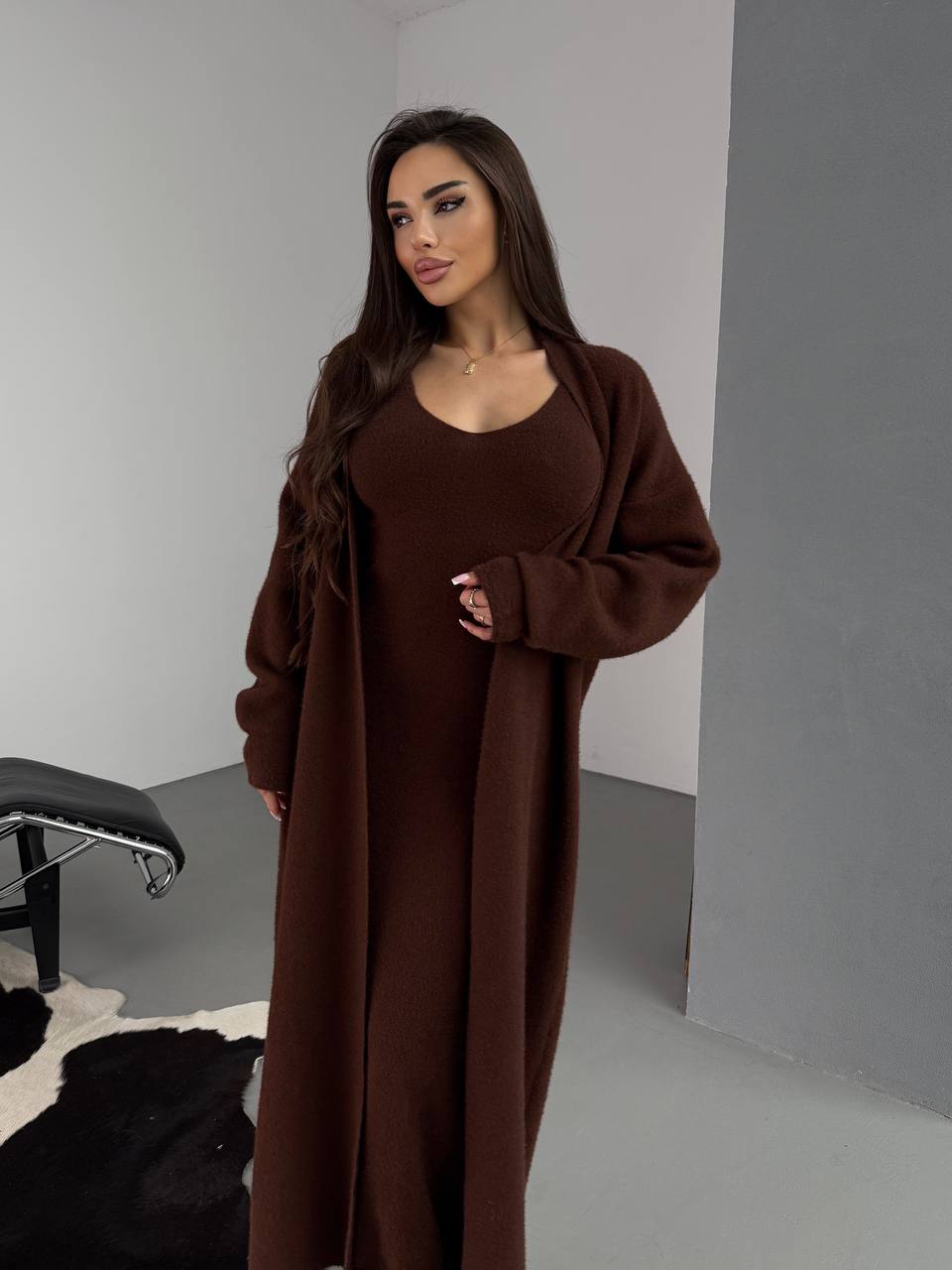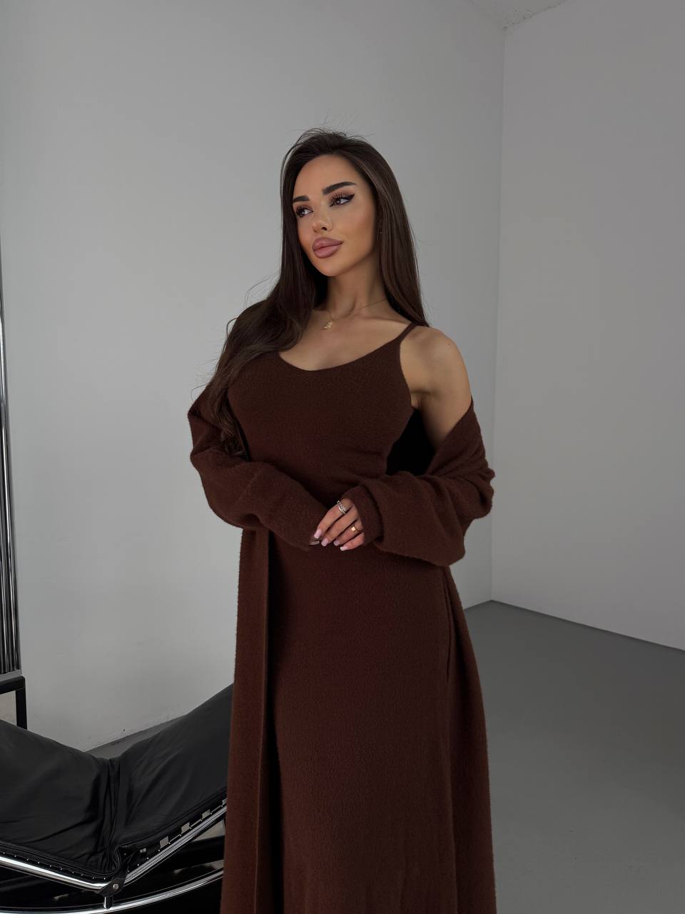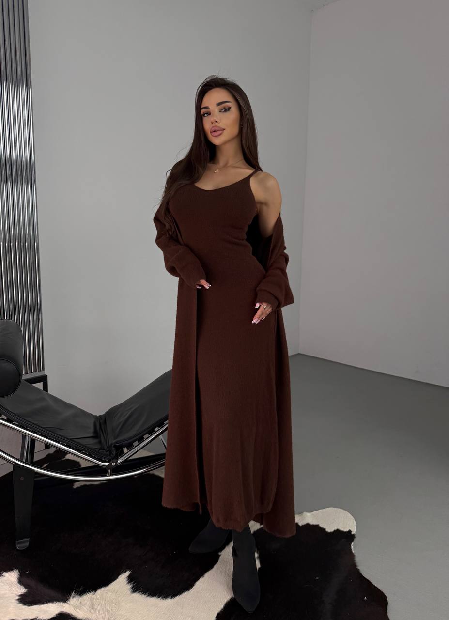 Жіноча Пухнаста Коричнева Сукня Максі + Довгий М’який Кардиган (Комплект)