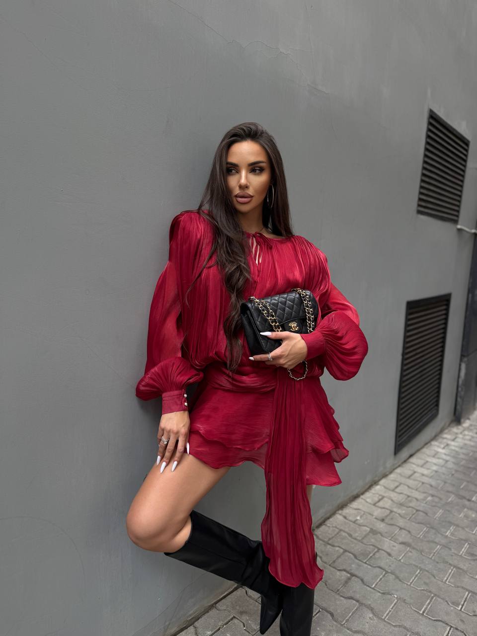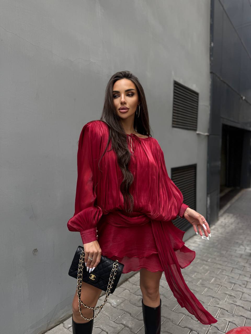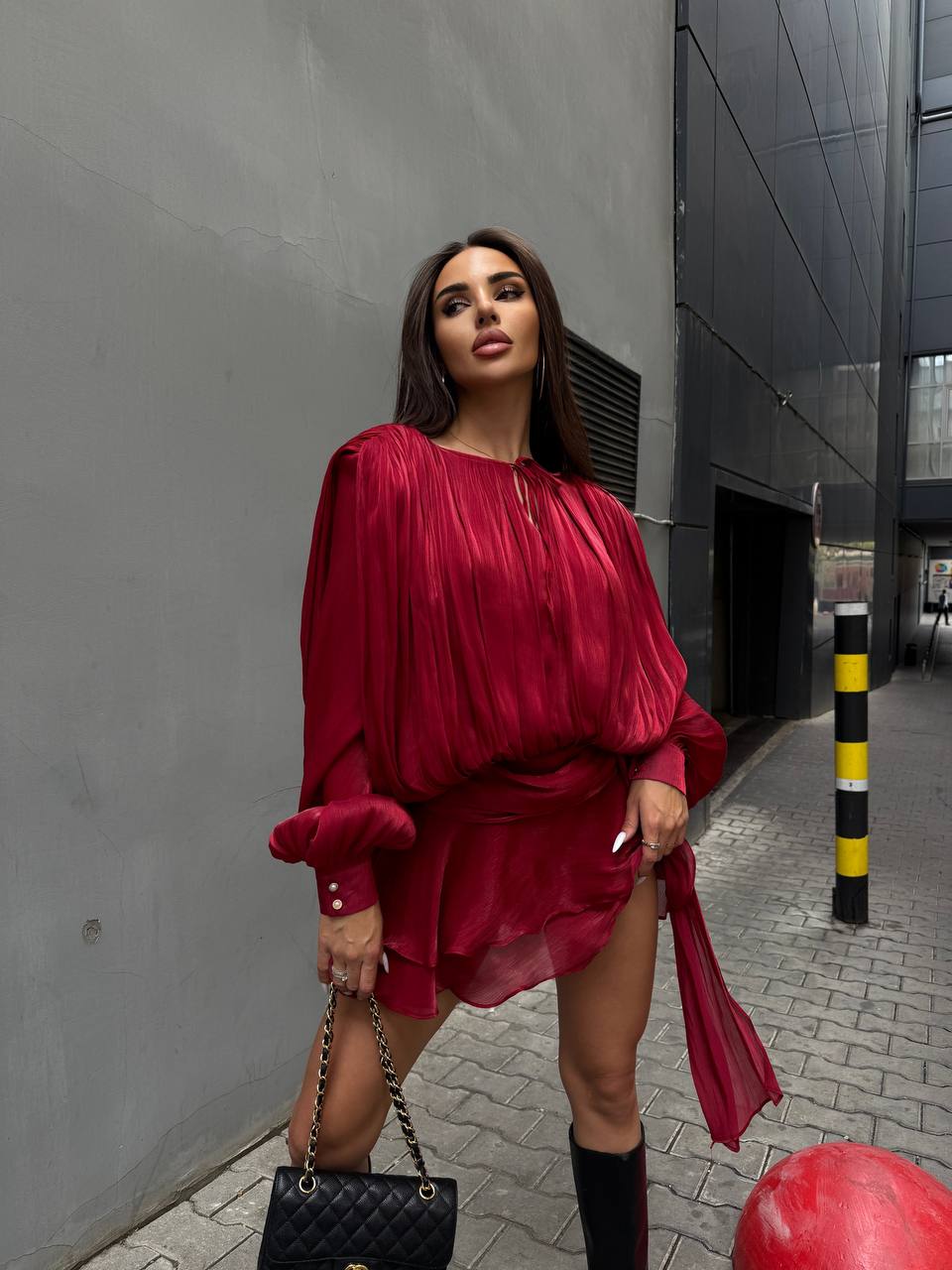 Жіноча Шовкова Бордова Сукня Міні з Об’ємним Верхом та Рукавами