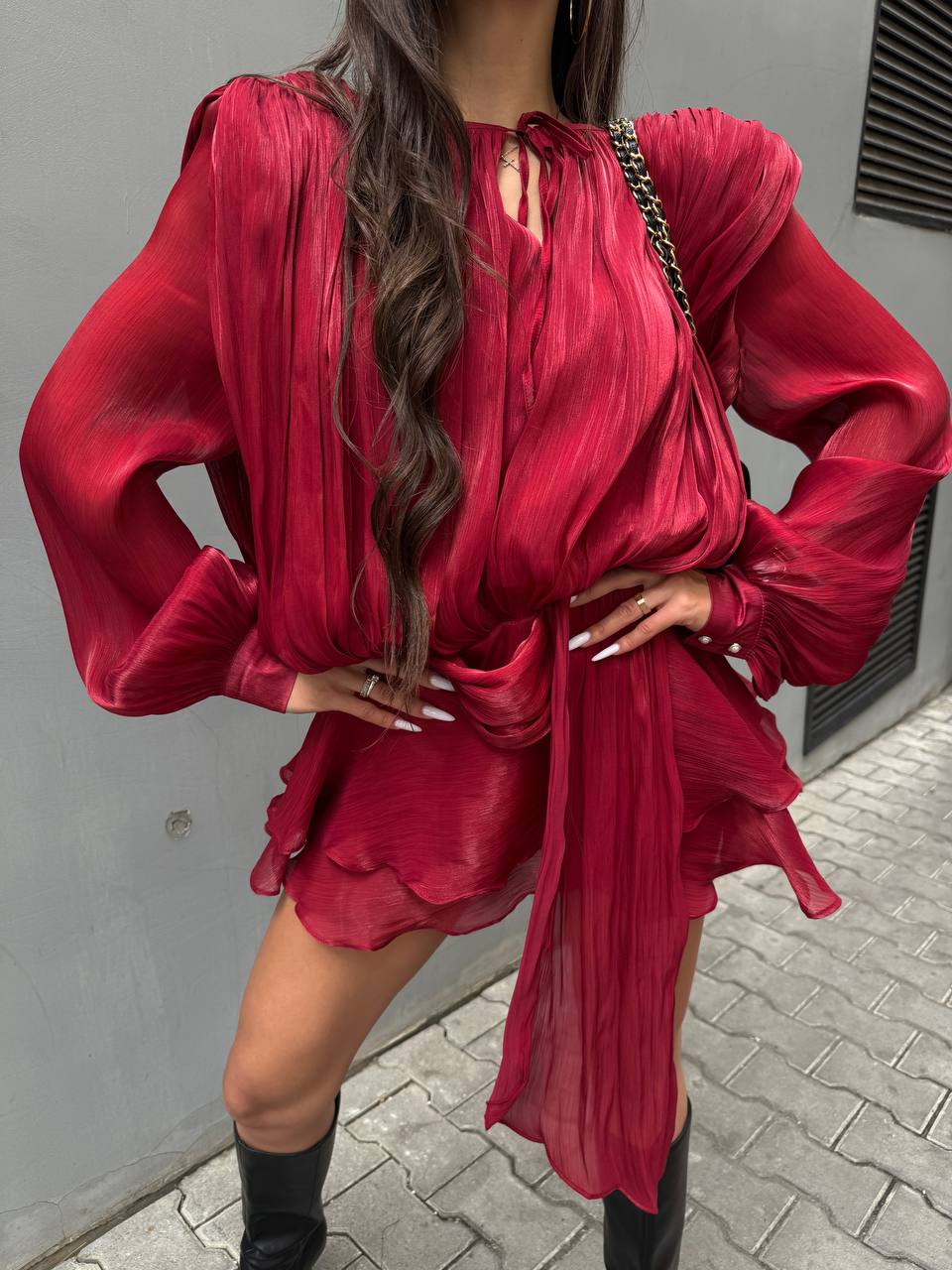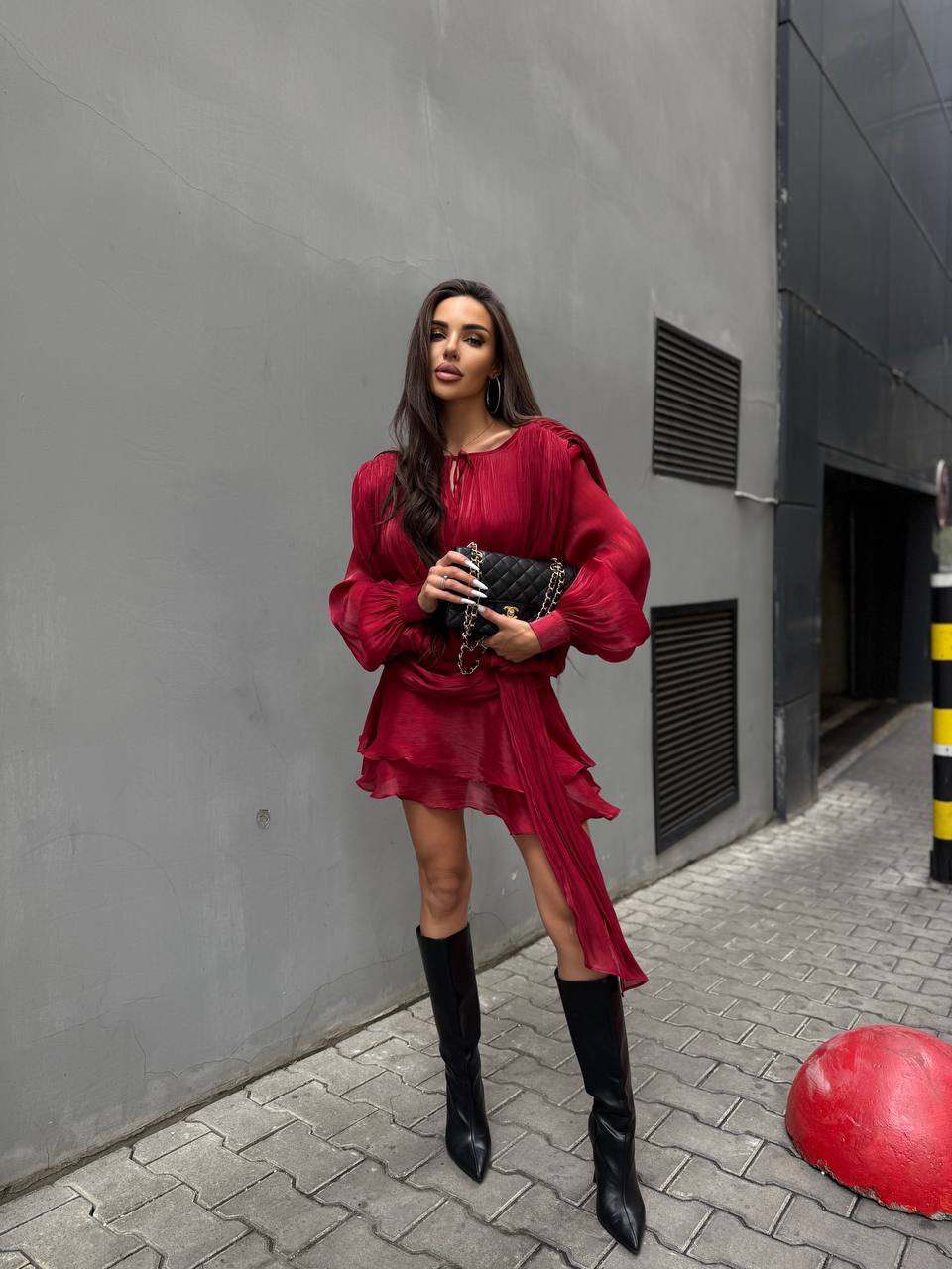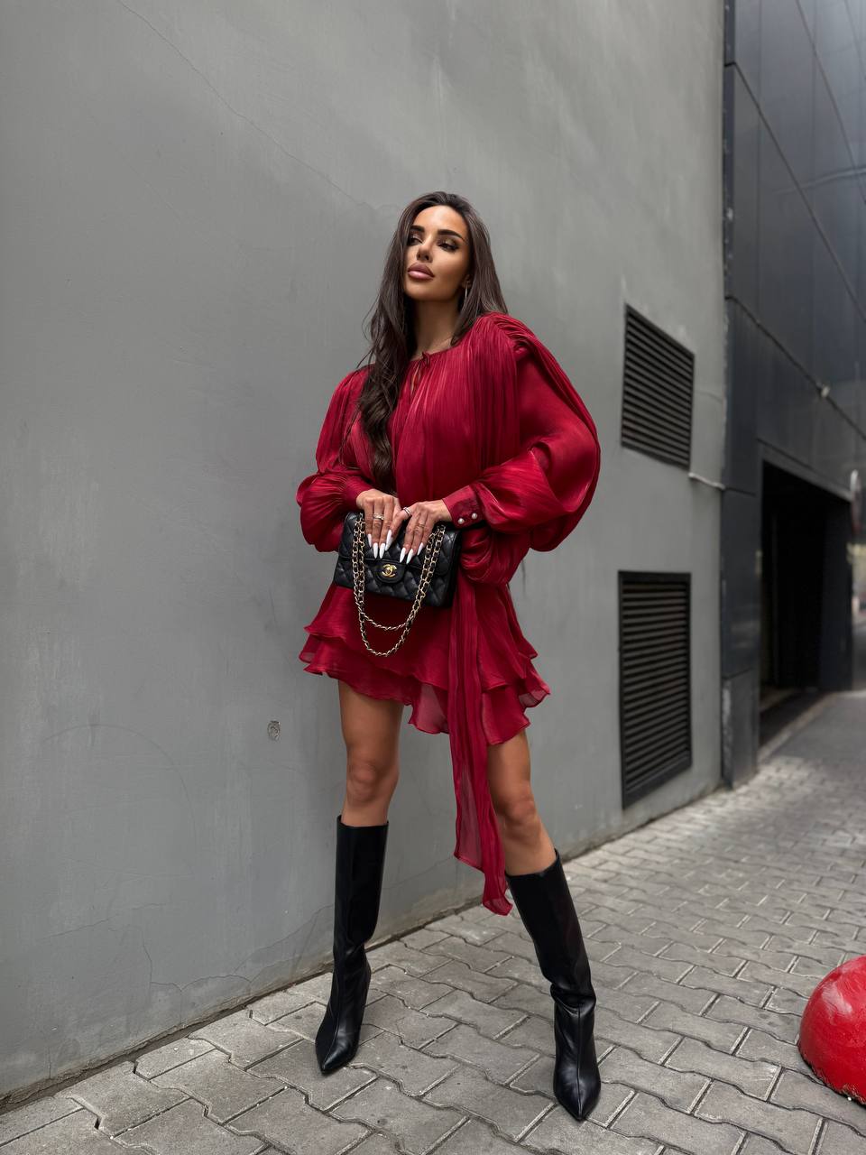 Жіноча Шовкова Бордова Сукня Міні з Об’ємним Верхом та Рукавами