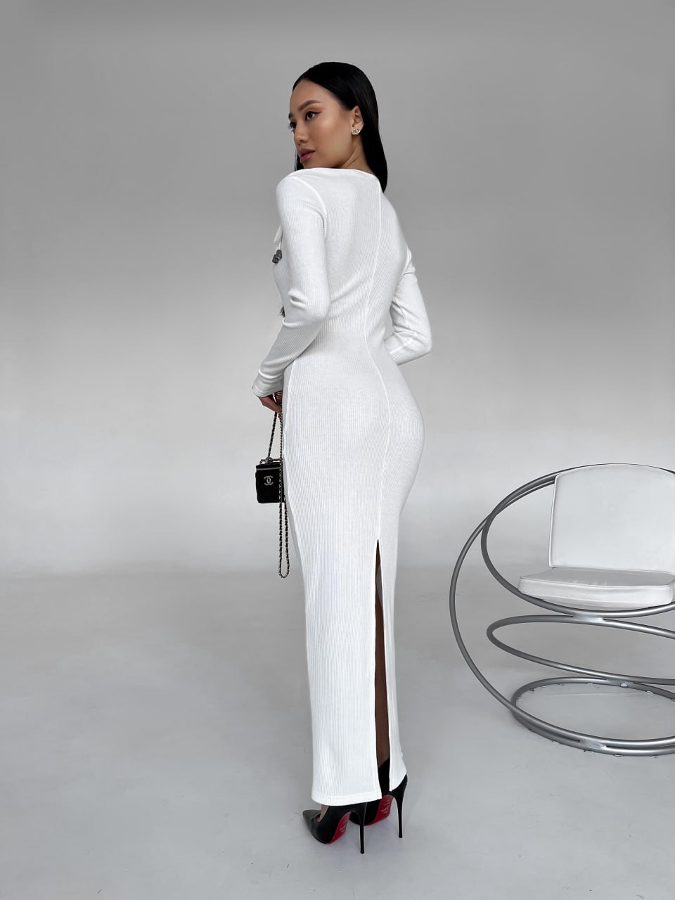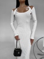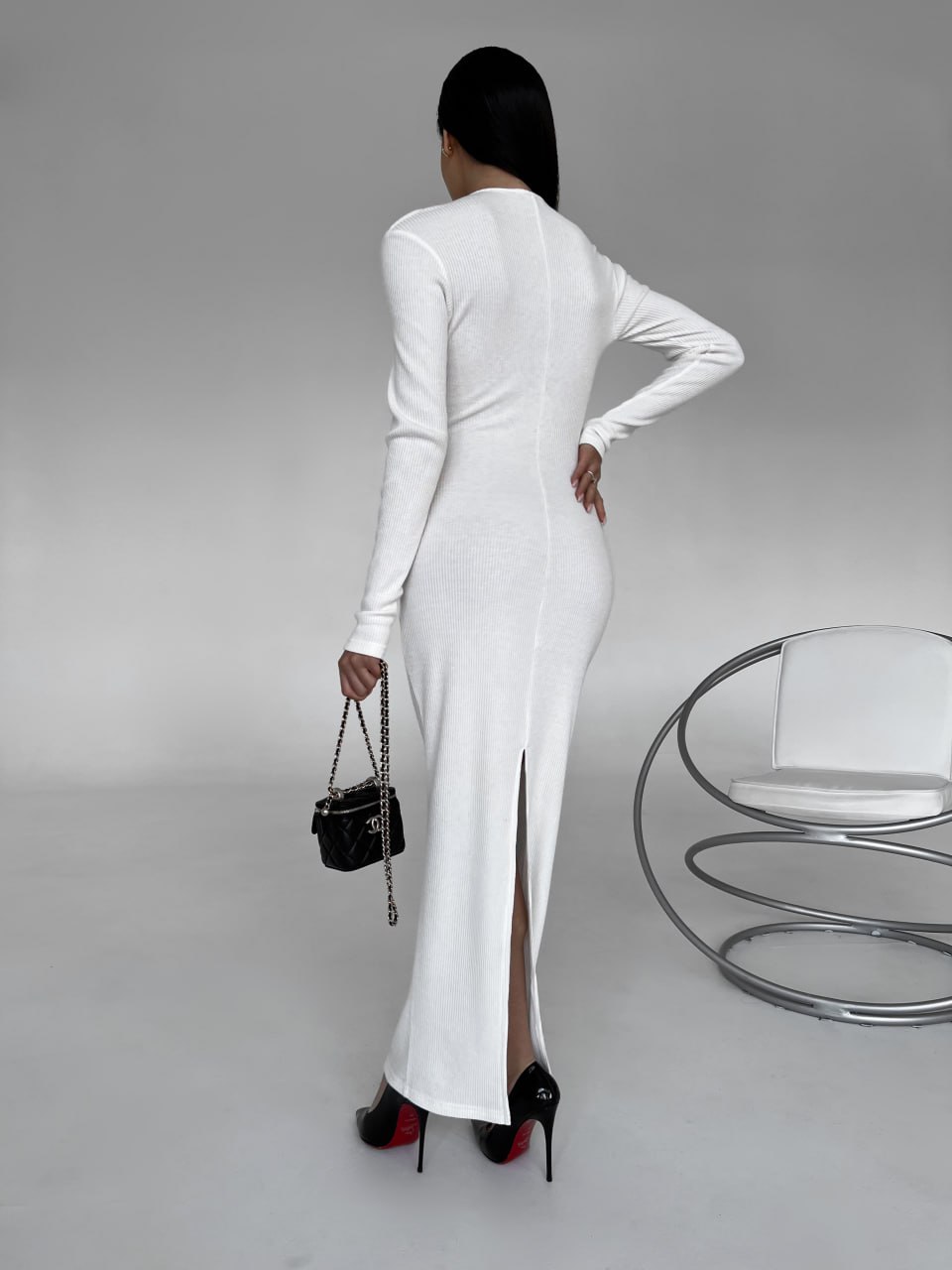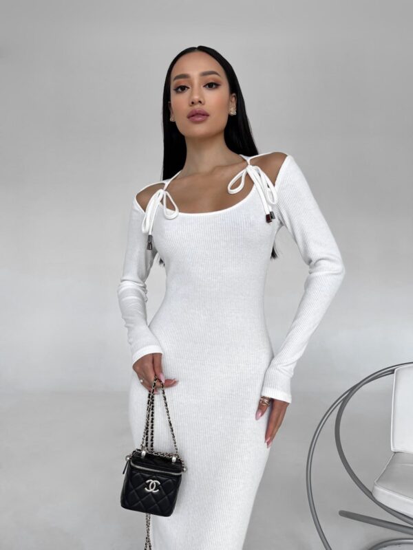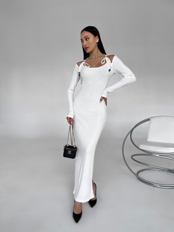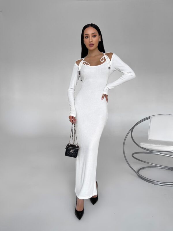 Жіноча Силуетна Біла Сукня Кева Максі – Довга із Зав’язками на Плечах та Розрізом Ззаду