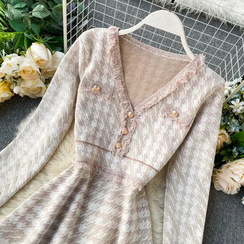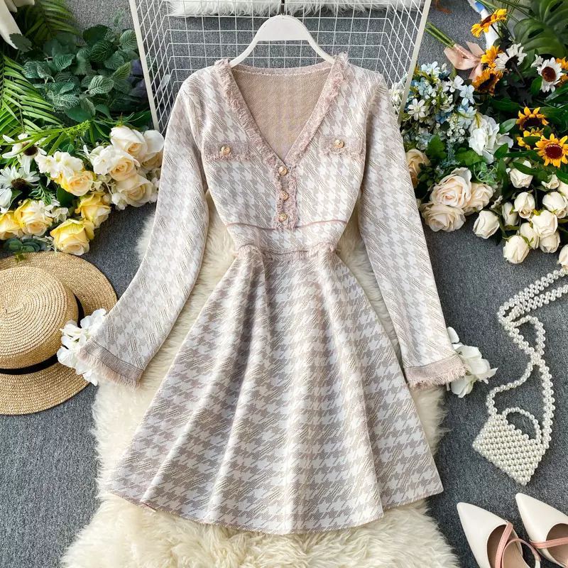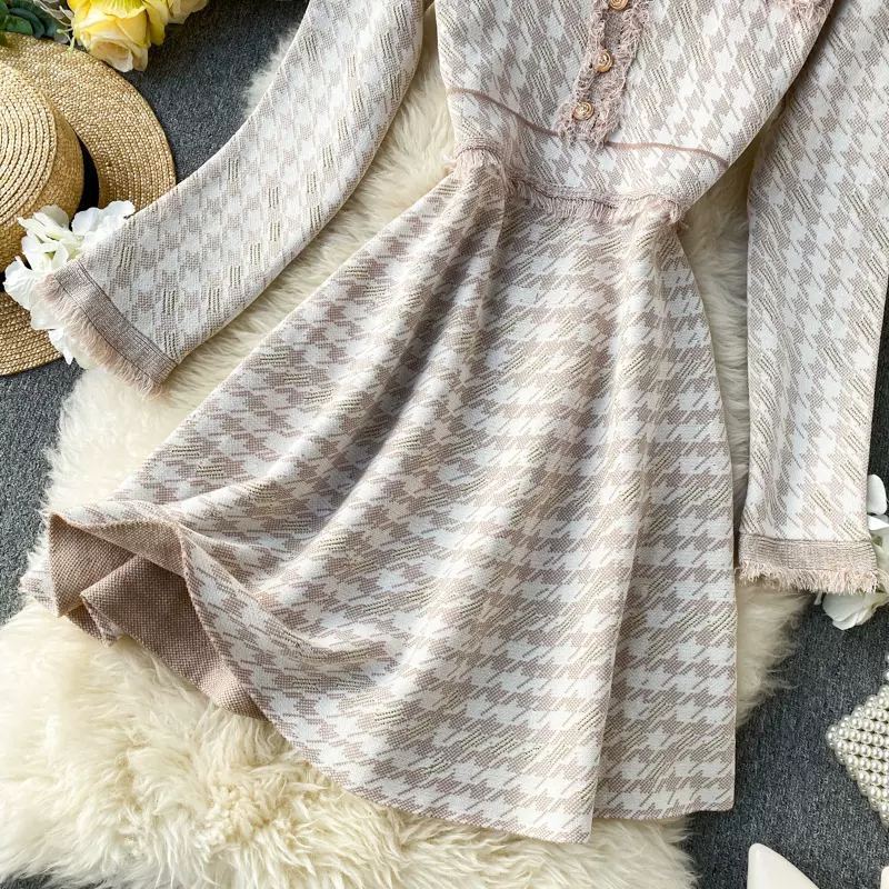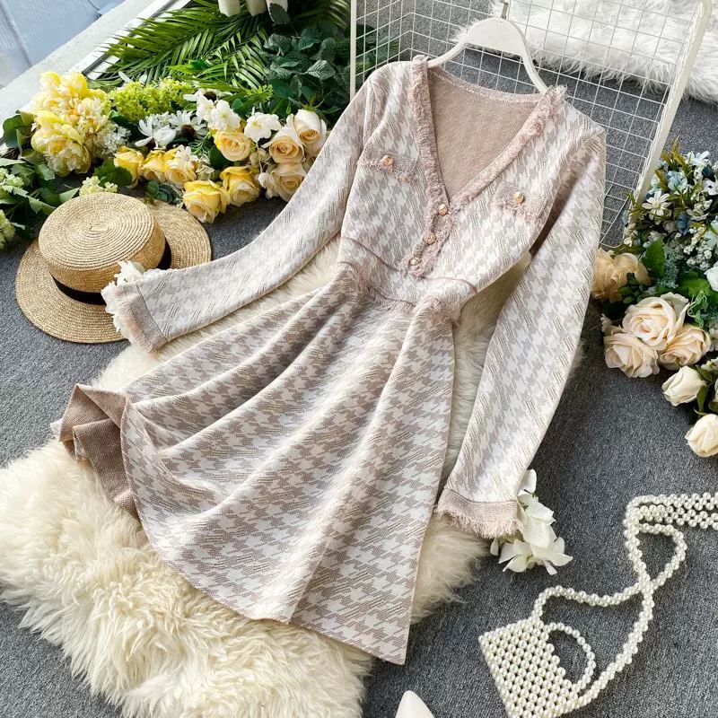 Жіноча Тепла Бежева Сукня – Трикотажна в Принт Гусяча Лапка
