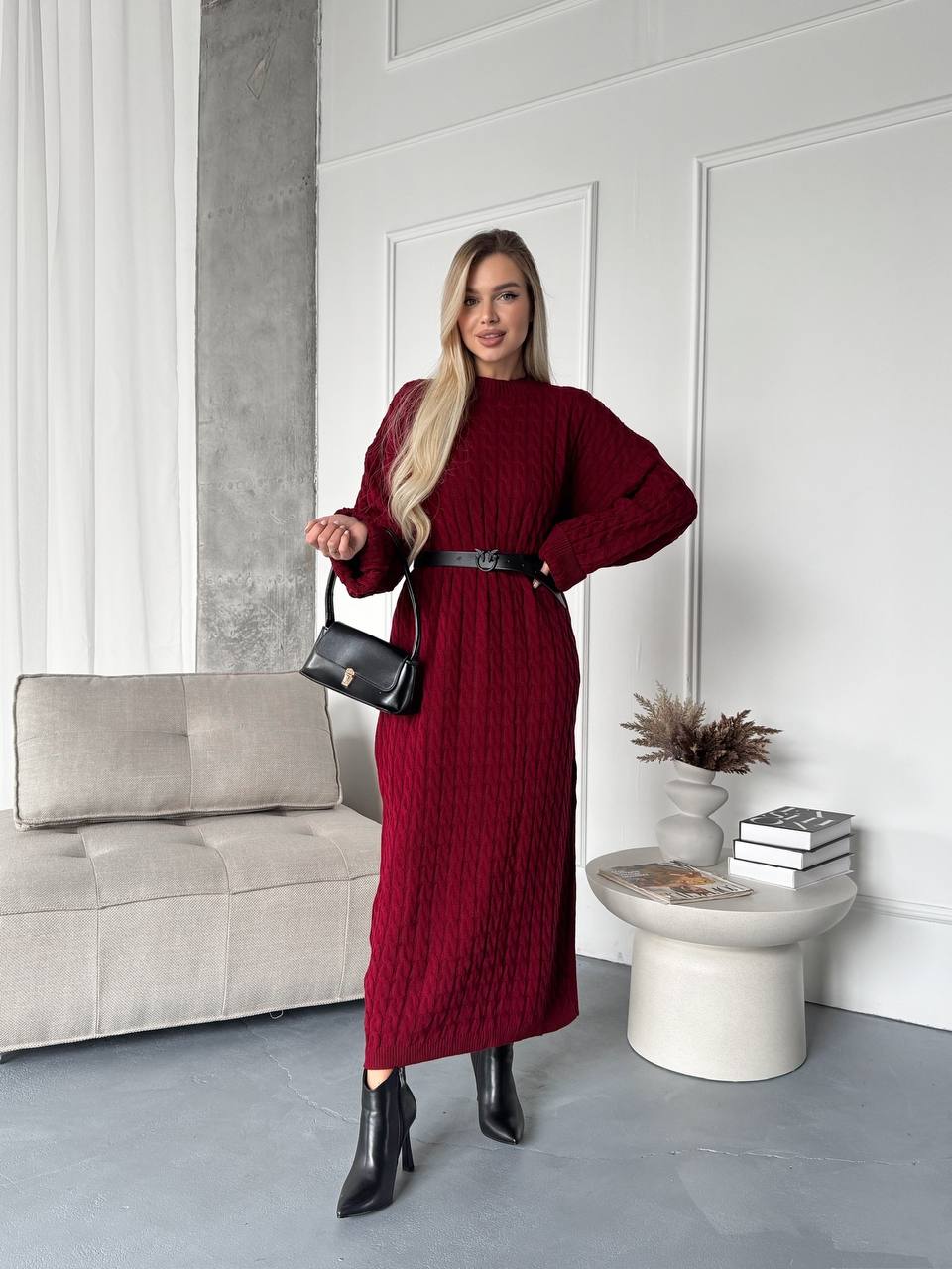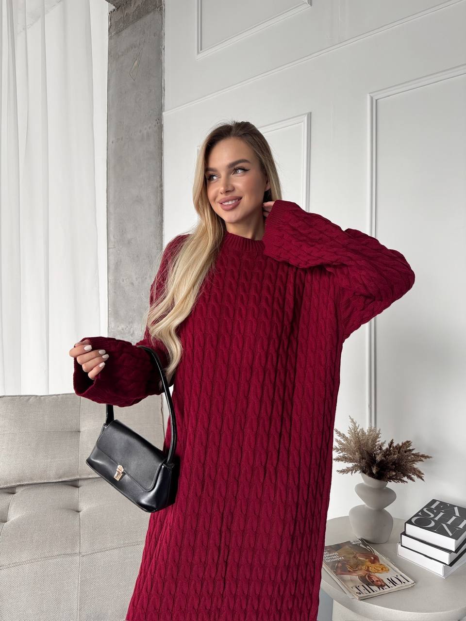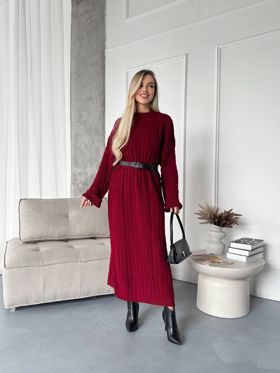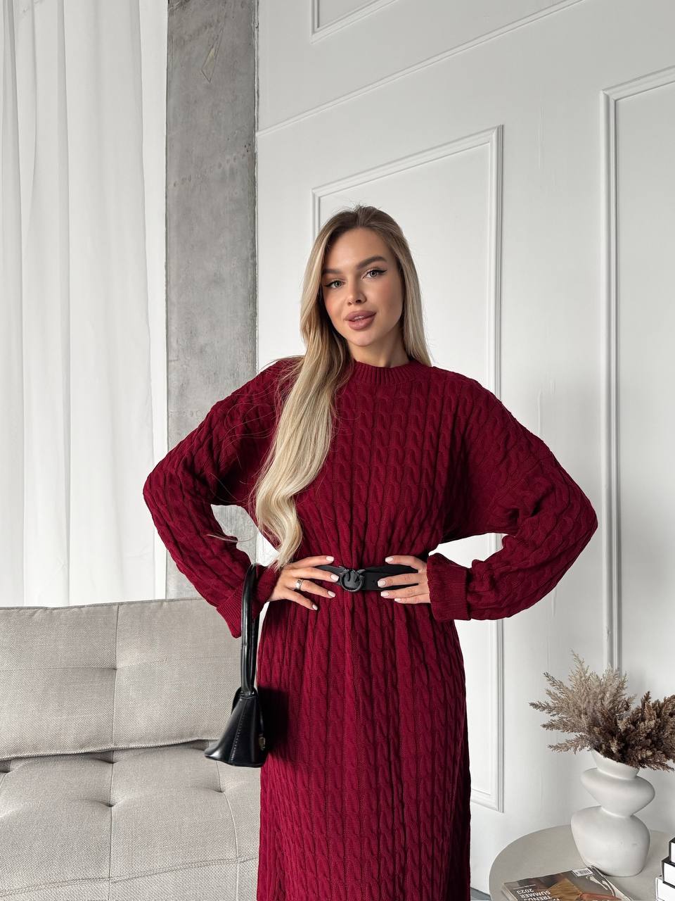 Жіноча Тепла Довга Бордова Сукня Вільного Крою з Фактурним Візерунком Косичка