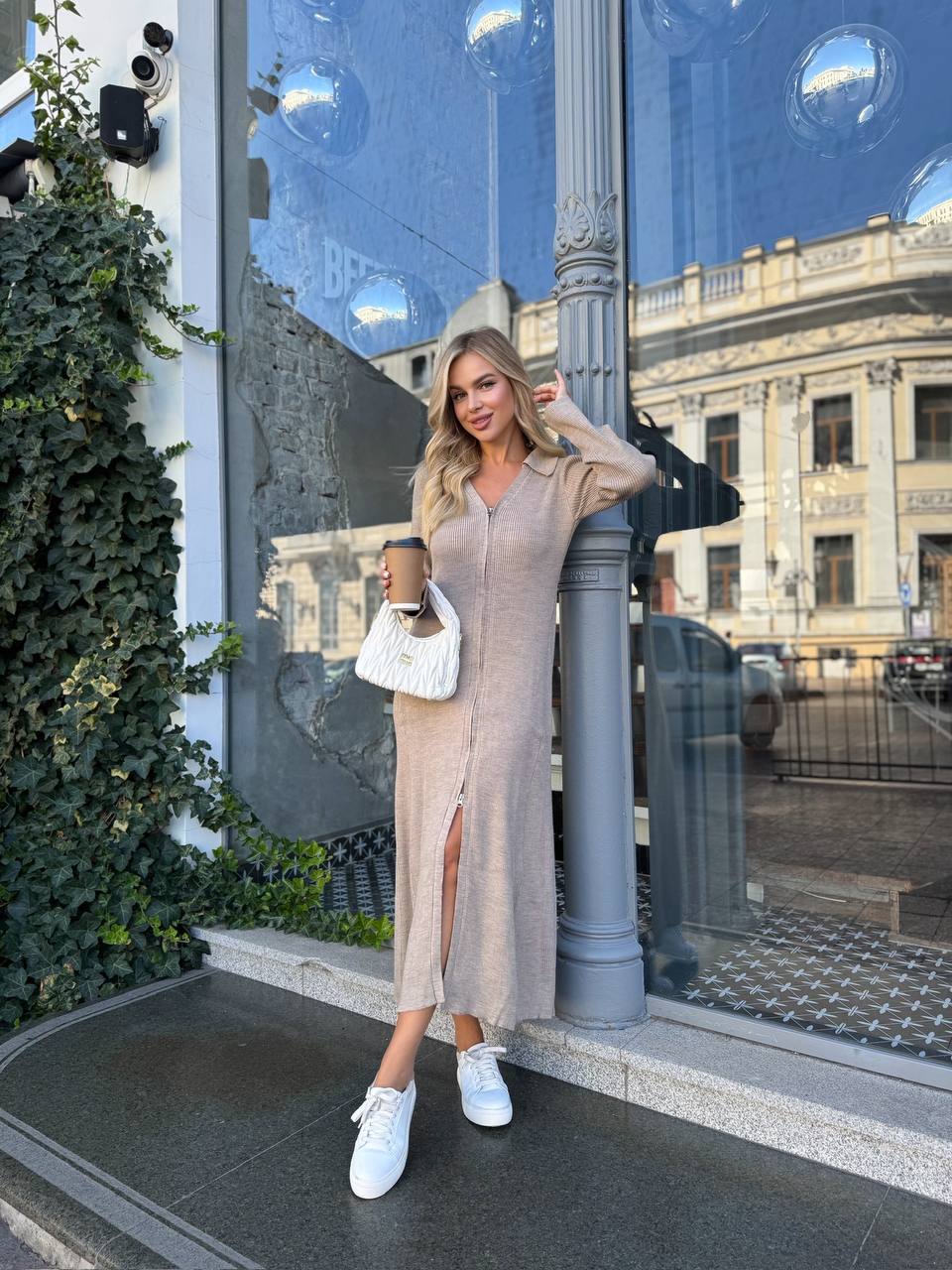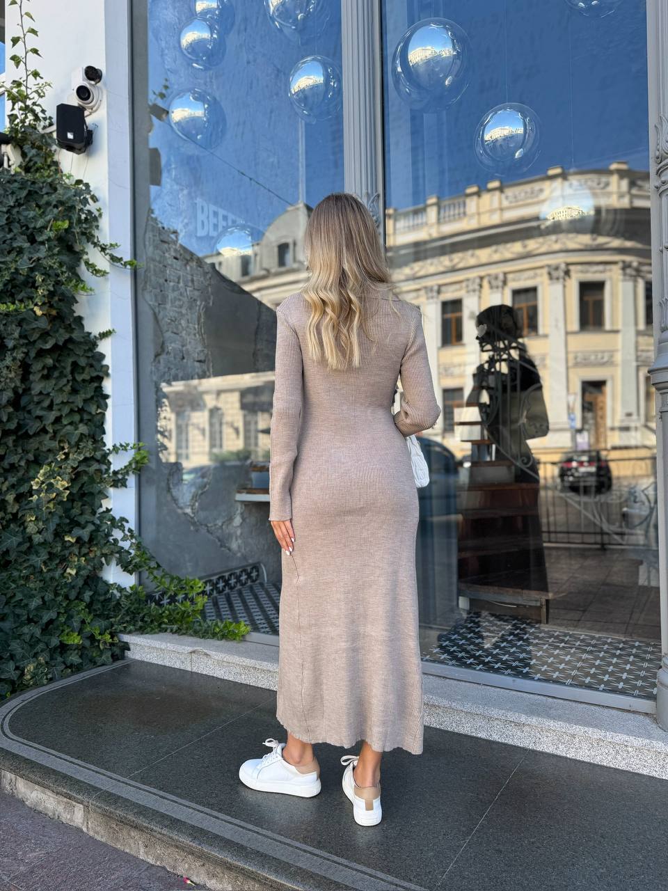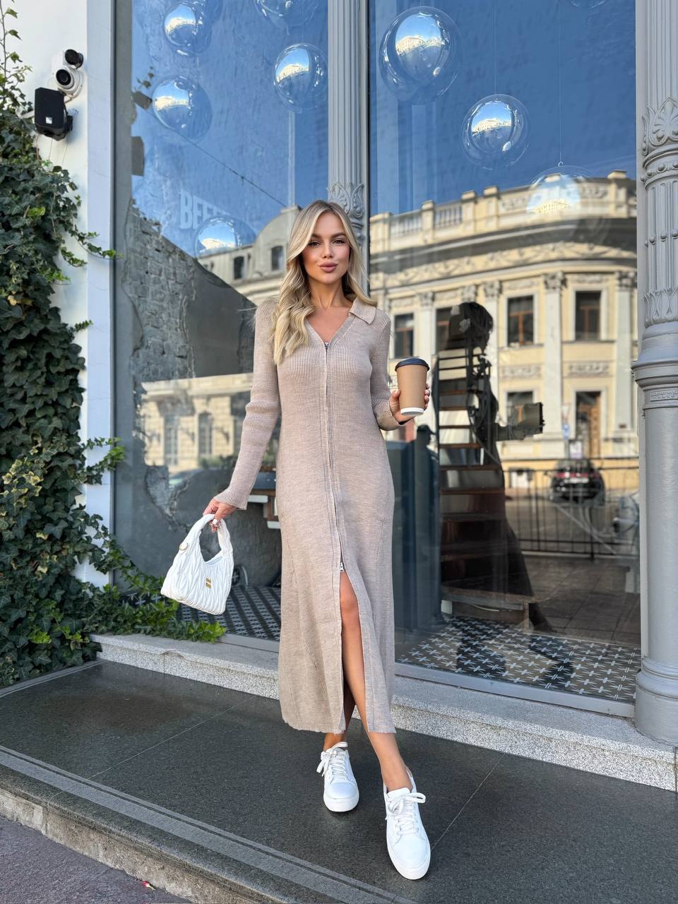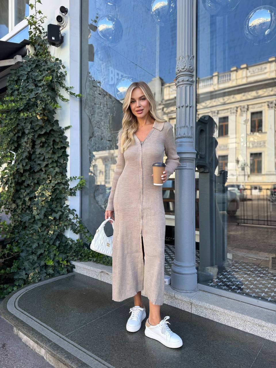 Жіноча Трикотажна Бежева Сукня Поло Міді – Довга на Блискавці з Вирізом Спереду