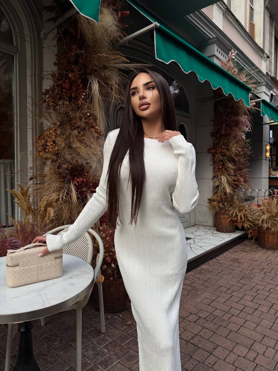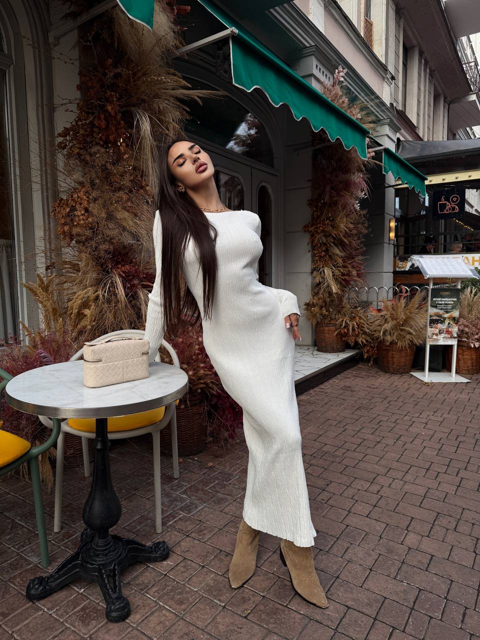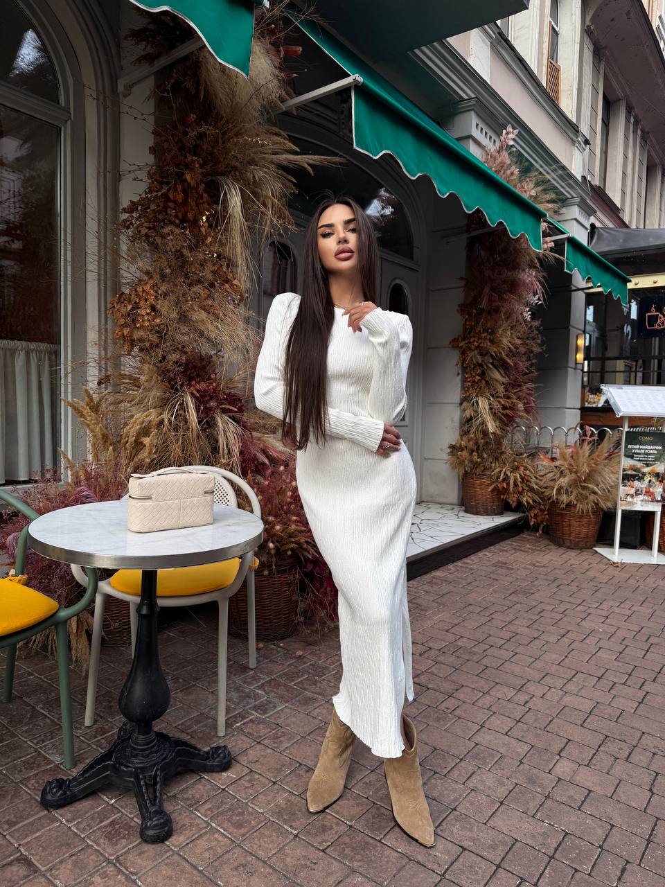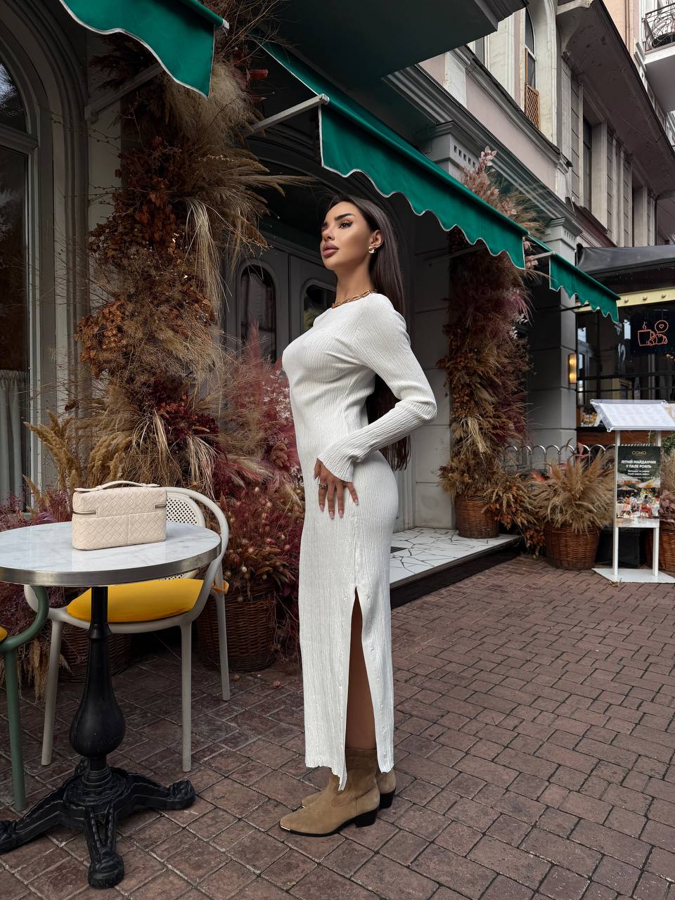Жіноча Трикотажна Біла Сукня Максі Облягаючого Крою з Довгими Рукавами і Розрізом Збоку