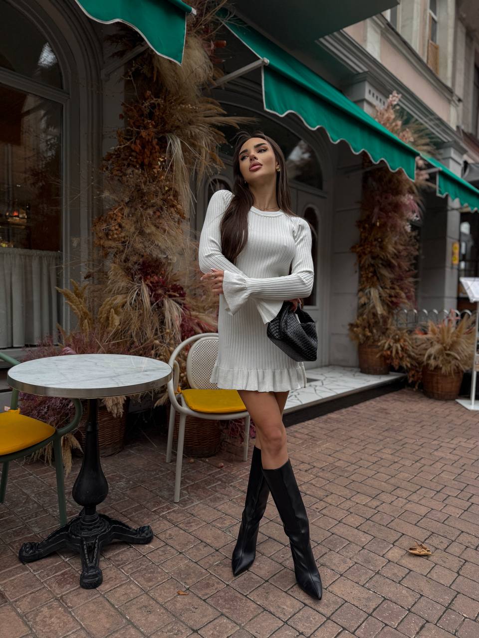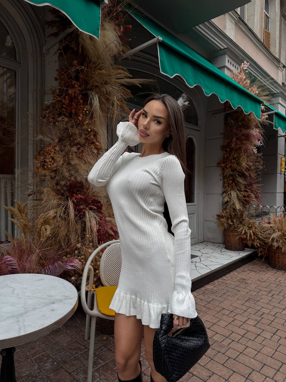 Жіноча Трикотажна Біла Сукня Міні в Широкий Рубчик з Розкльошеними Рукавами та Спідницею