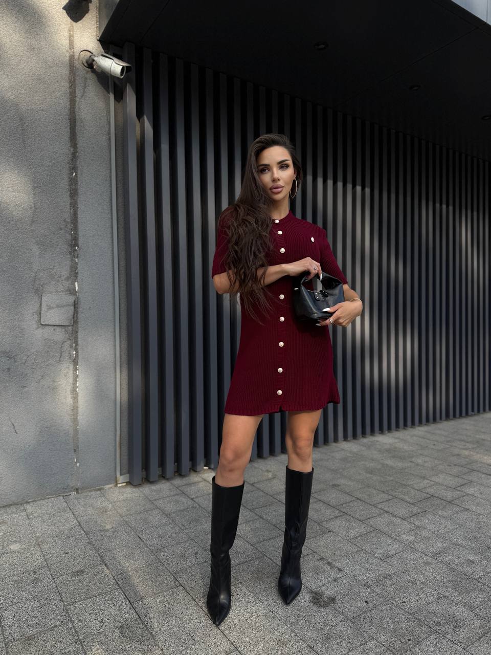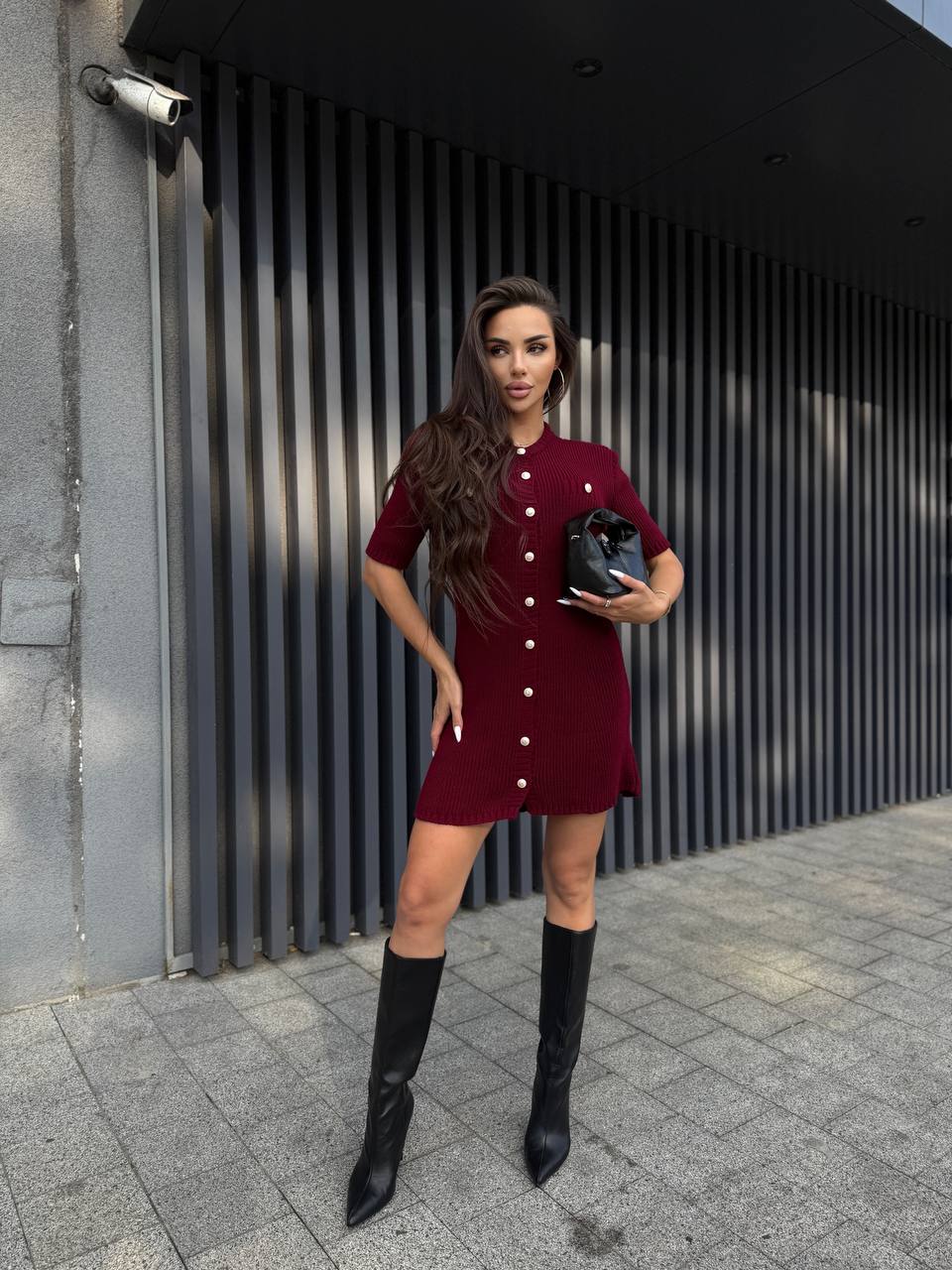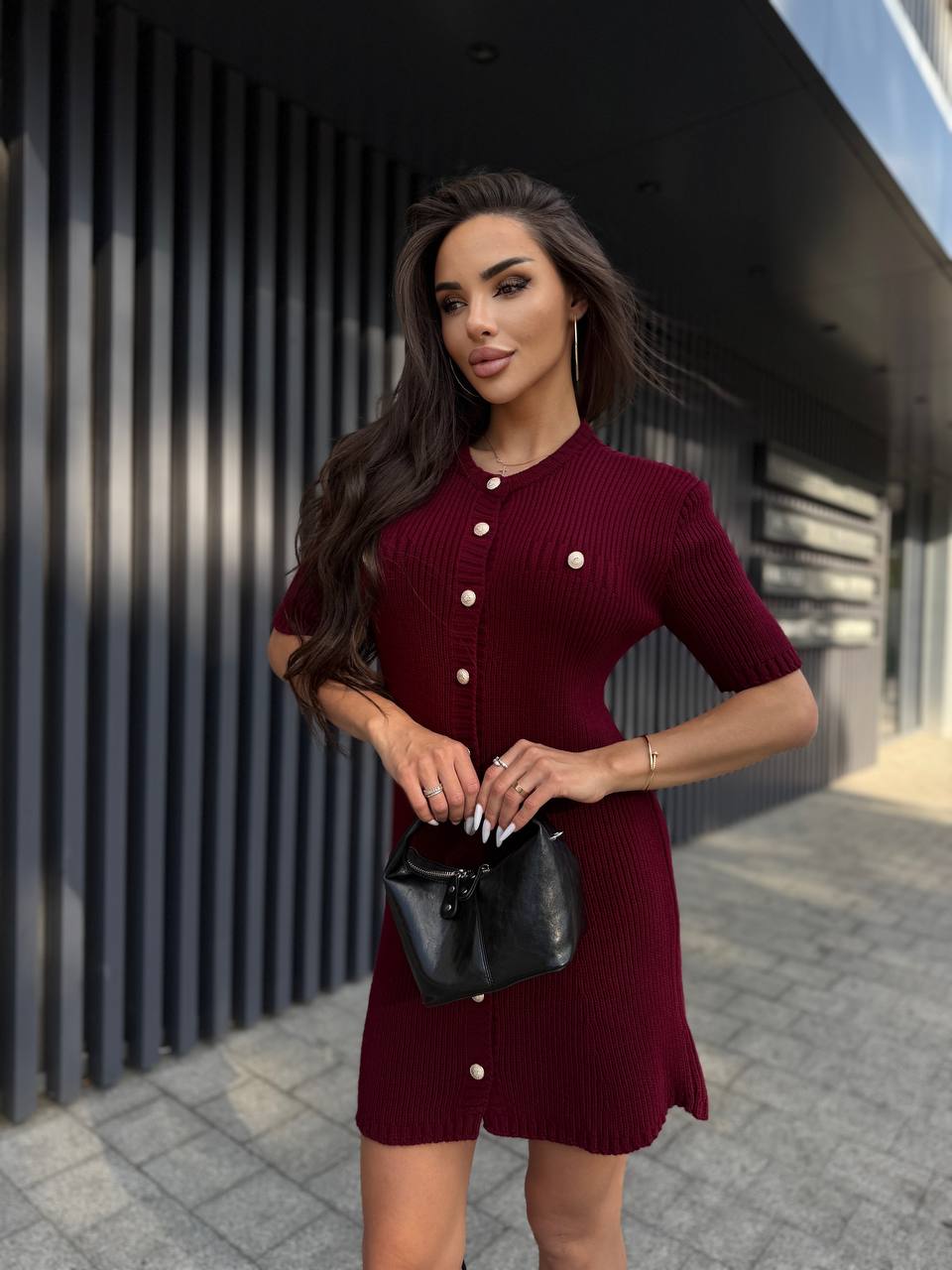 Жіноча Трикотажна Бордова Сукня Міні на Ґудзиках з Короткими Рукавами