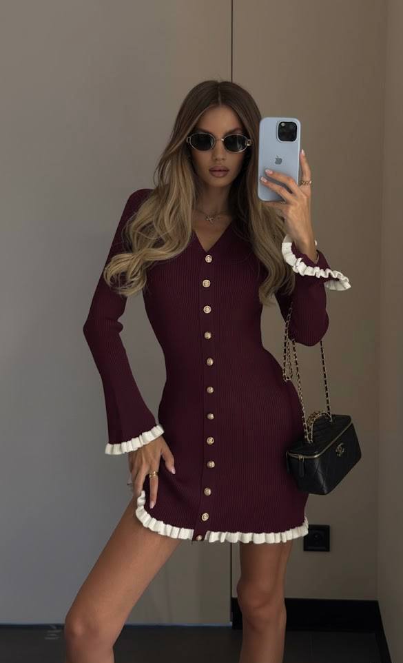Жіноча Трикотажна Бордова Сукня Поло Міні з Коміром і Білими Рюшами