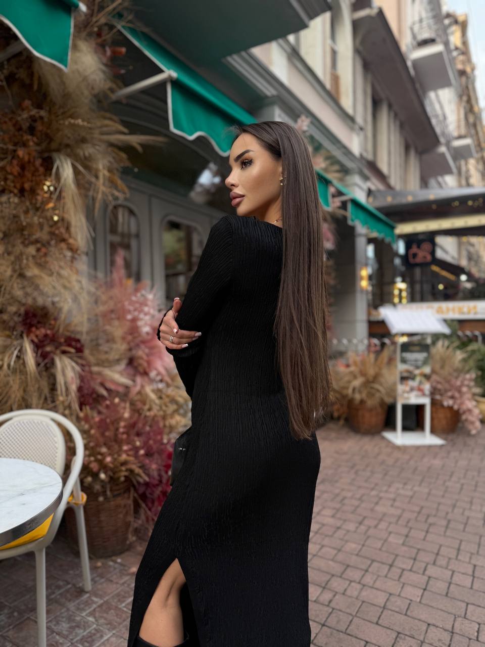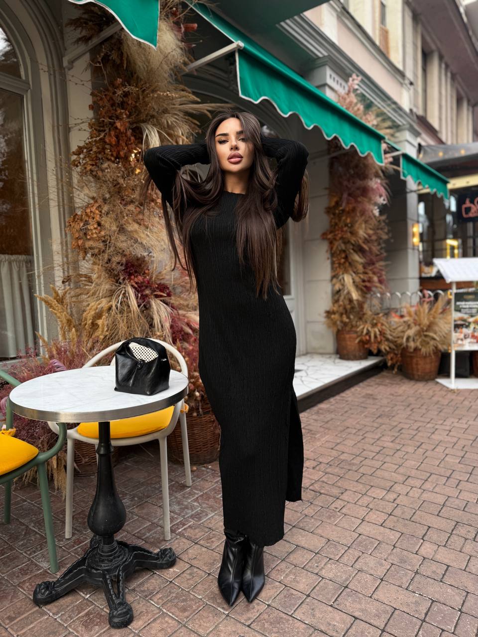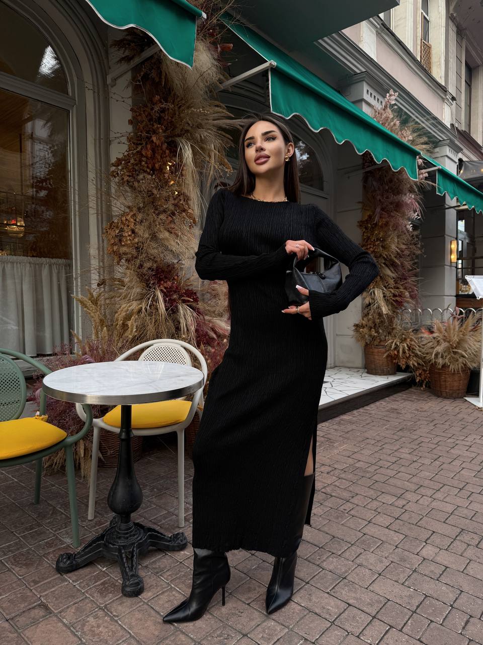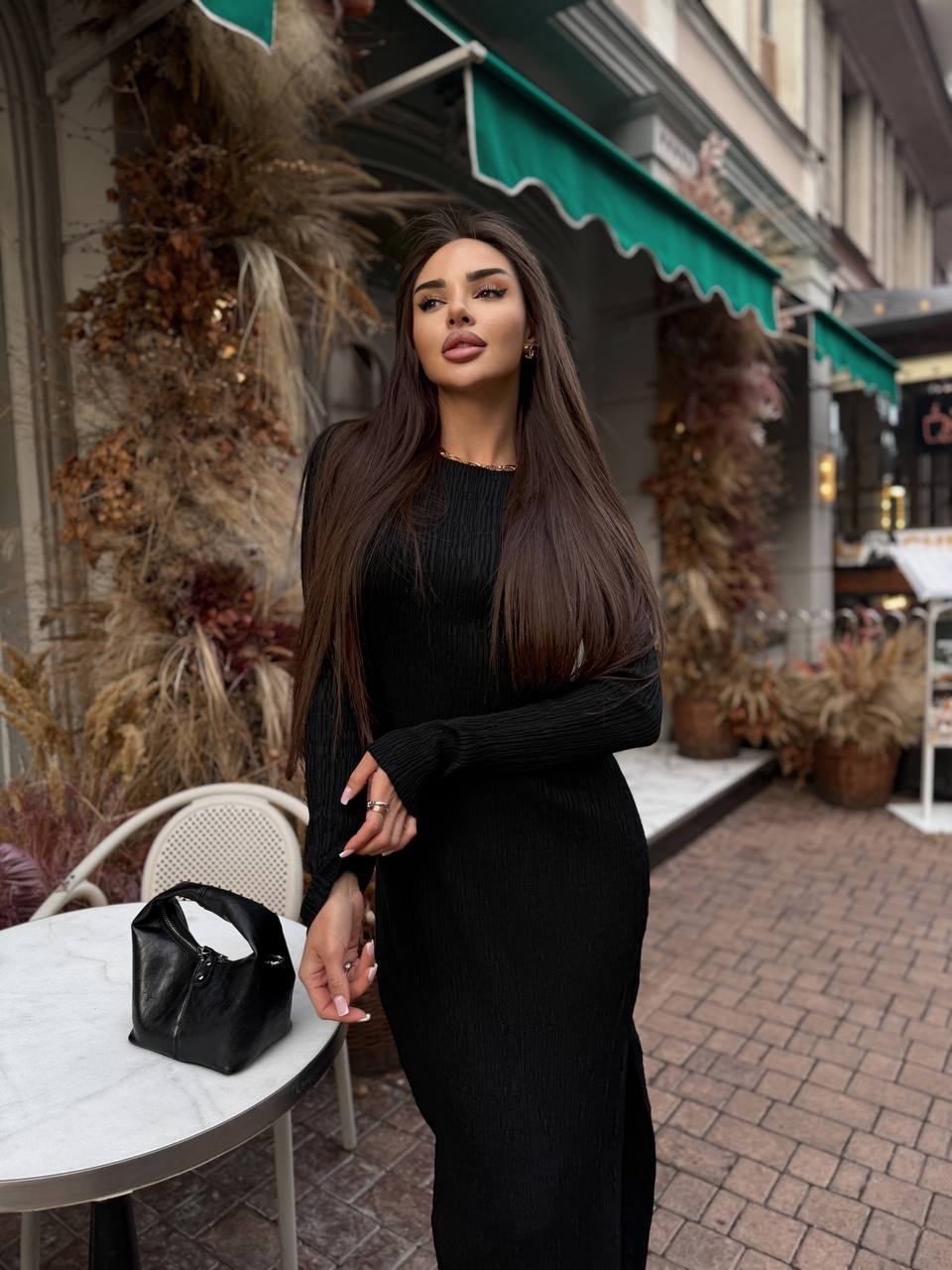 Жіноча Трикотажна Чорна Сукня Максі Облягаючого Крою з Довгими Рукавами і Розрізом Збоку
