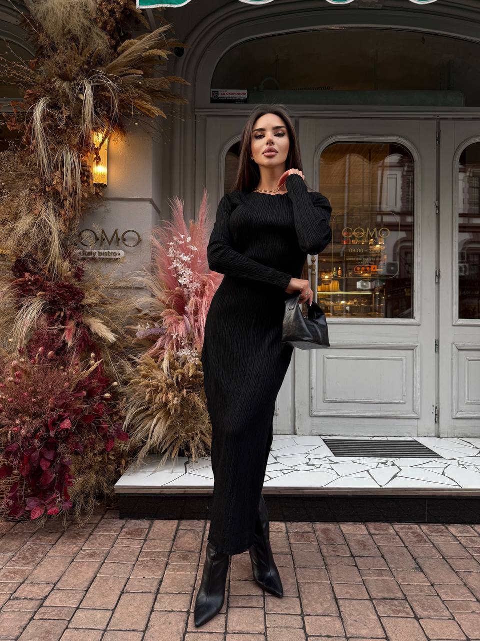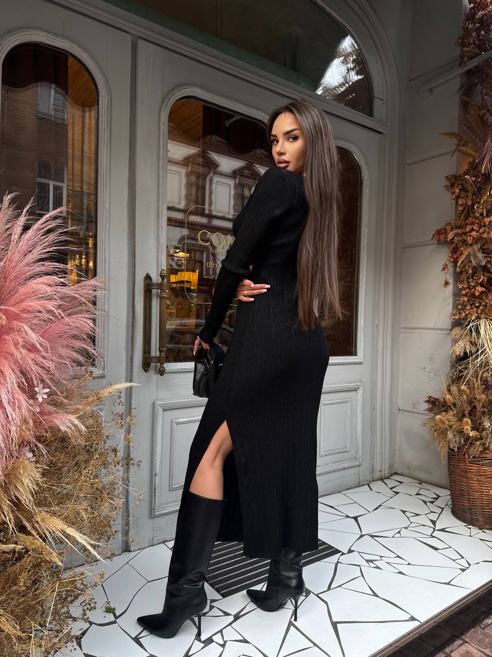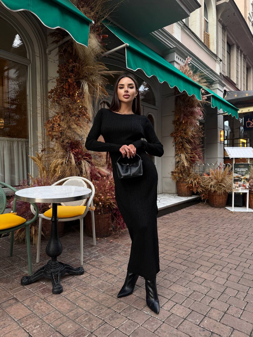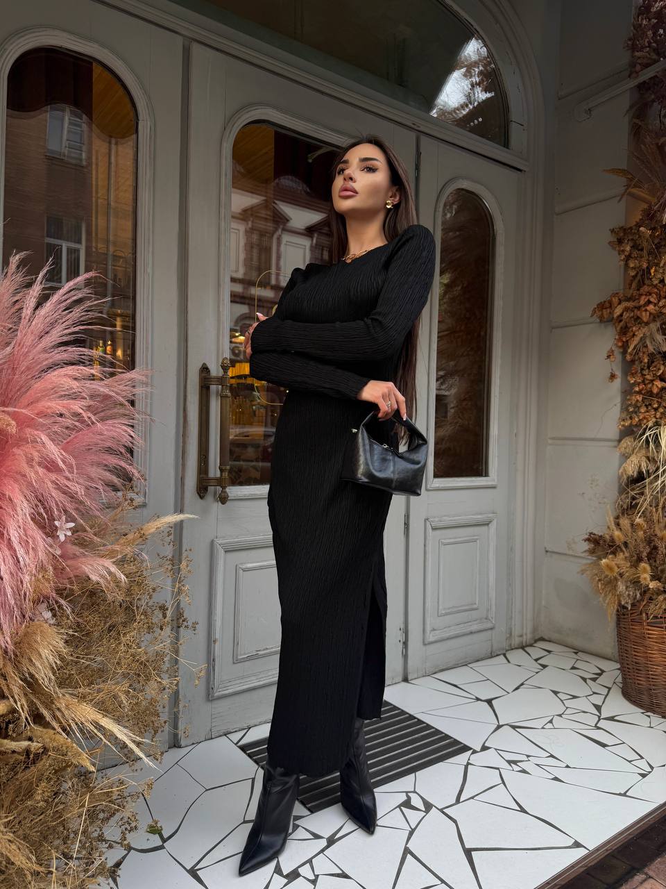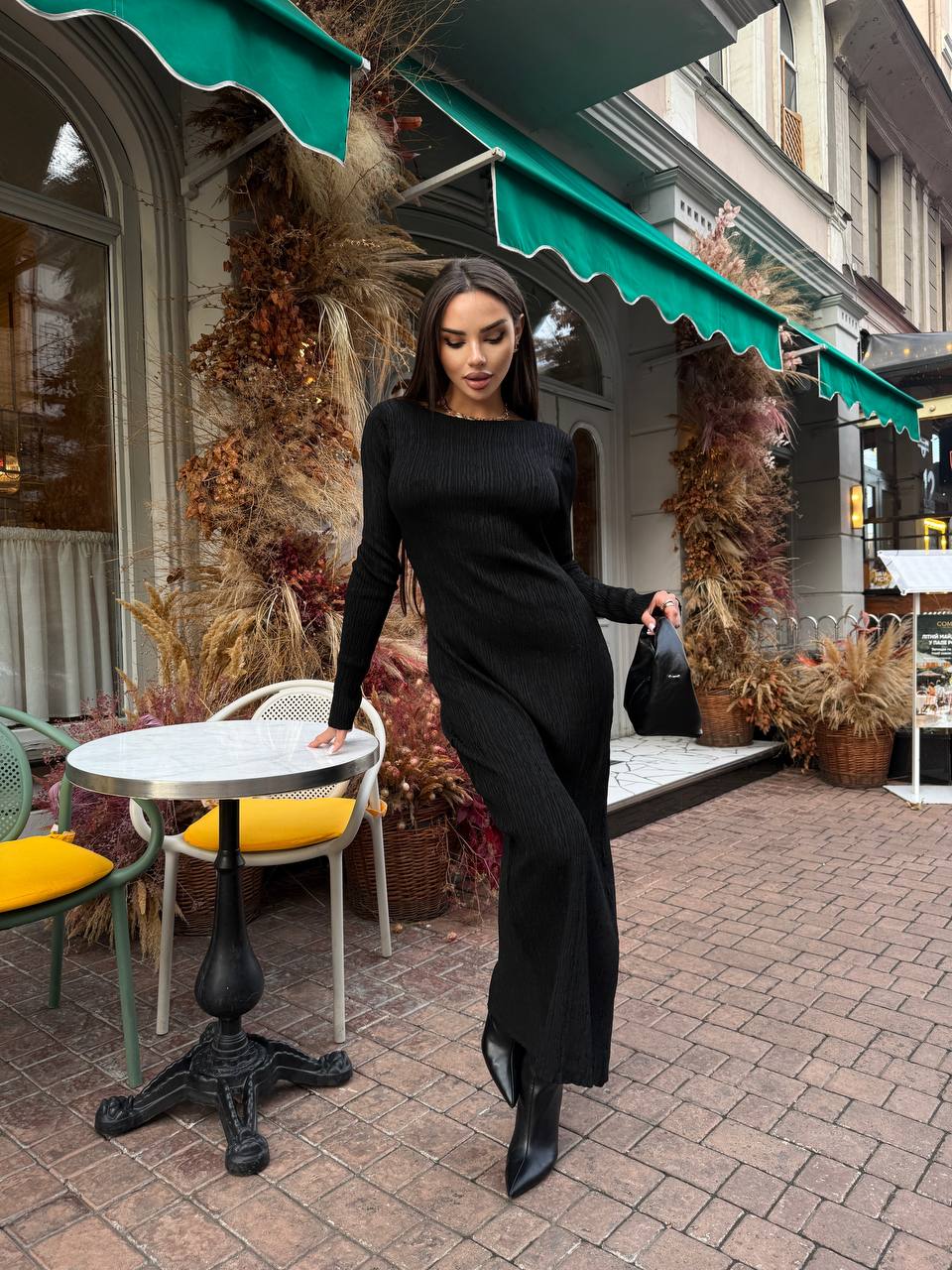 Жіноча Трикотажна Чорна Сукня Максі Облягаючого Крою з Довгими Рукавами і Розрізом Збоку