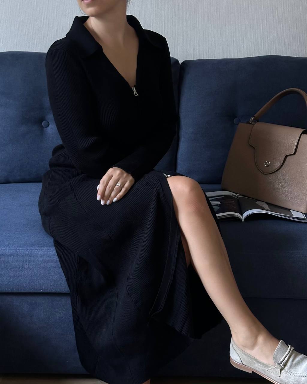 Жіноча Трикотажна Чорна Сукня Поло Міді – Довга на Блискавці з Вирізом Спереду