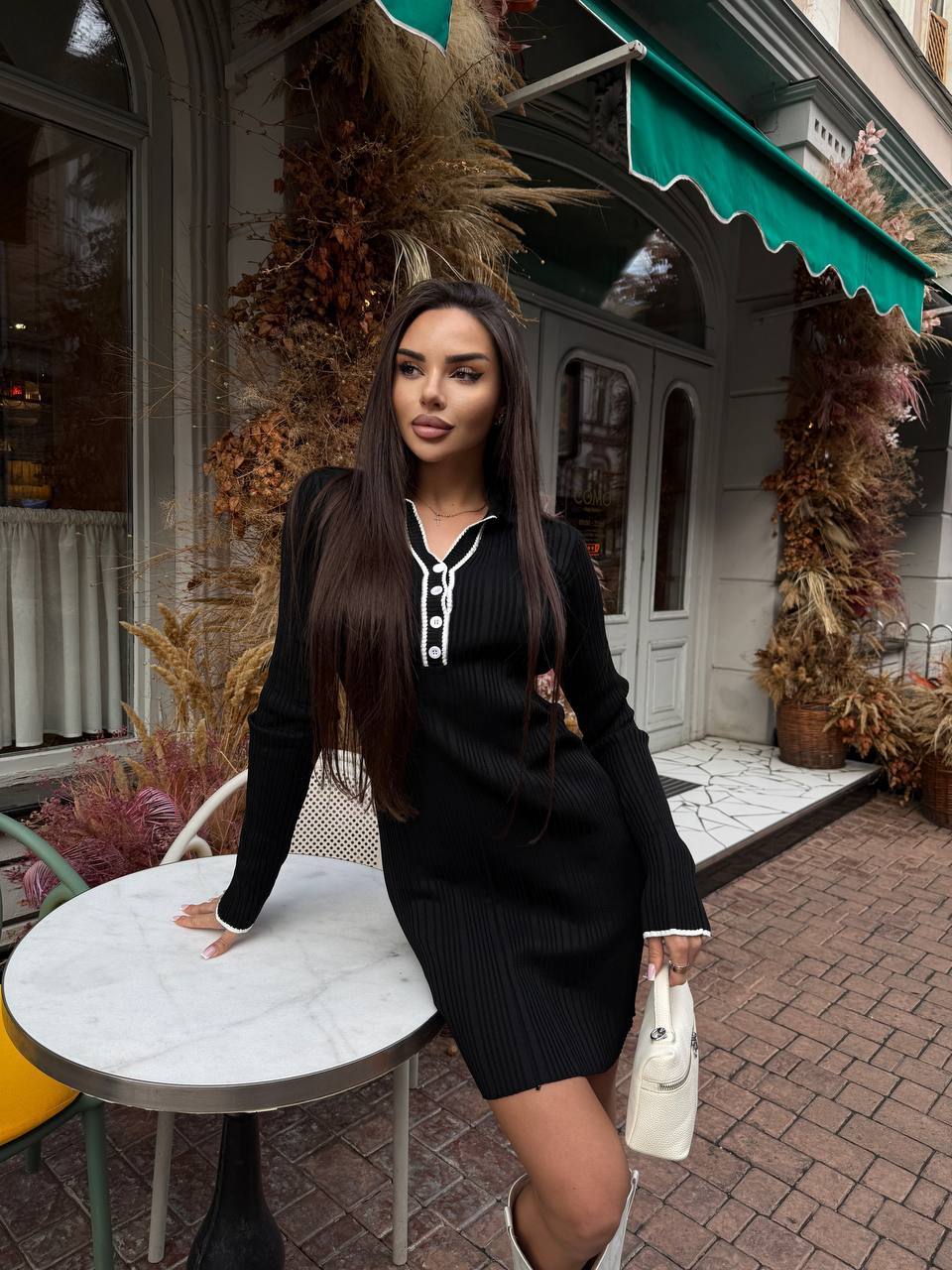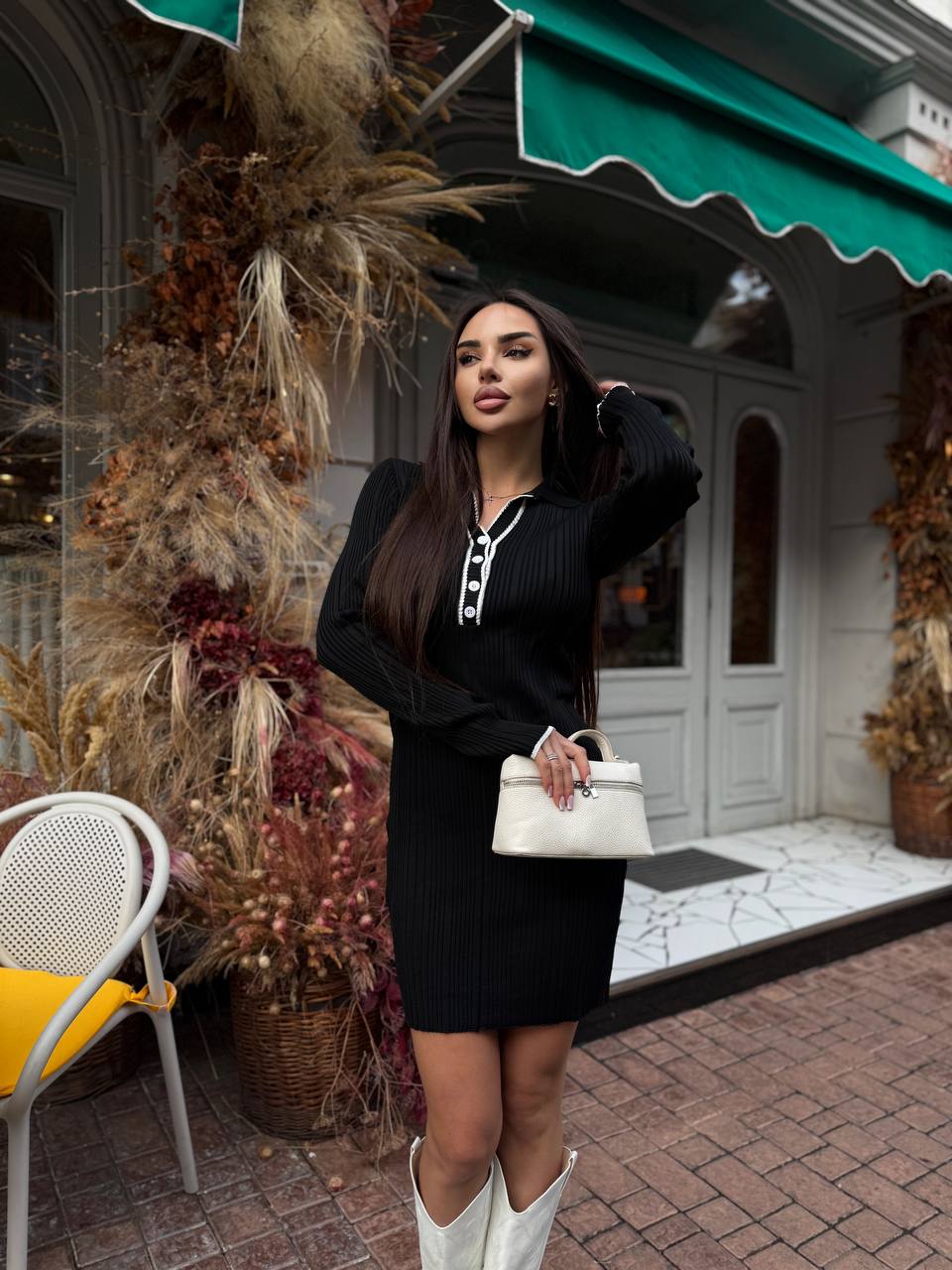 Жіноча Трикотажна Чорна Сукня Поло Міні з Коміром і Довгими Рукавами