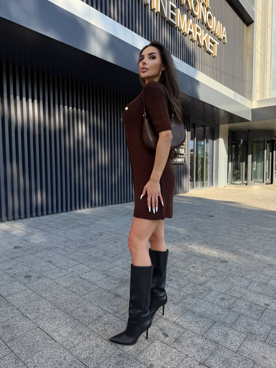 Жіноча Трикотажна Коричнева Сукня Міні на Ґудзиках з Короткими Рукавами