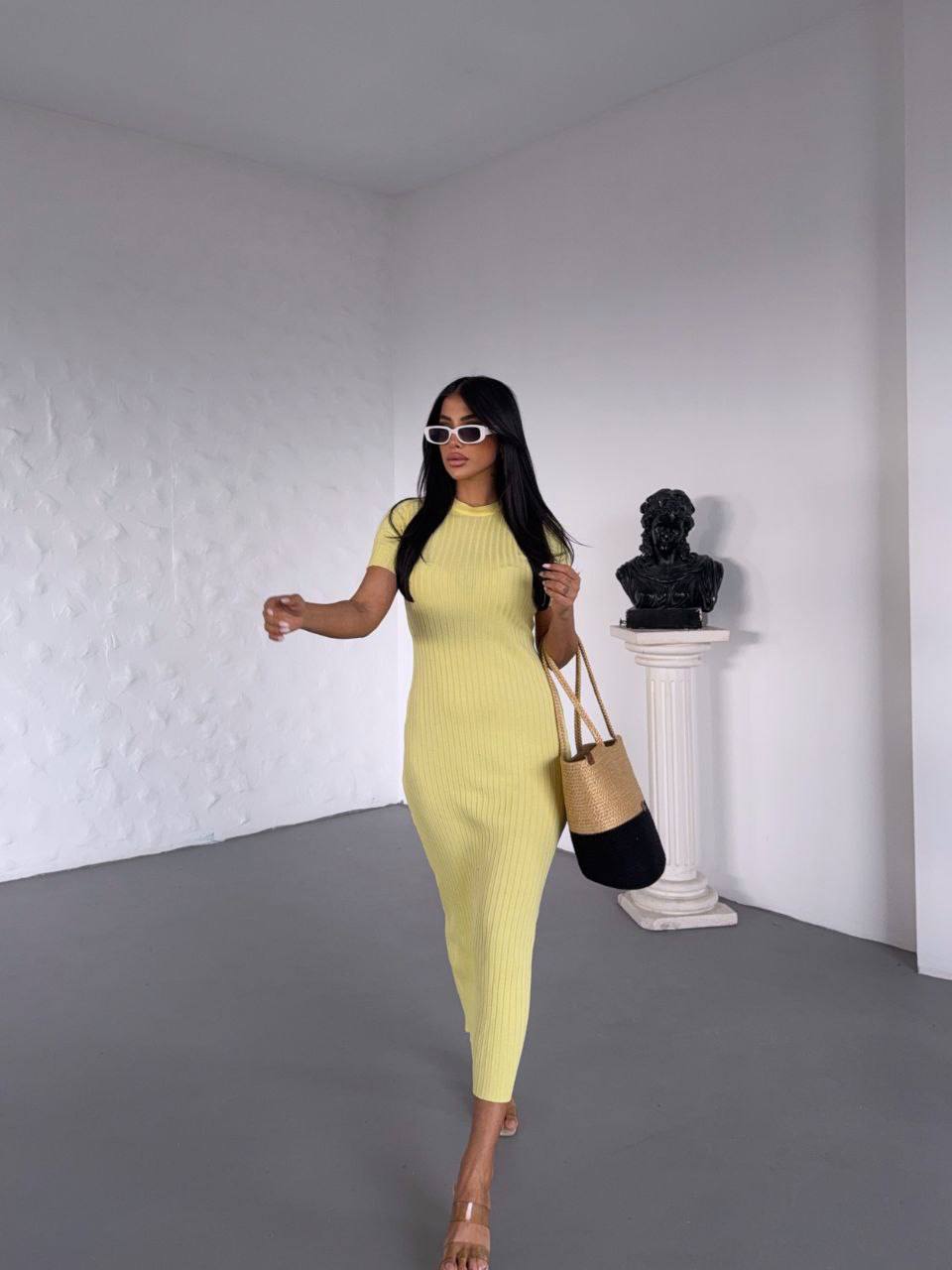 Жіноча Трикотажна Приталена Жовта Сукня Міді з Короткими Рукавами та Зав’язкою на Талії Позаду