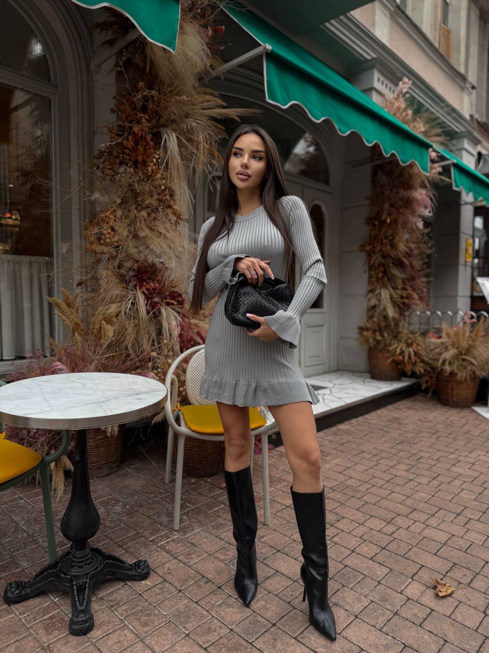Жіноча Трикотажна Сіра Сукня Міні в Широкий Рубчик з Розкльошеними Рукавами та Спідницею