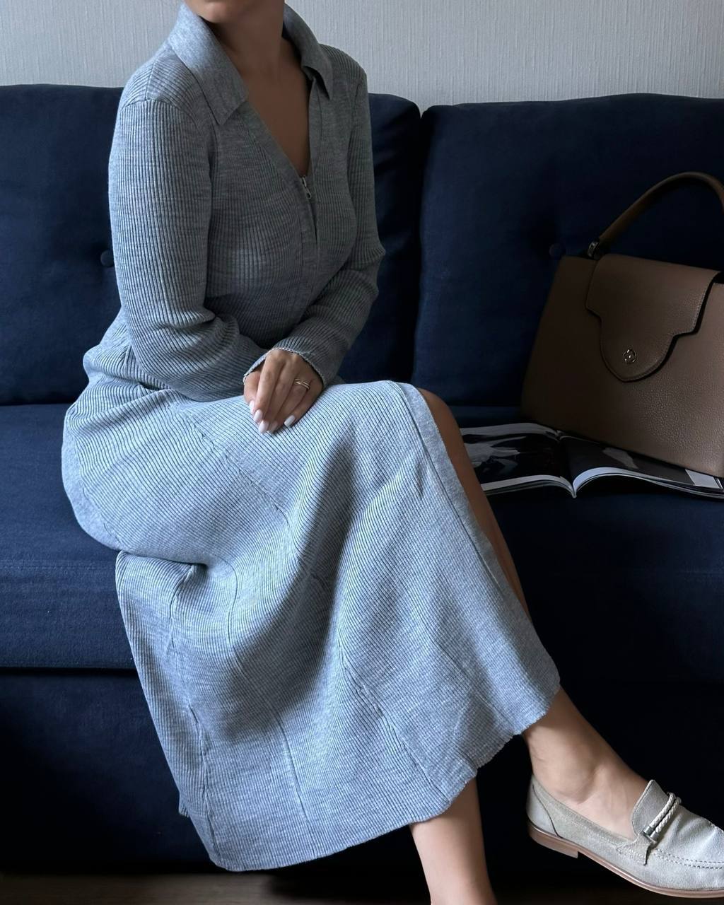 Жіноча Трикотажна Сіра Сукня Поло Міді – Довга на Блискавці з Вирізом Спереду