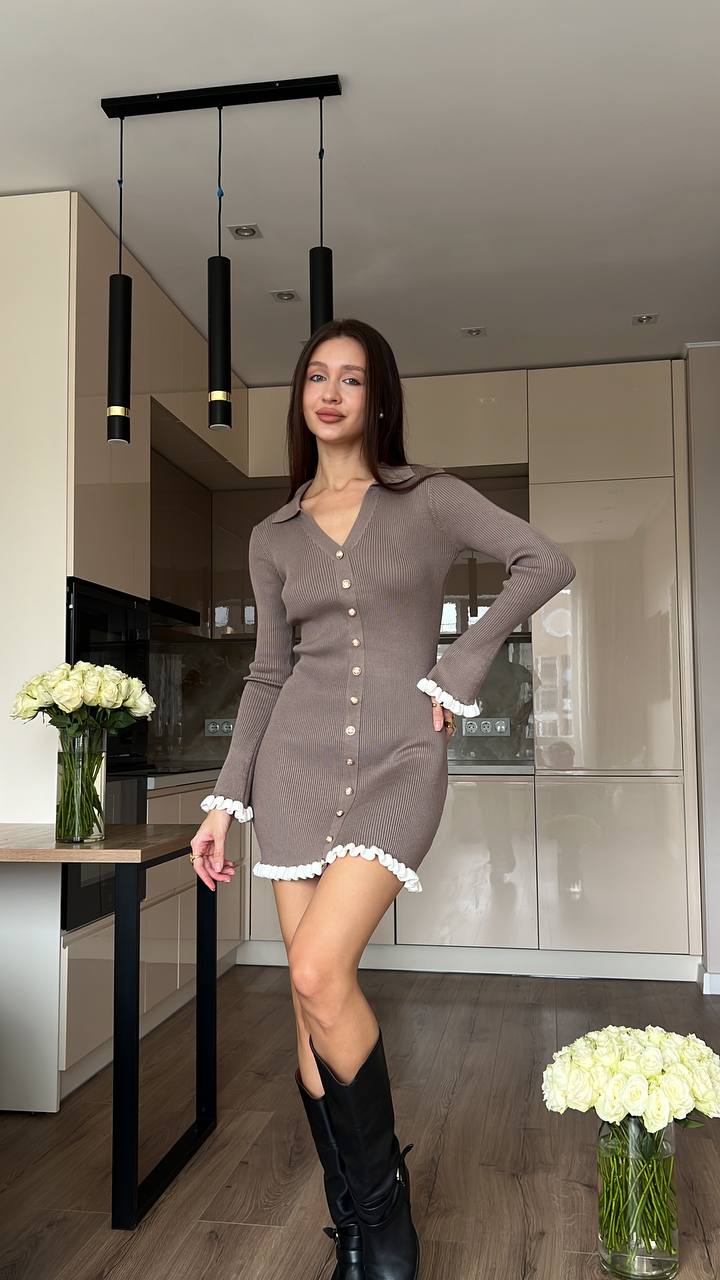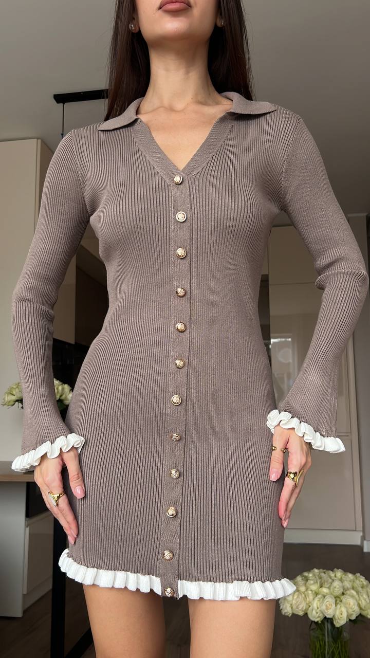 Жіноча Трикотажна Сукня Поло Мокко Міні з Коміром і Білими Рюшами