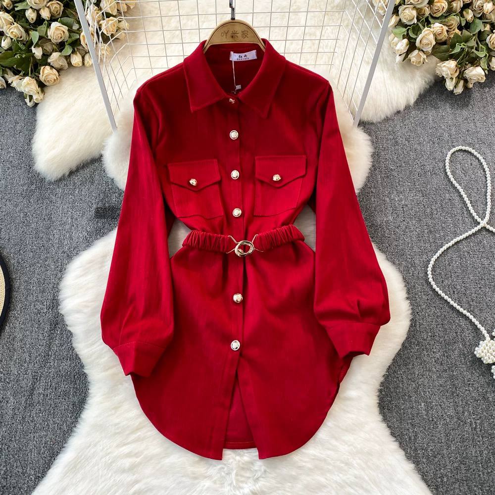 Жіноча Велюрова Червона Сукня-Сорочка на Золотистих Ґудзиках з Поясом