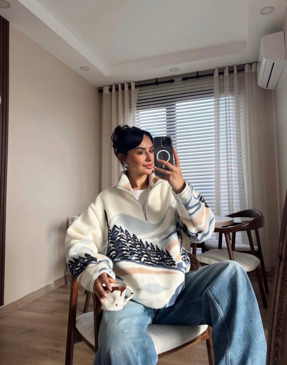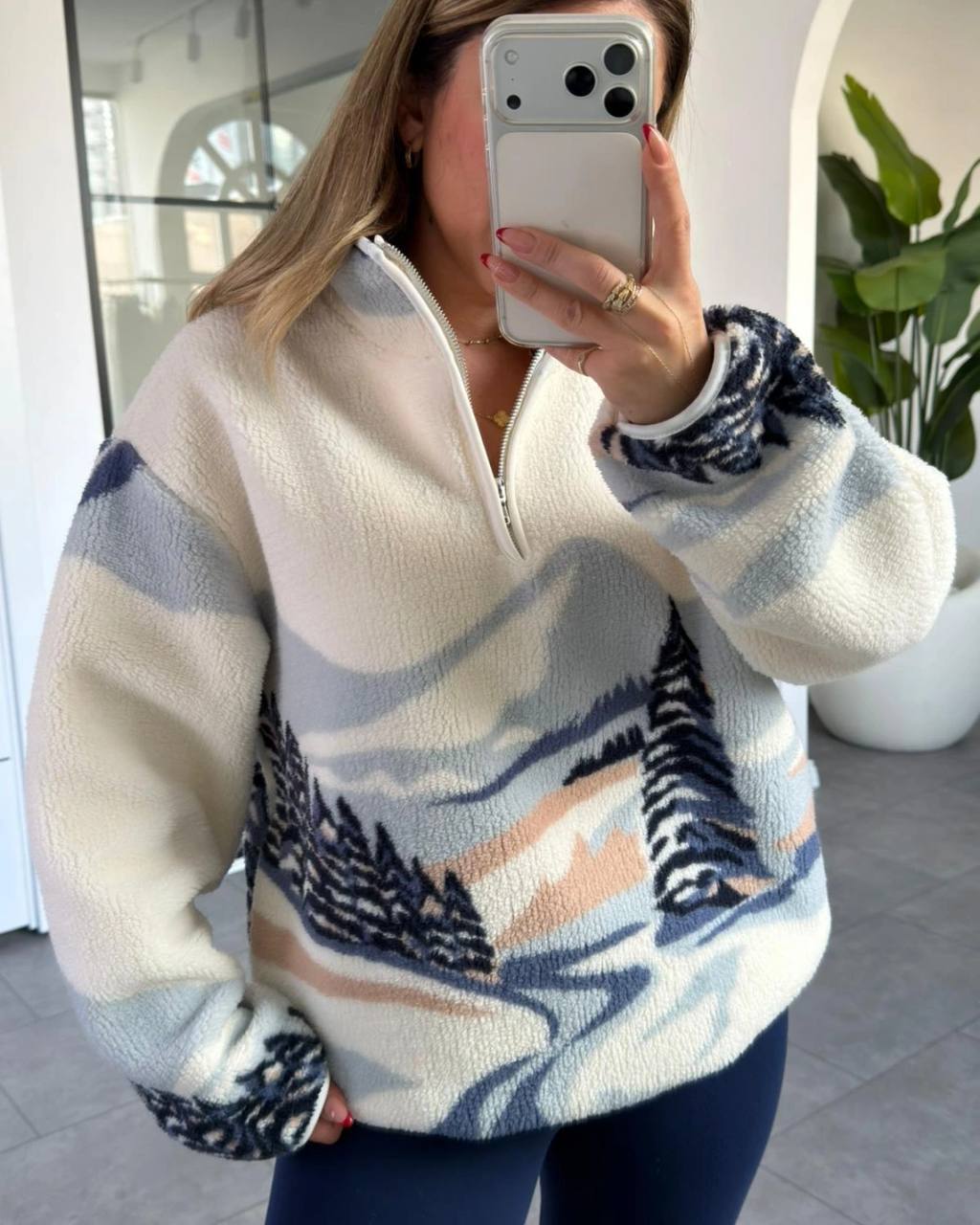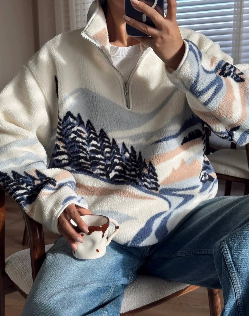 Жіноча Тепла Флісова Біла Кофта з Принтом – Фліска Оверсайз з Високою Горловиною на Змійці