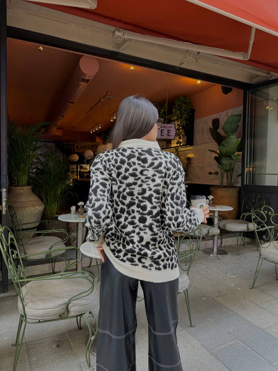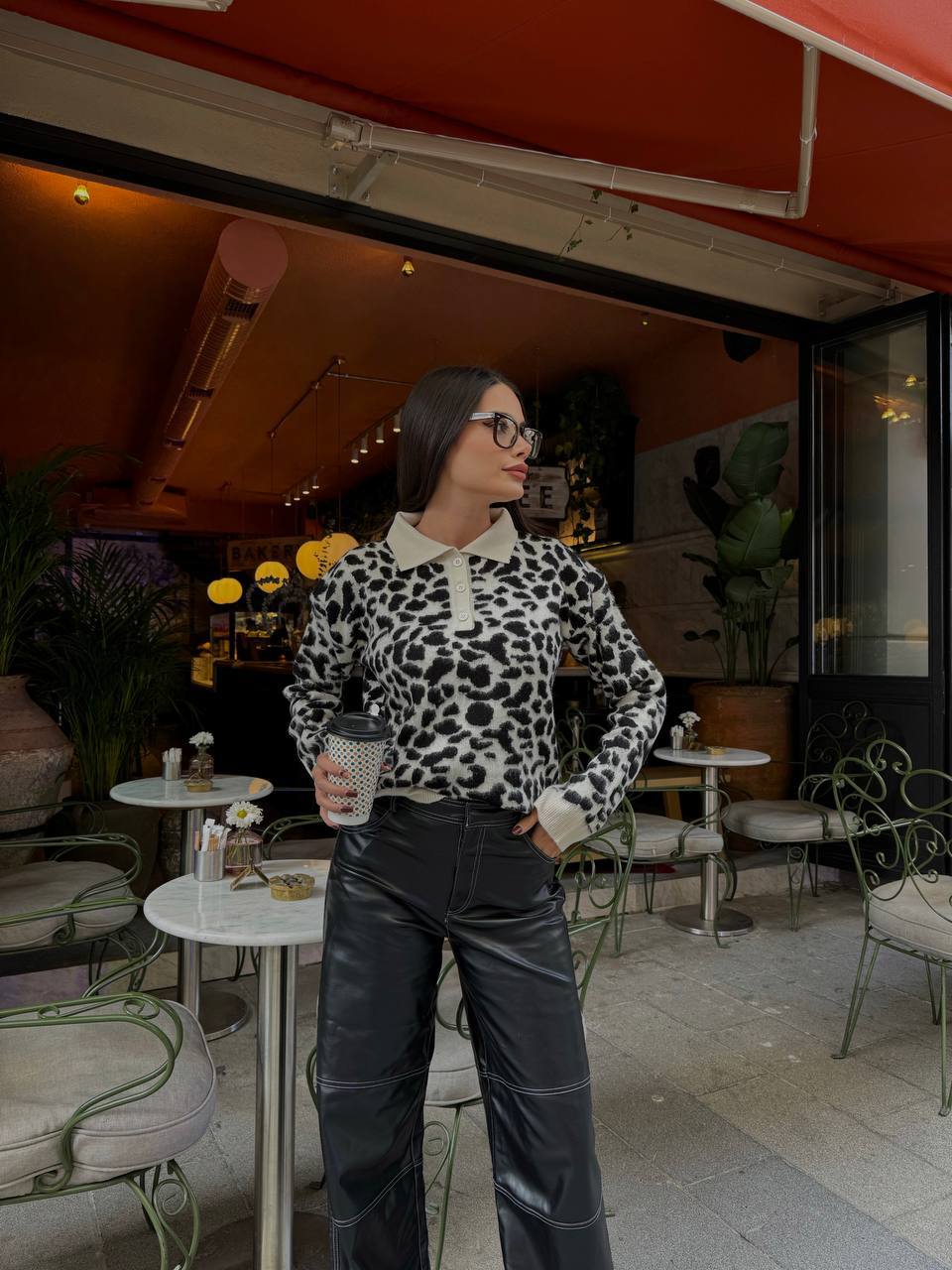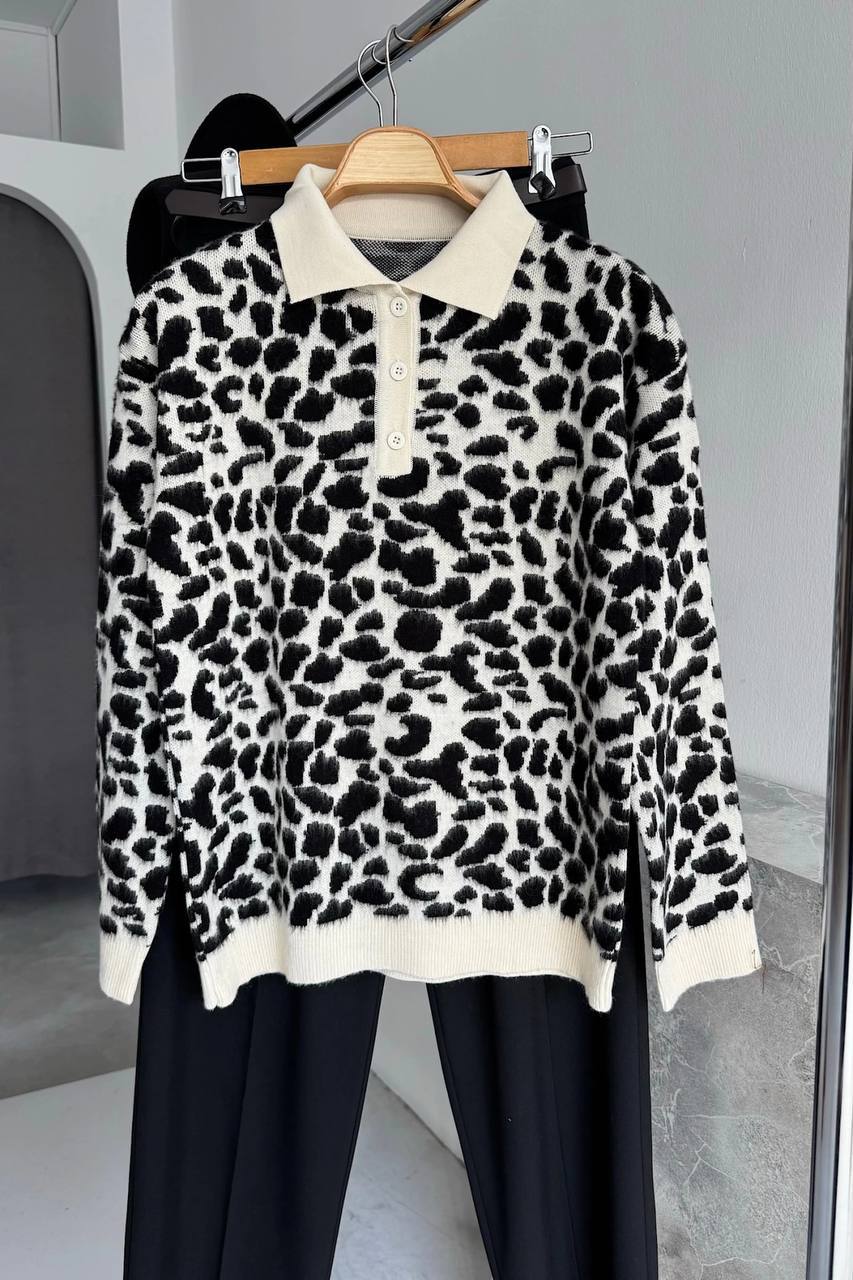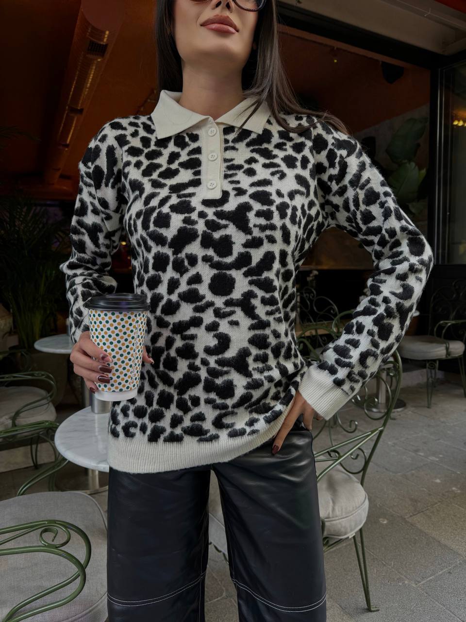Жіночий Білий Светр з Коміром Поло в Леопардовий Принт