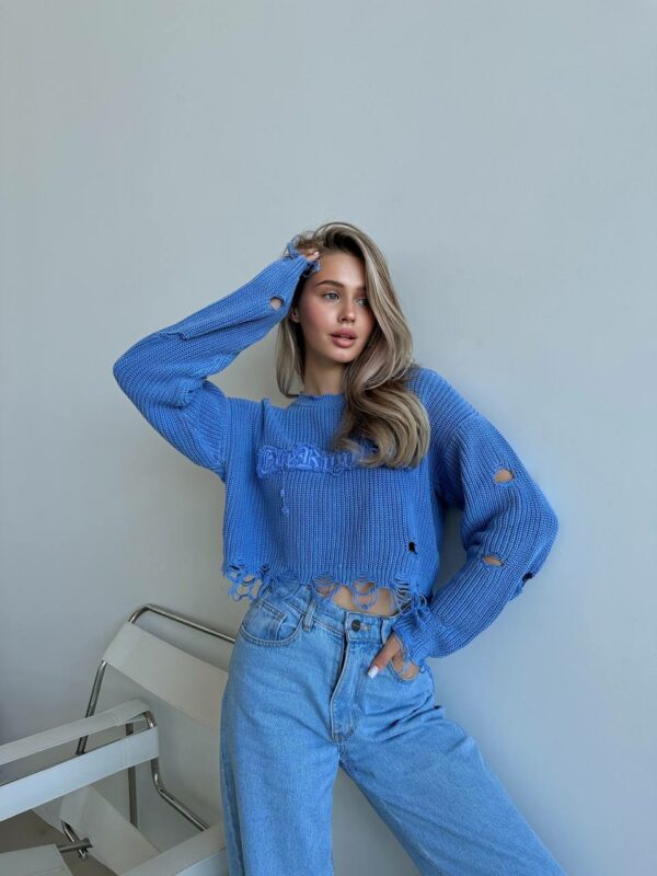 Жіночий Блакитний Cветр Варьонка – Вкорочений В’язаний Рваний з Нашивкою Вишивкою