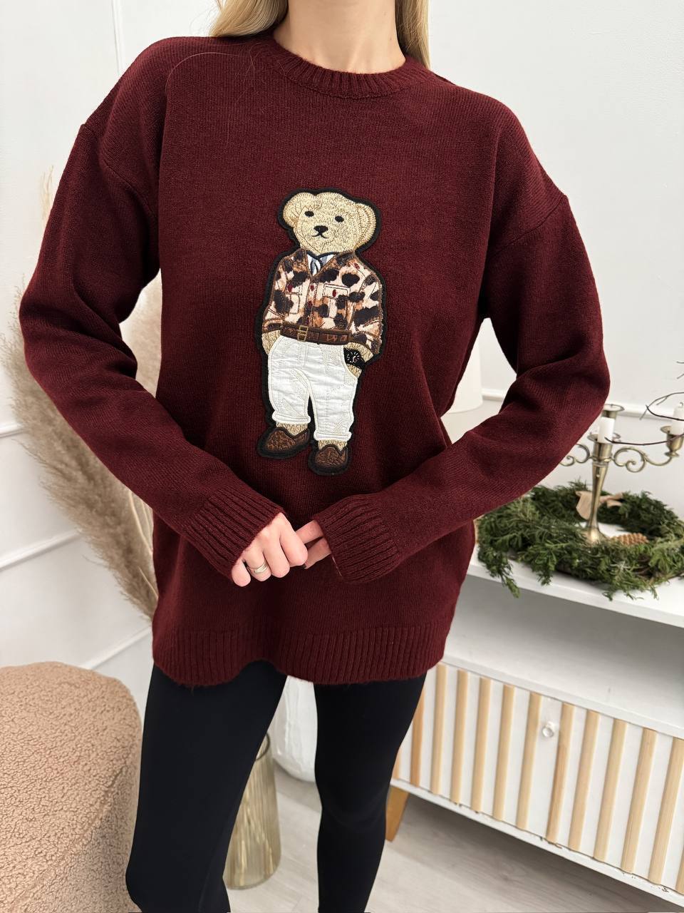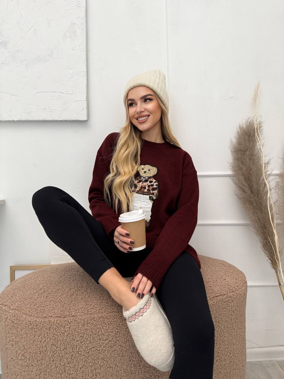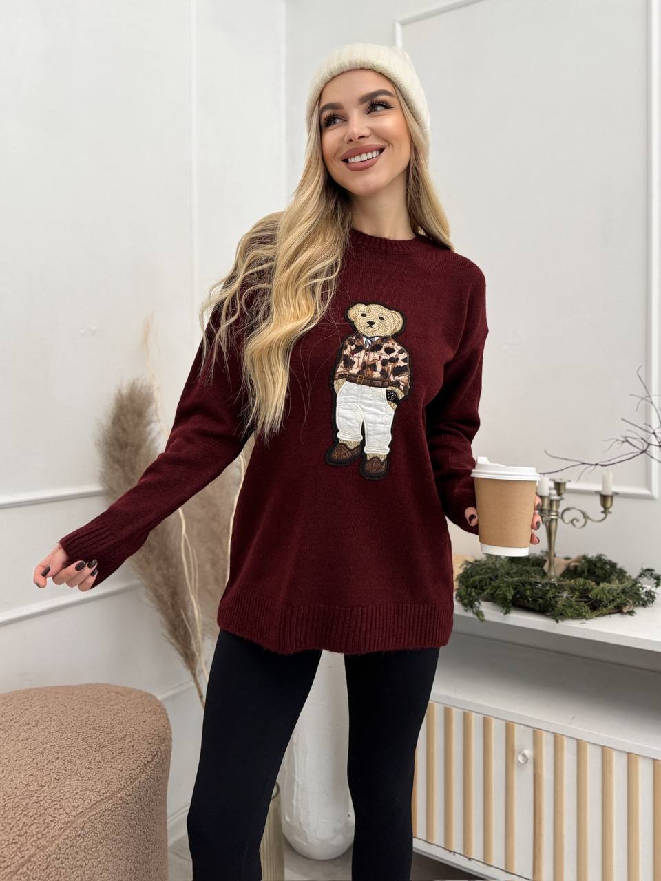 Жіночий Бордовий Светр Вільного Крою з Нашивкою Вишивкою Ведмедиком
