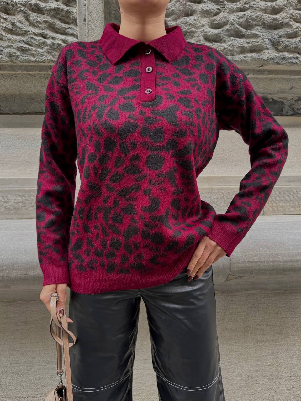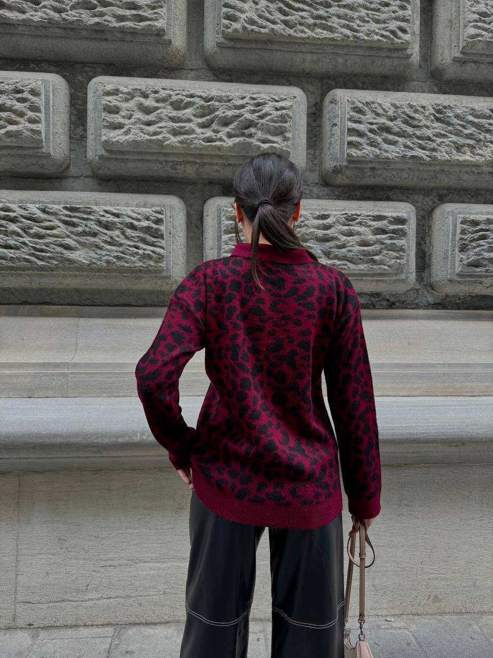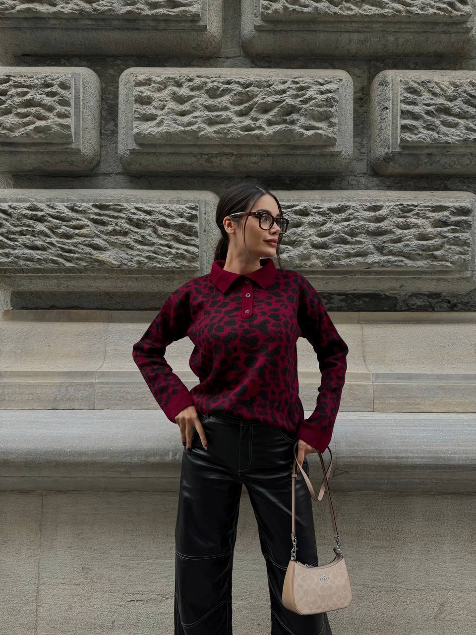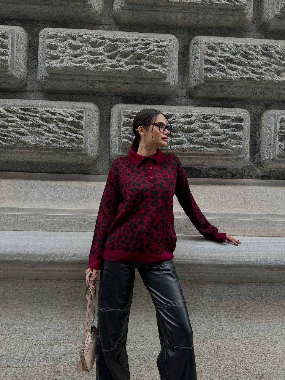 Жіночий Бордовий Светр з Коміром Поло в Леопардовий Принт