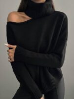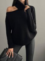 Жіночий Чорний светр вільного крою з об’ємним коміром і вирізом на плечі.