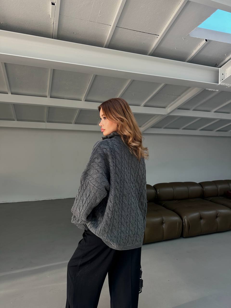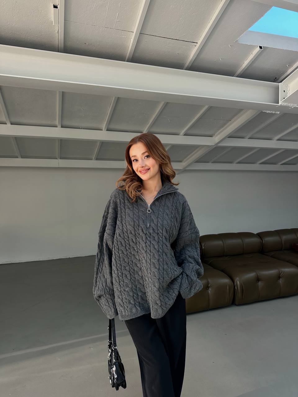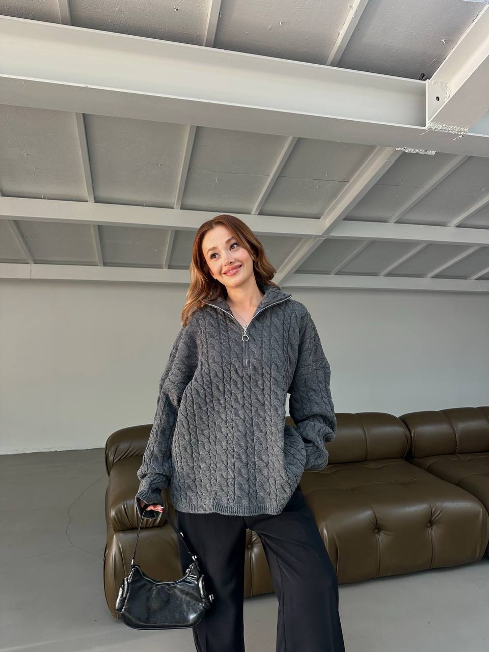 Жіночий Графітовий Светр Джемпер Оверсайз з Високою Горловиною на Змійці та Фактурним Візерунком Косичка