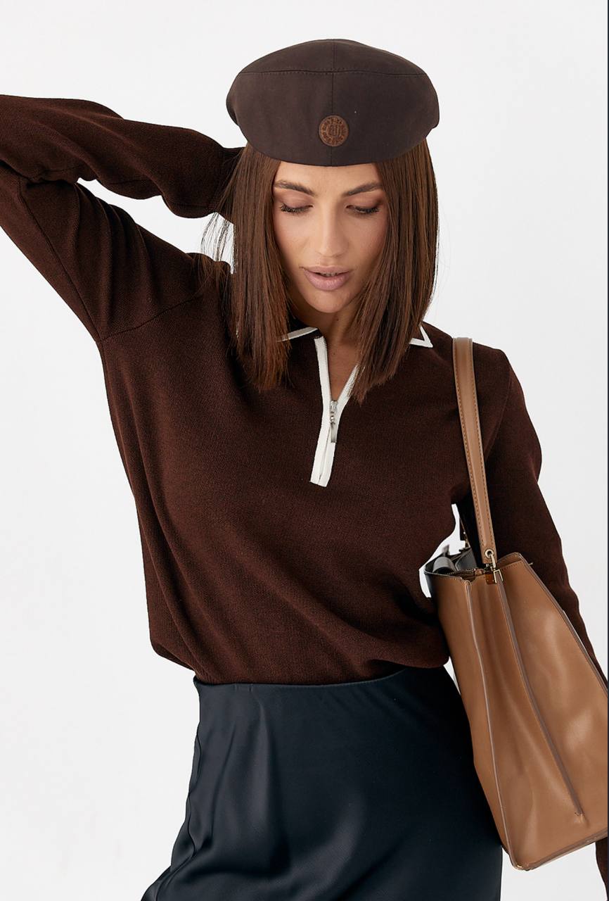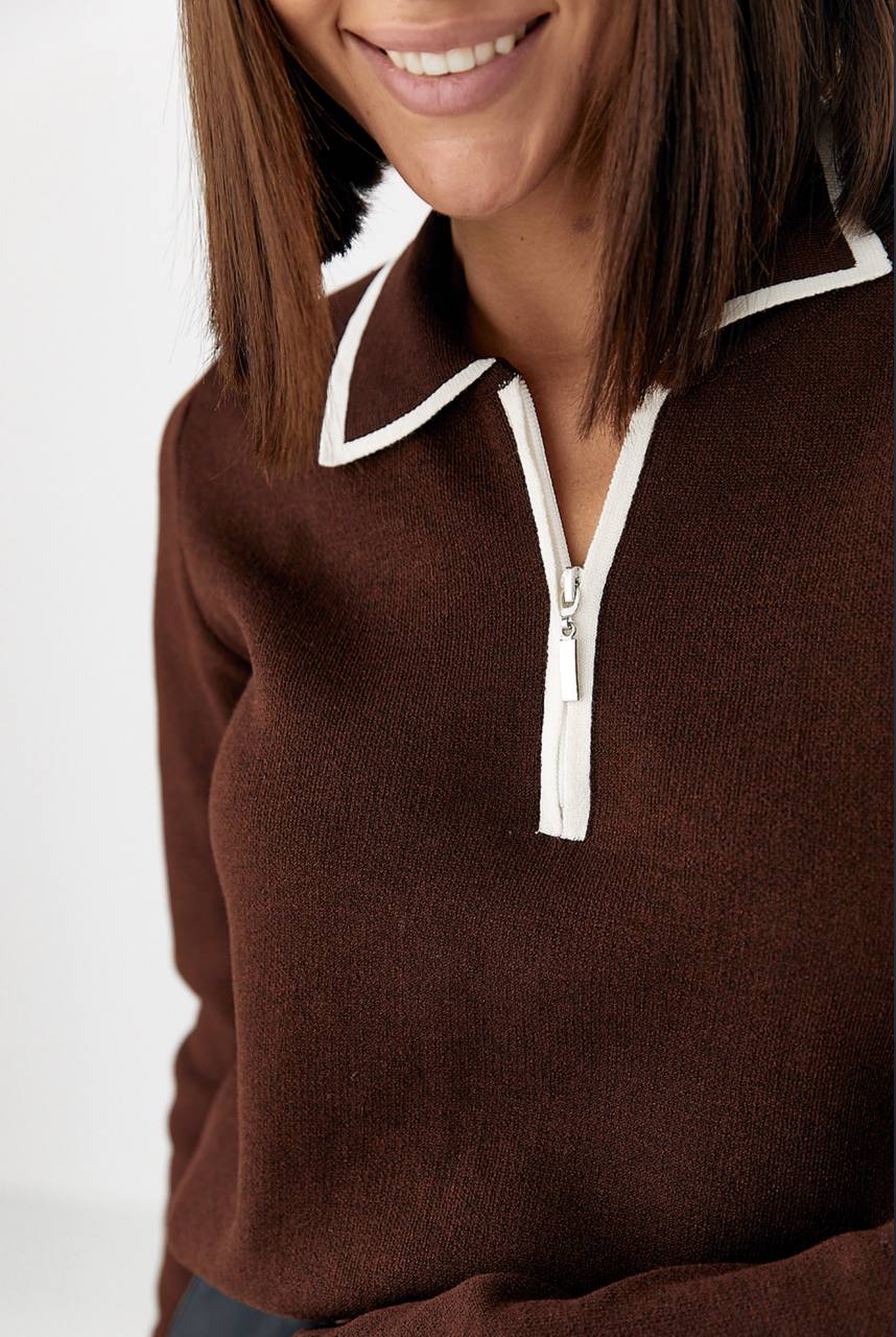 Жіночий Класичний Коричневий Светр Поло з Коміром на Замку та Окантовкою