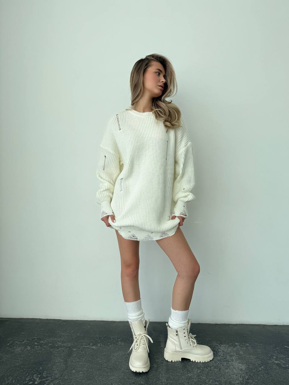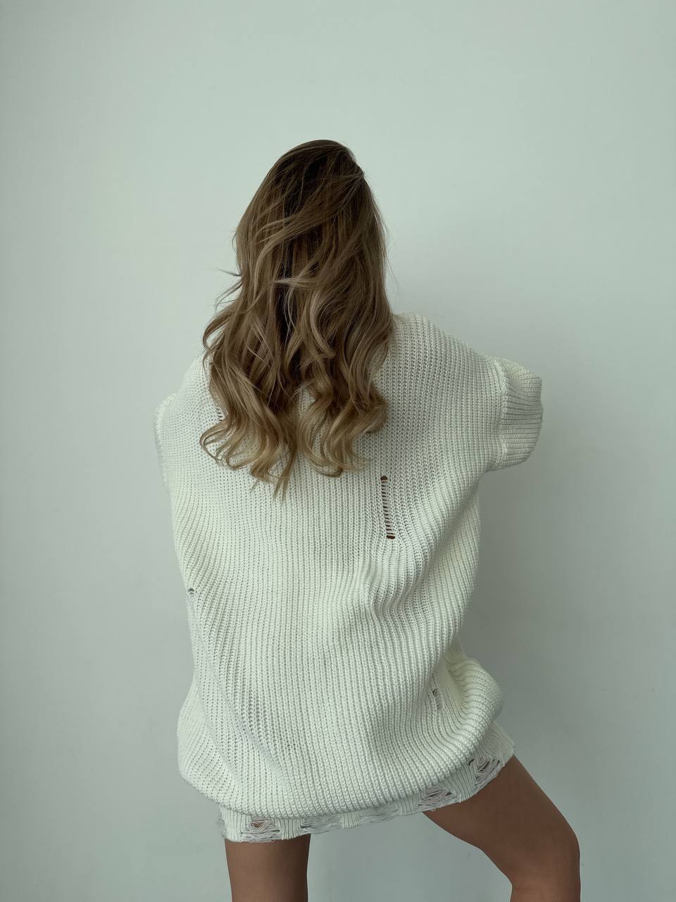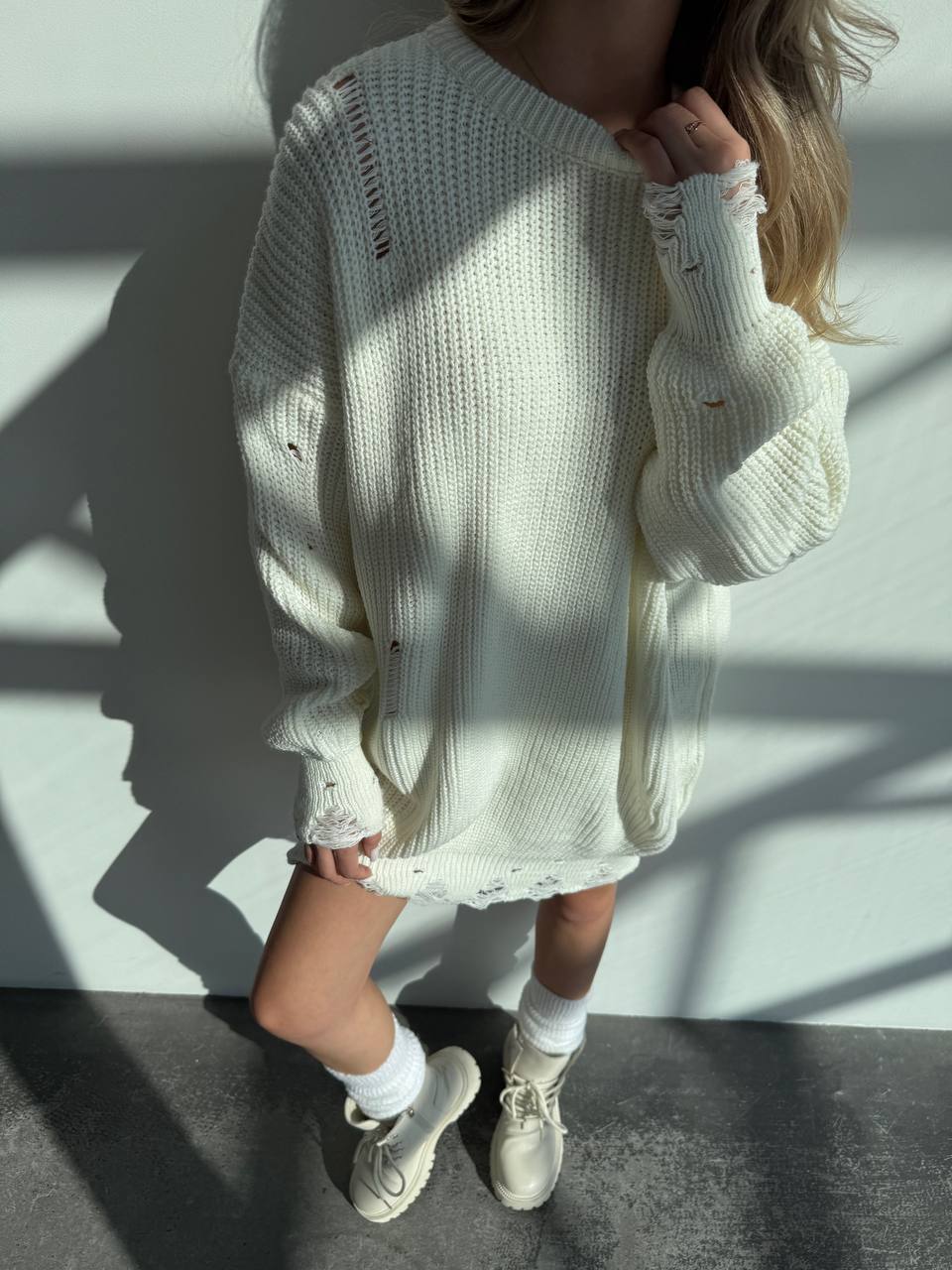 Жіночий Подовжений В’язаний Білий Светр Оверсайз Рваний