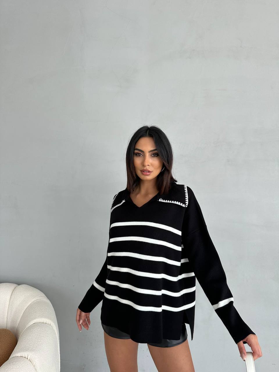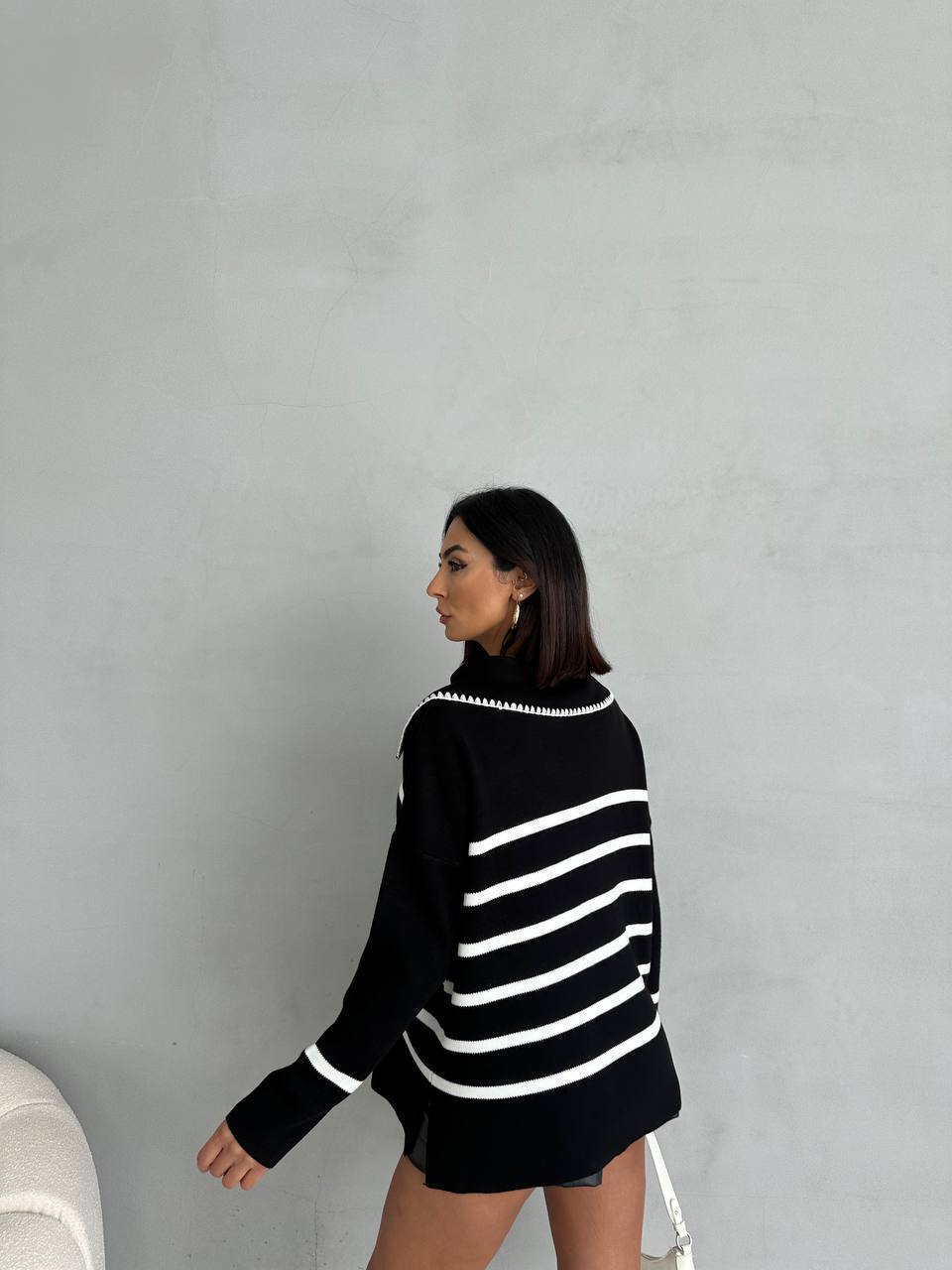 Жіночий Смугастий Чорний Светр Оверсайз з Широким Коміром Поло