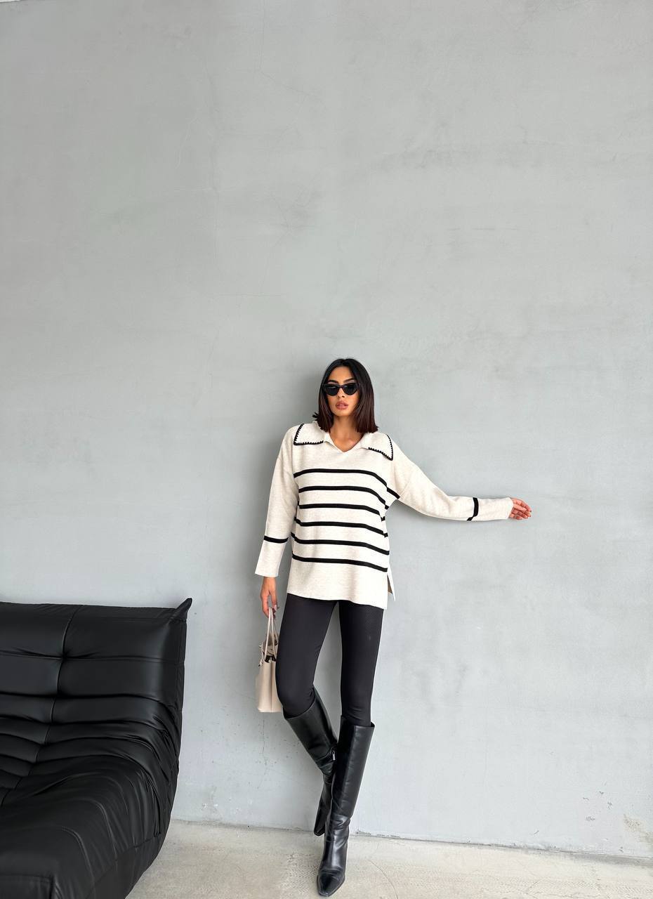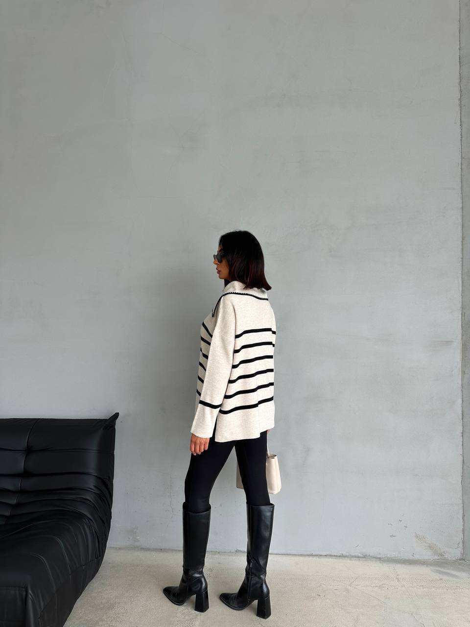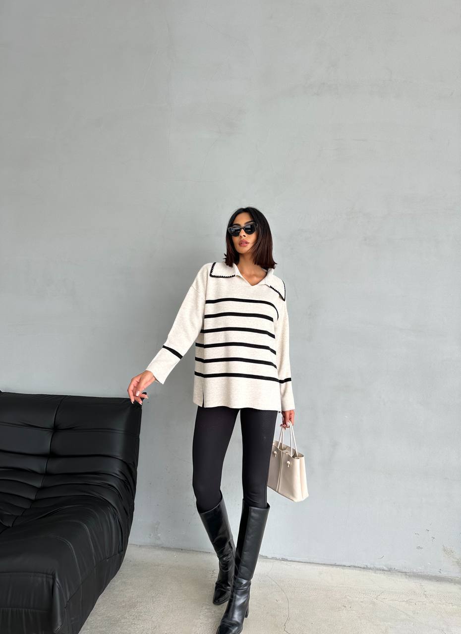 Жіночий Смугастий Молочний Светр Оверсайз з Широким Коміром Поло
