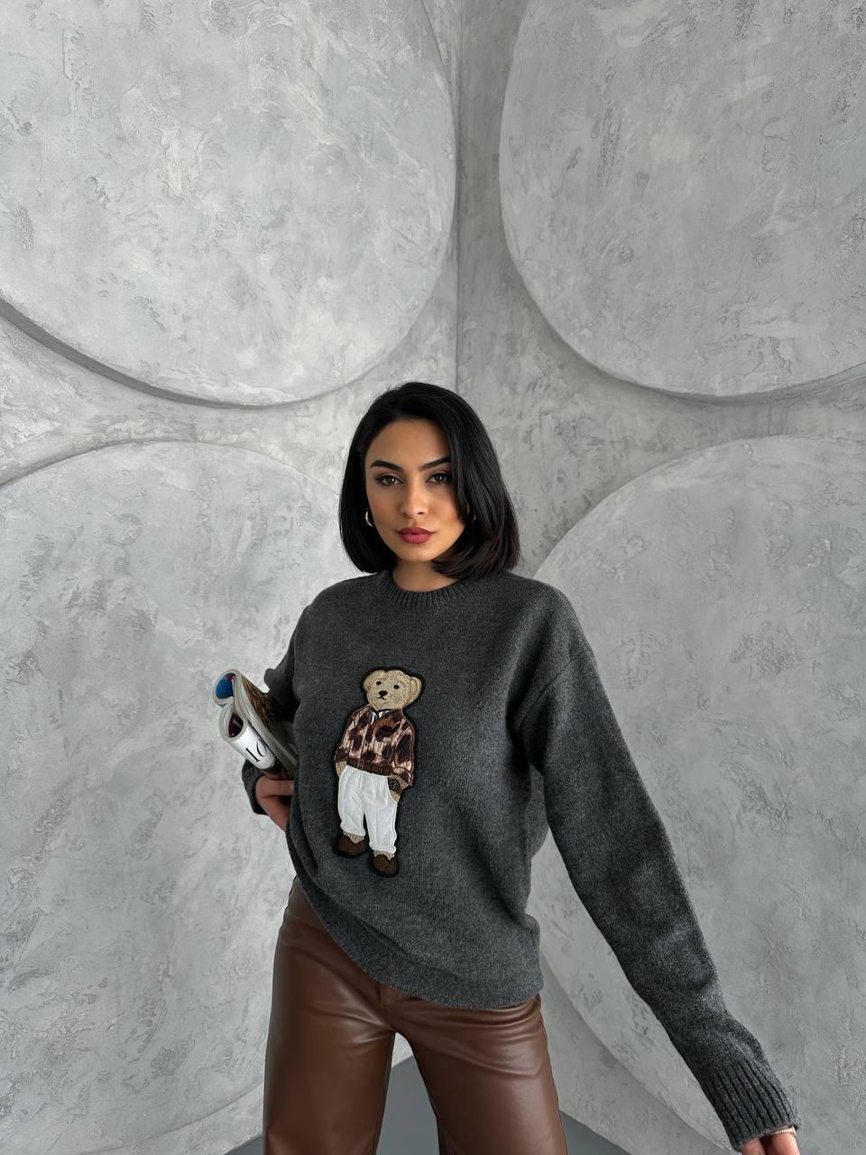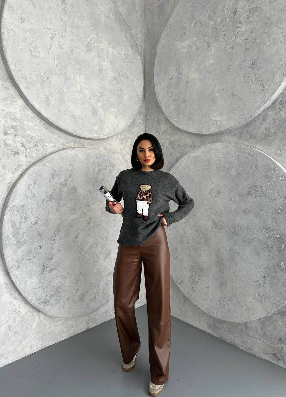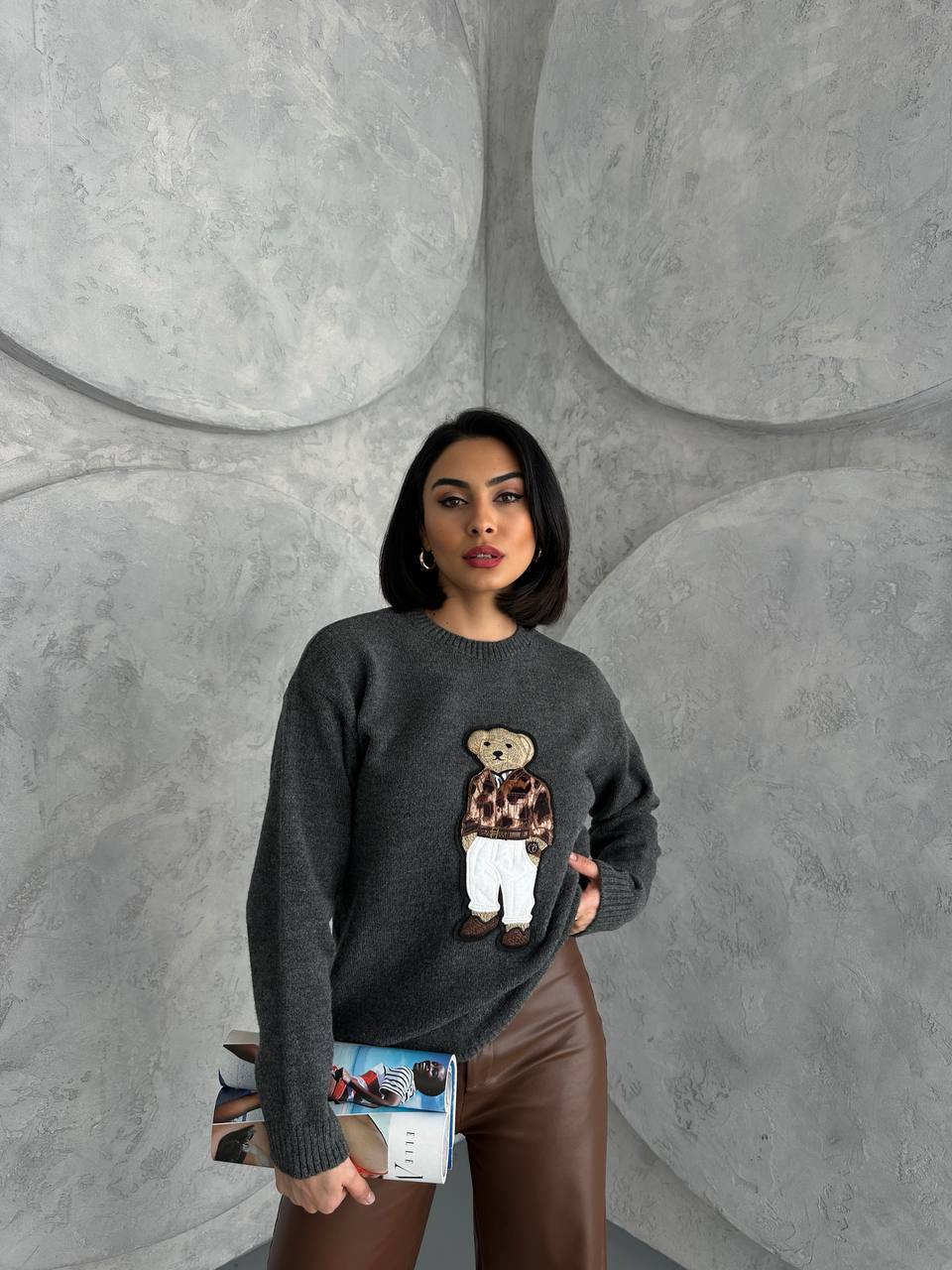 Жіночий Темно-Сірий Светр Вільного Крою з Нашивкою Вишивкою Ведмедиком