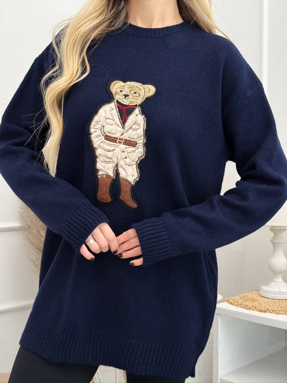 Жіночий Темно-Синій Светр Вільного Крою з Нашивкою Вишивкою Ведмедиком