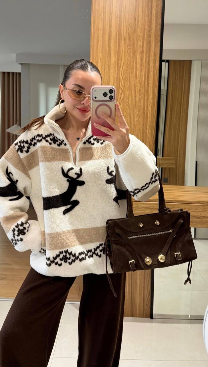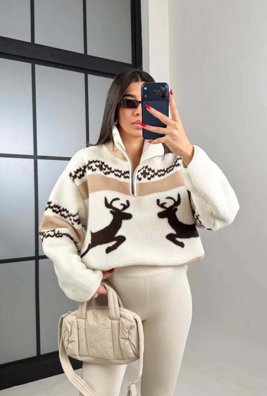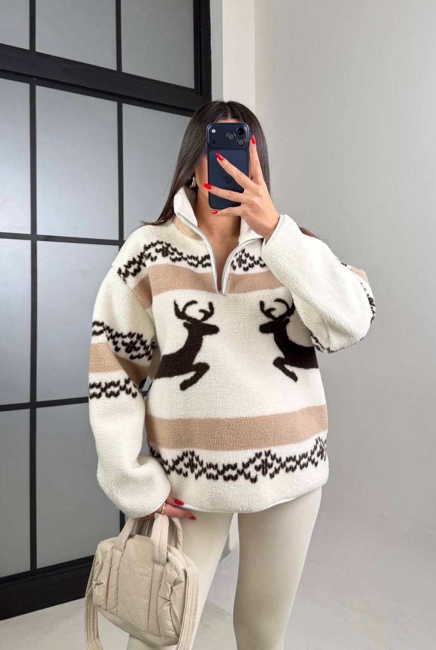 Жіночий Теплий Молочний Светр Бомбер Оверсайз з Принтом Олені