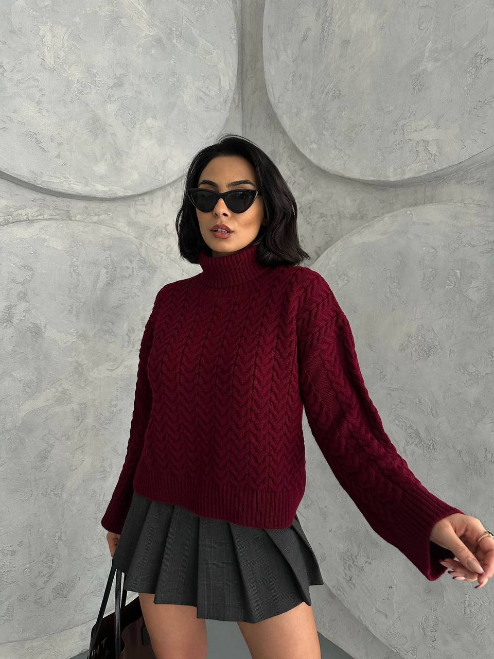 Жіночий Теплий В’язаний Бордовий Светр під Горло з Фактурним Візерунком Косичка