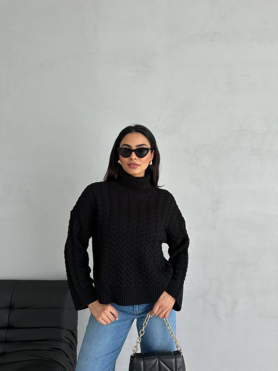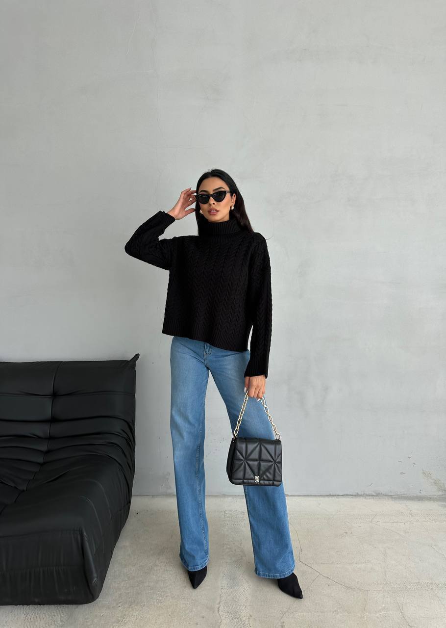 Жіночий Теплий В’язаний Чорний Светр під Горло з Фактурним Візерунком Косичка