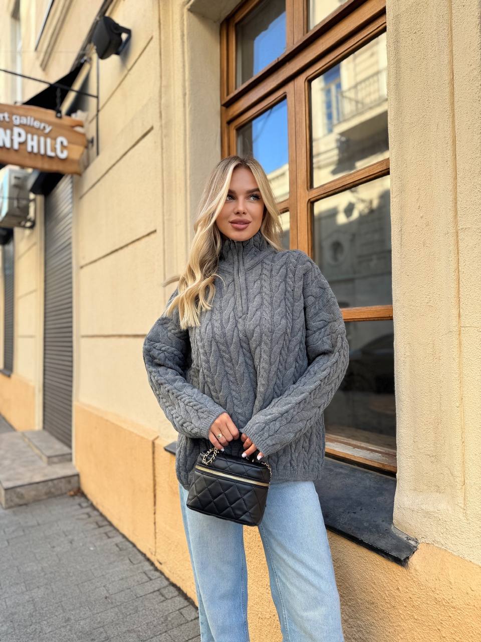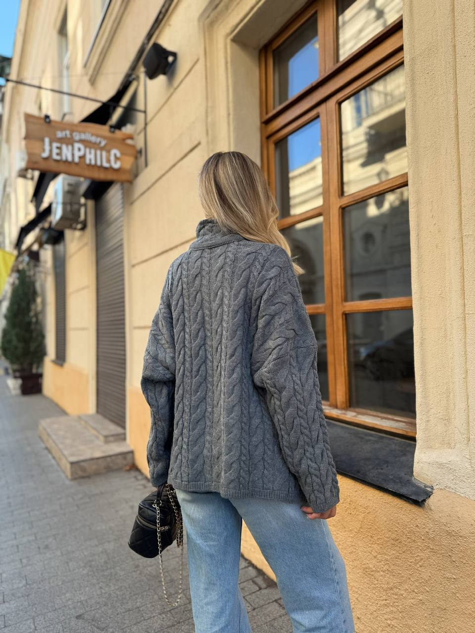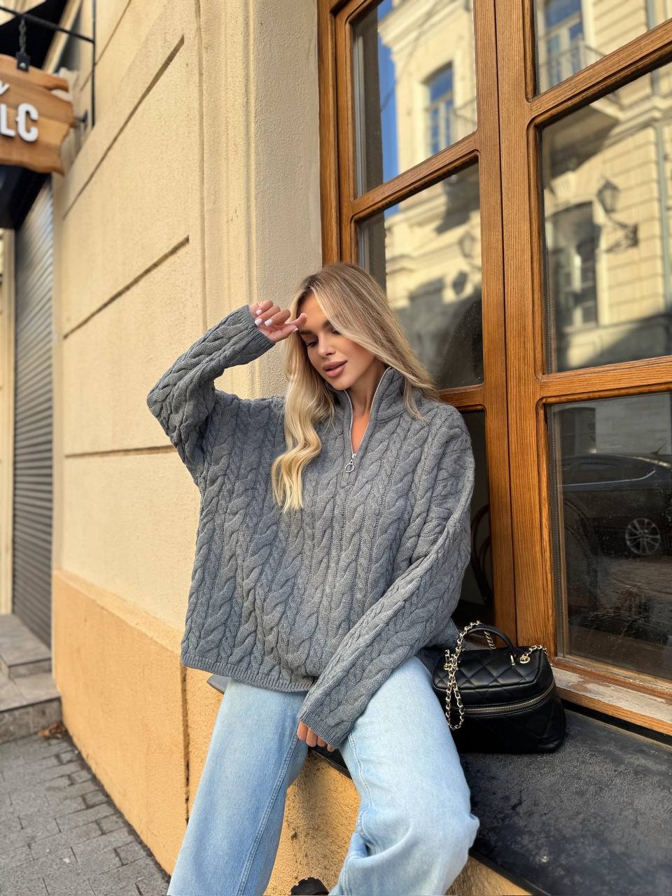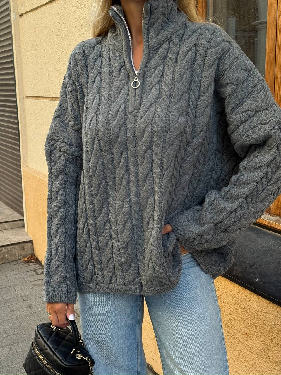 Жіночий Теплий В’язаний Графітовий Светр під Горло з Фактурним Візерунком Косичка