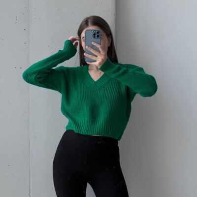 Жіночий Укорочений Синій Светр Оверсайз Об’ємної В’язки з Високим Коміром і Подовженими Рукавами